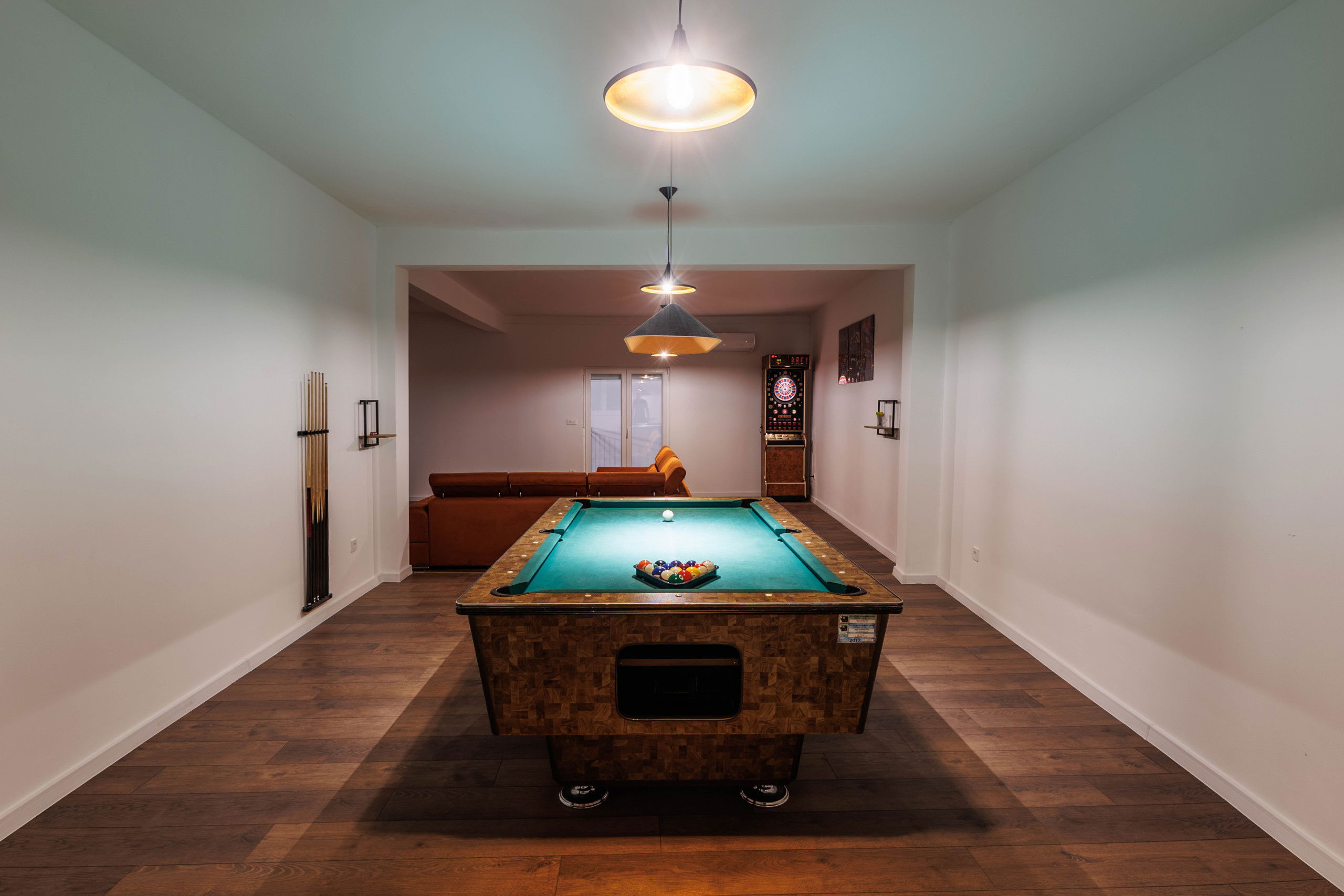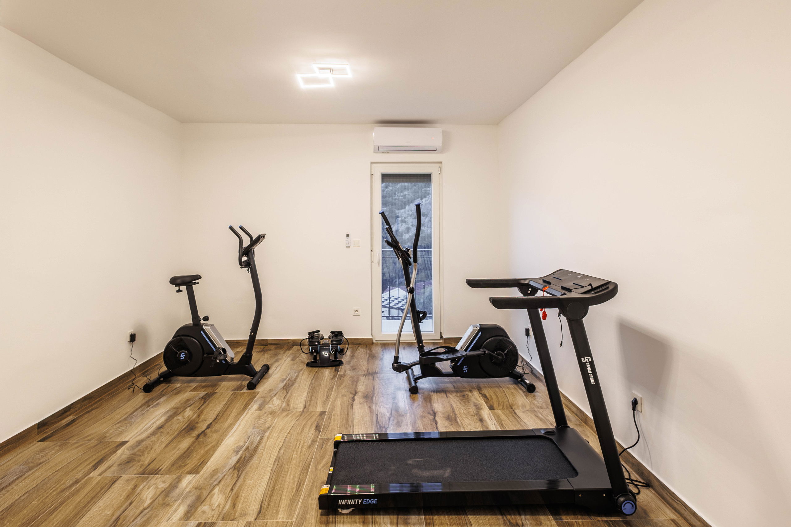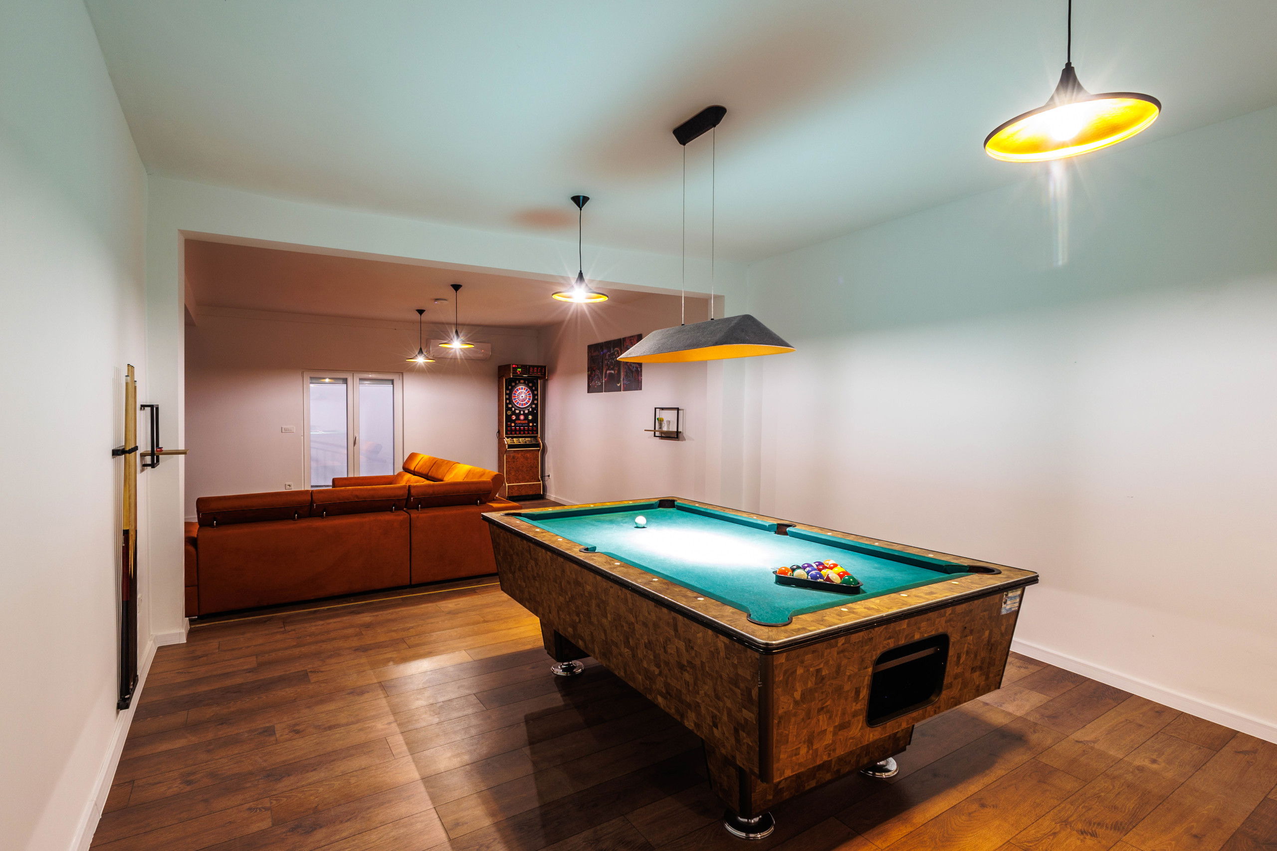 The interior is thoughtfully arranged across two levels. The ground floor hosts three bedrooms, a dining area, and a fully equipped entertainment zone including a playroom. On the upper floor, guests will find two additional bedrooms, a fully equipped kitchen, a stylish living room, a terrace with beautiful views, and a private fitness gym.
