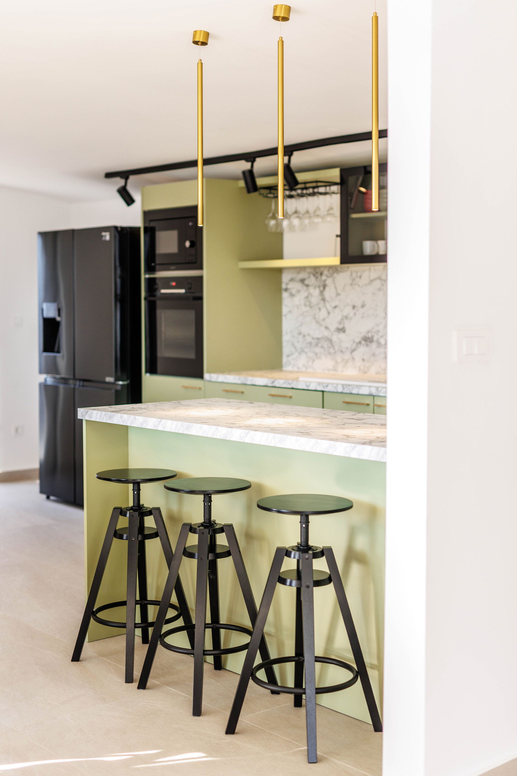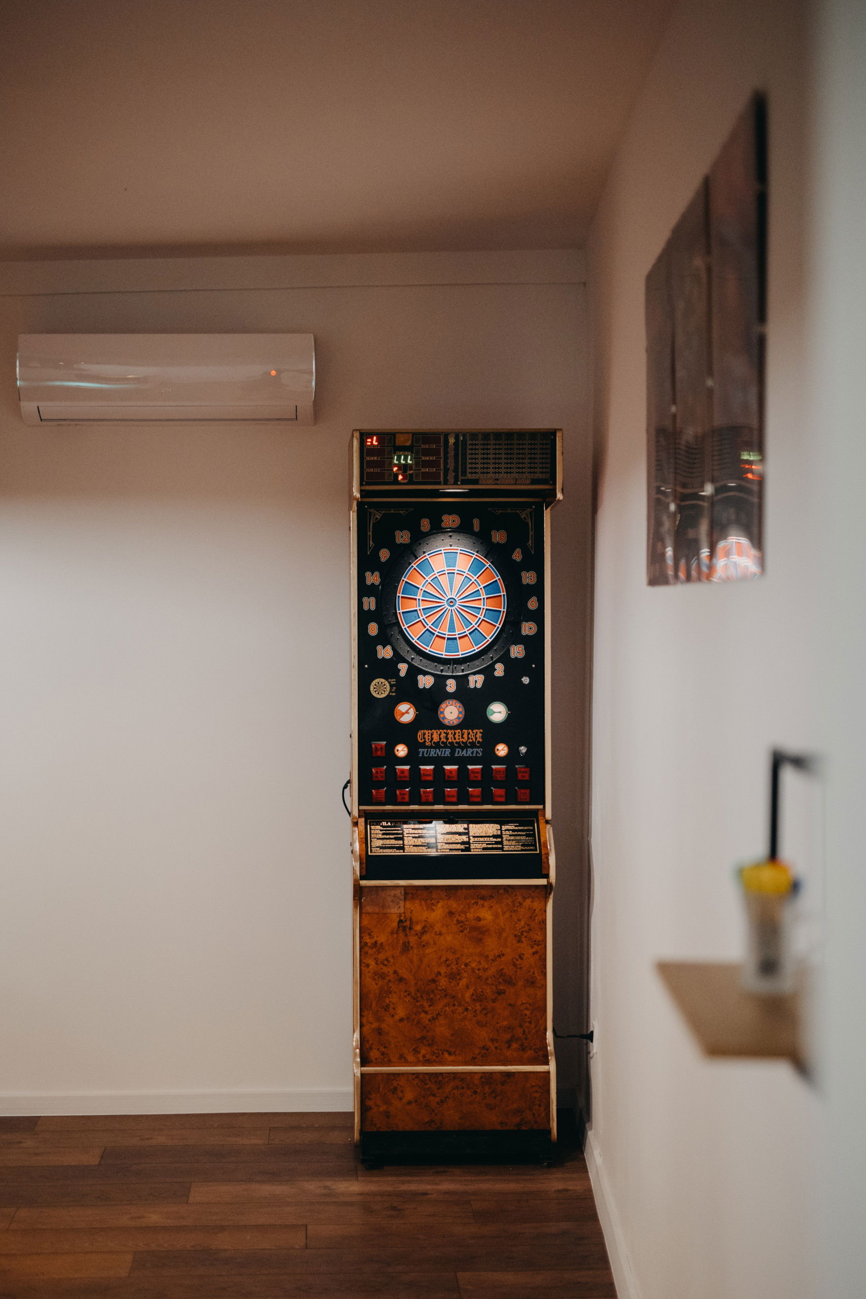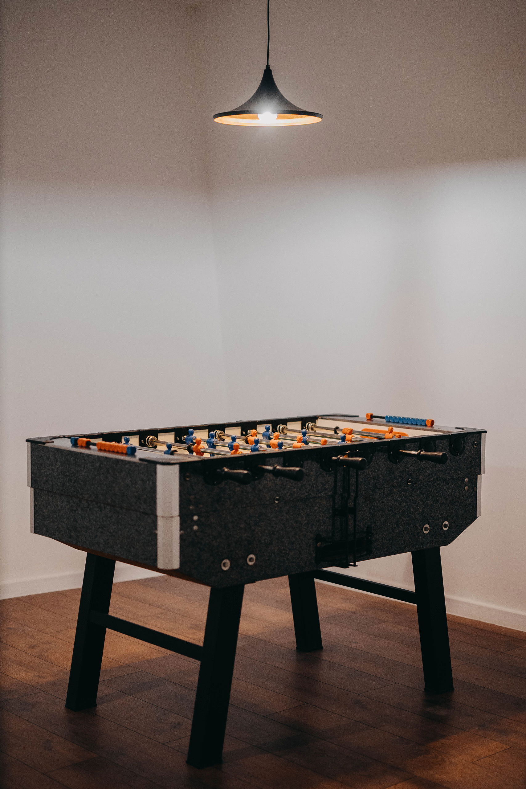 The interior is thoughtfully arranged across two levels. The ground floor hosts three bedrooms, a dining area, and a fully equipped entertainment zone including a playroom. On the upper floor, guests will find two additional bedrooms, a fully equipped kitchen, a stylish living room, a terrace with beautiful views, and a private fitness gym.
