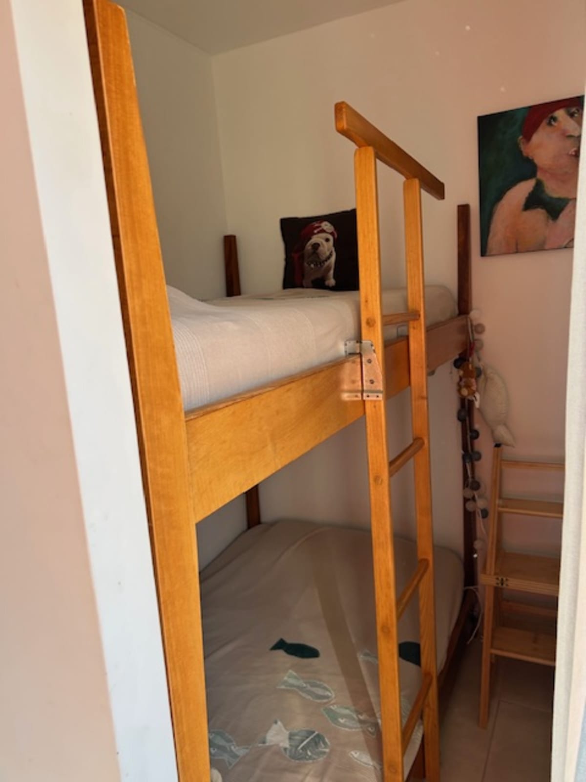Il se compose d'une entrée donnant sur le salon avec cuisine américaine toute équipée, d'une grande chambre avec lit en 160 et grand placard, d'un coin nuit avec lits superposés,