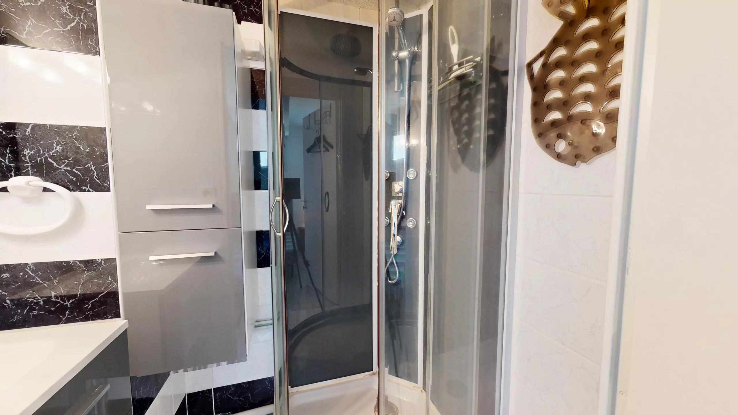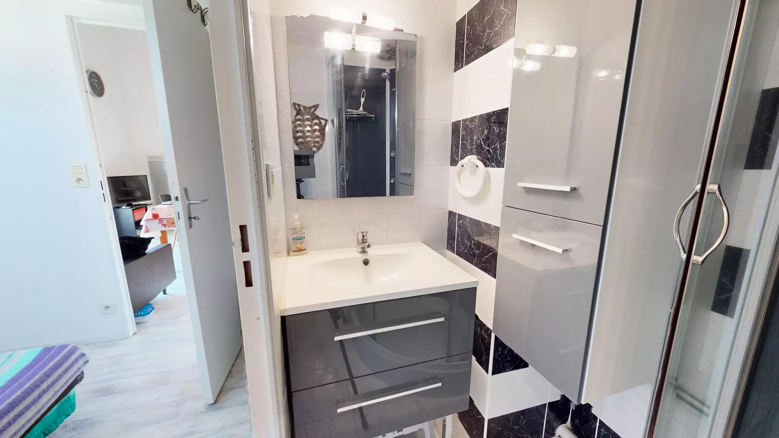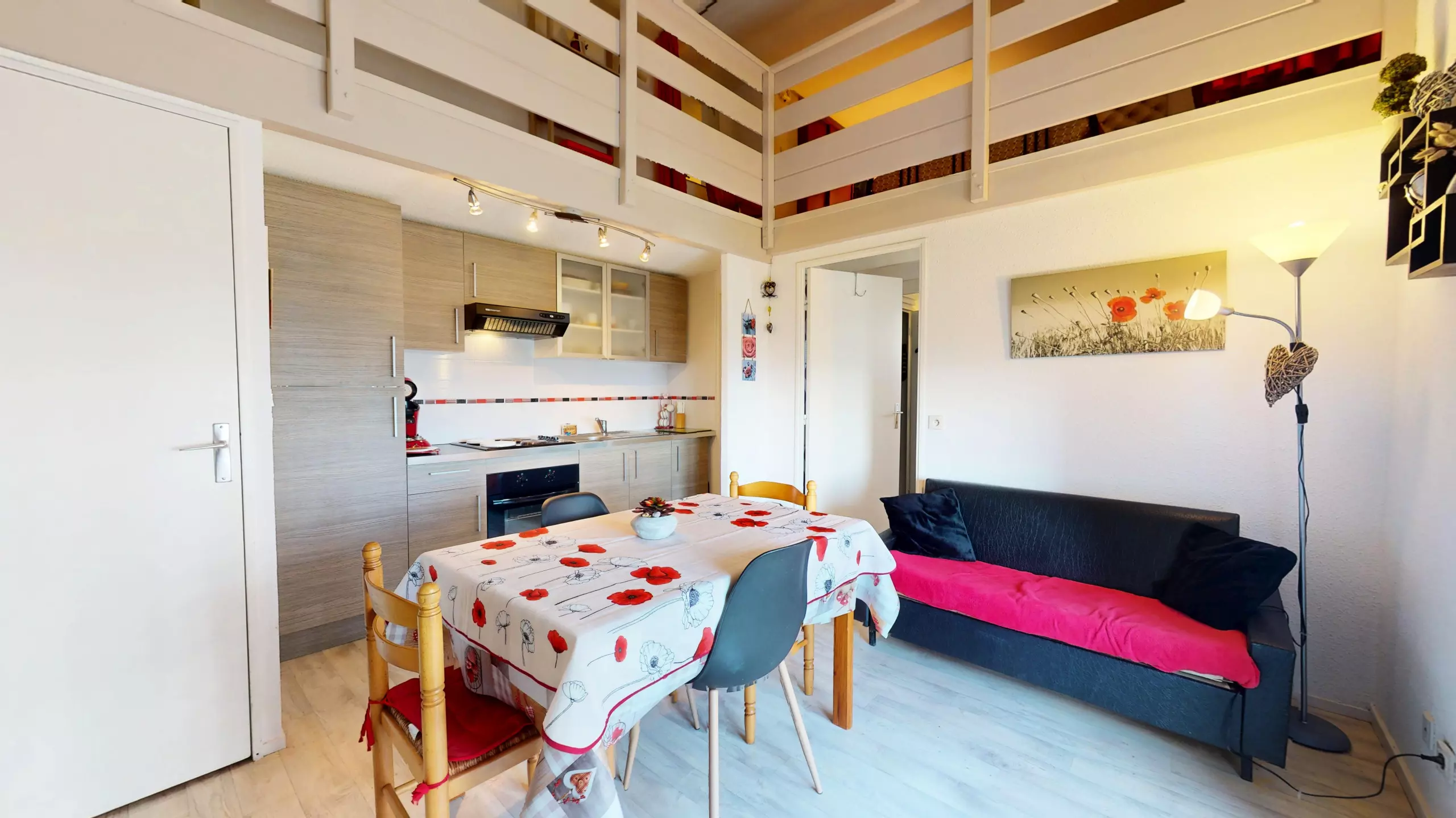 The apartment is distinguished by its spacious and modern layout. The main living area, the true heart of the apartment, offers a welcoming lounge with a television and a convivial dining table perfect for four people to share meals. The open-plan kitchen, fully equipped with electric hobs and all necessary cookware, allows you to prepare your favorite local specialties with ease. For sleeping, you'll enjoy a separate bedroom with a double bed (140x190 cm) and its own modern en-suite shower room, as well as a large mezzanine upstairs with a second sitting area and another double bed (140x190 cm).