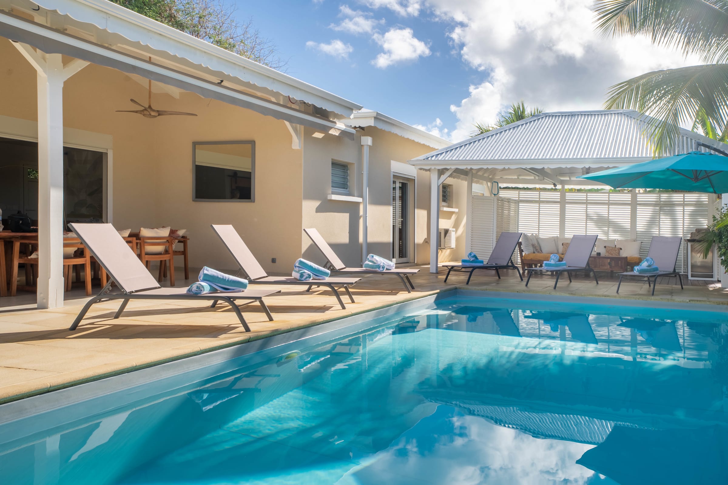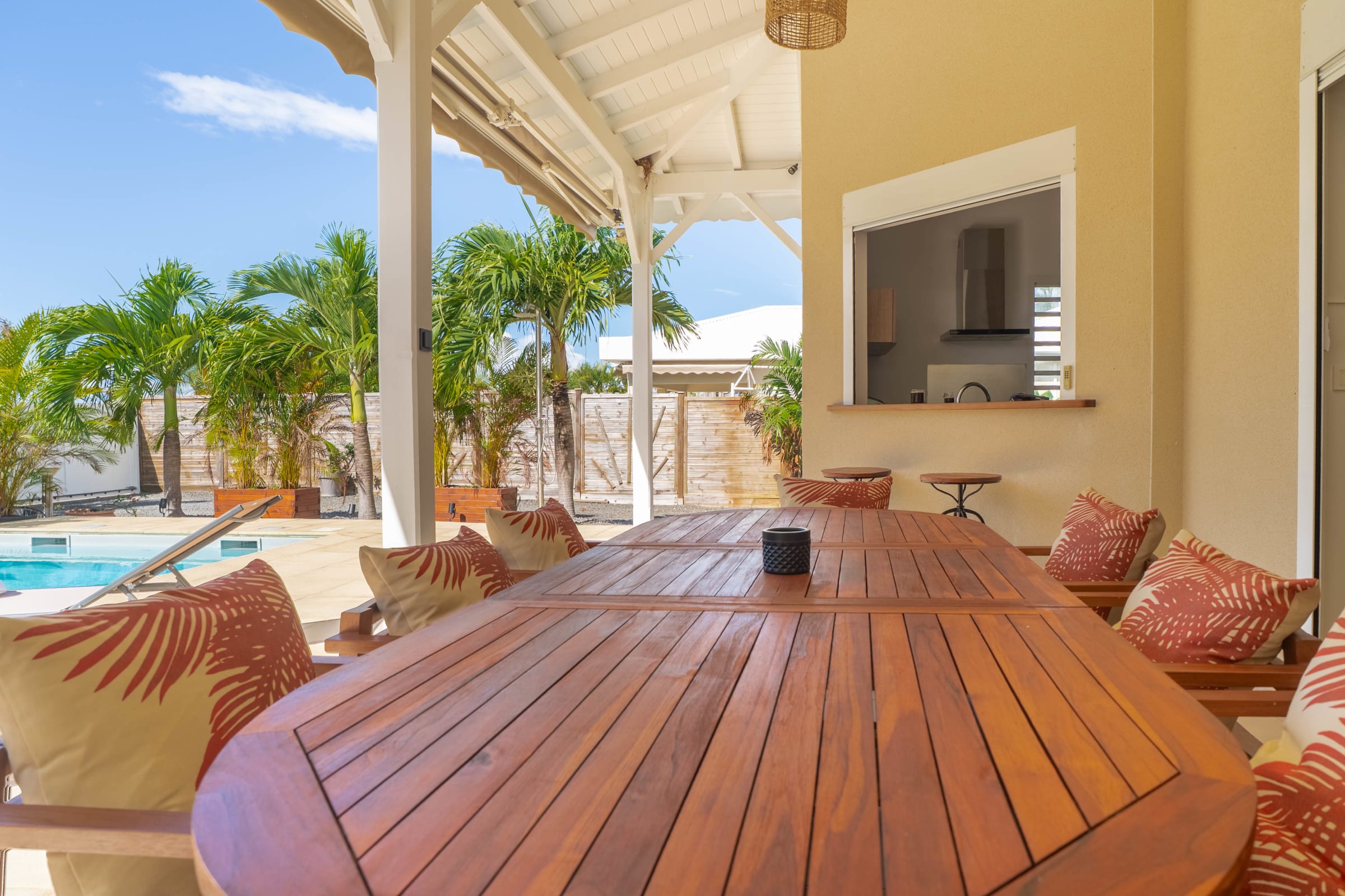 Villa Ti Palm is located in the popular town of Saint-François, on the beautiful Grande-Terre island of Guadeloupe. Just a 45-minute drive from Pointe-à-Pitre Airport, this charming location puts you right next to the town center, which is less than 10 minutes away. There you’ll find all the essential amenities: supermarkets, bakeries, pharmacies, and an authentic market where you can discover local flavors.