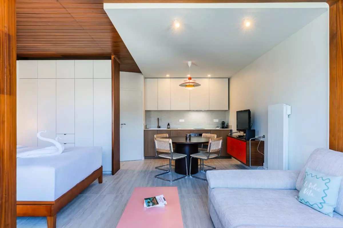 The living space includes a sleeping area inviting rest, where you will find a 160x190 double bed for peaceful nights.