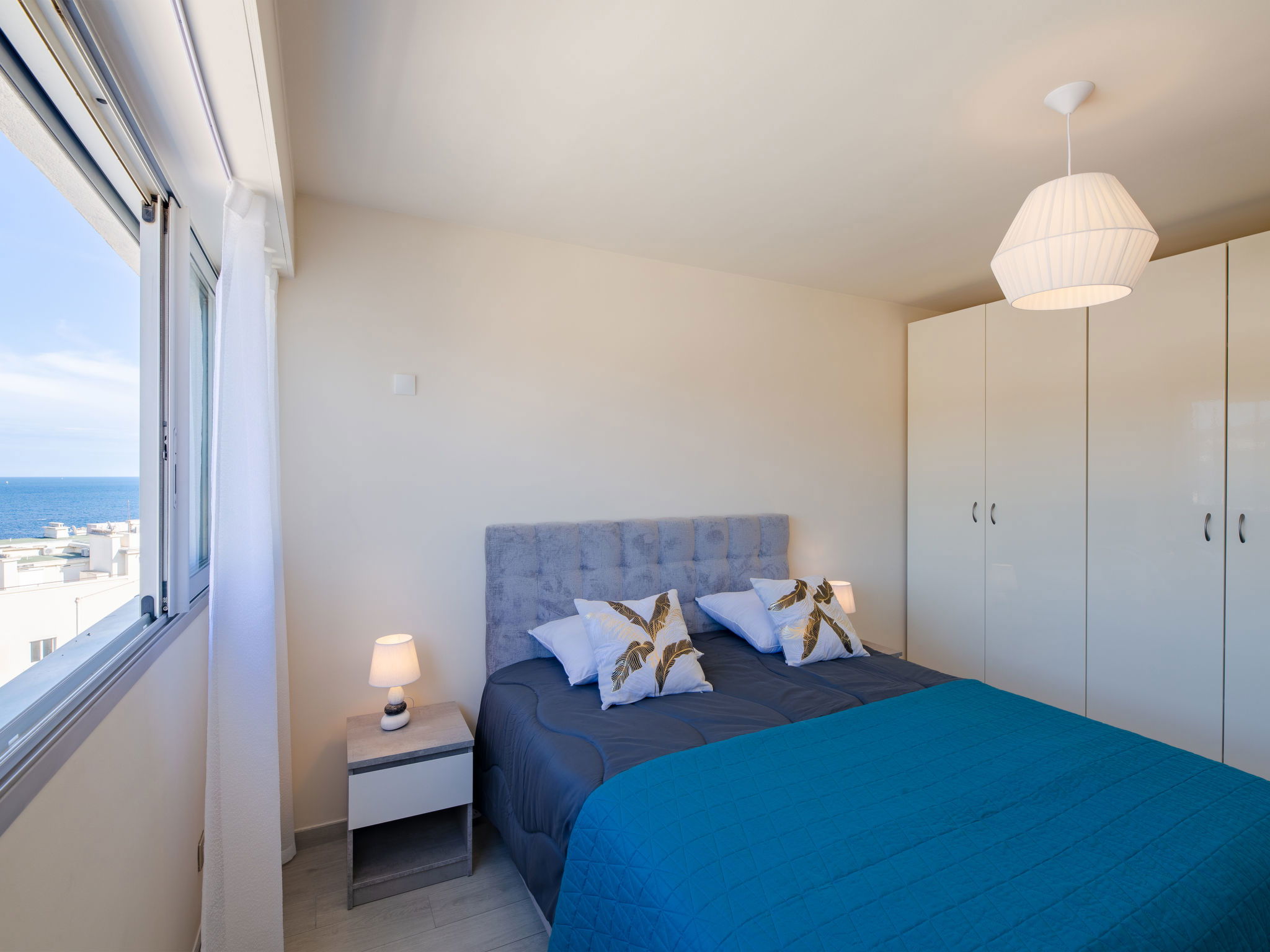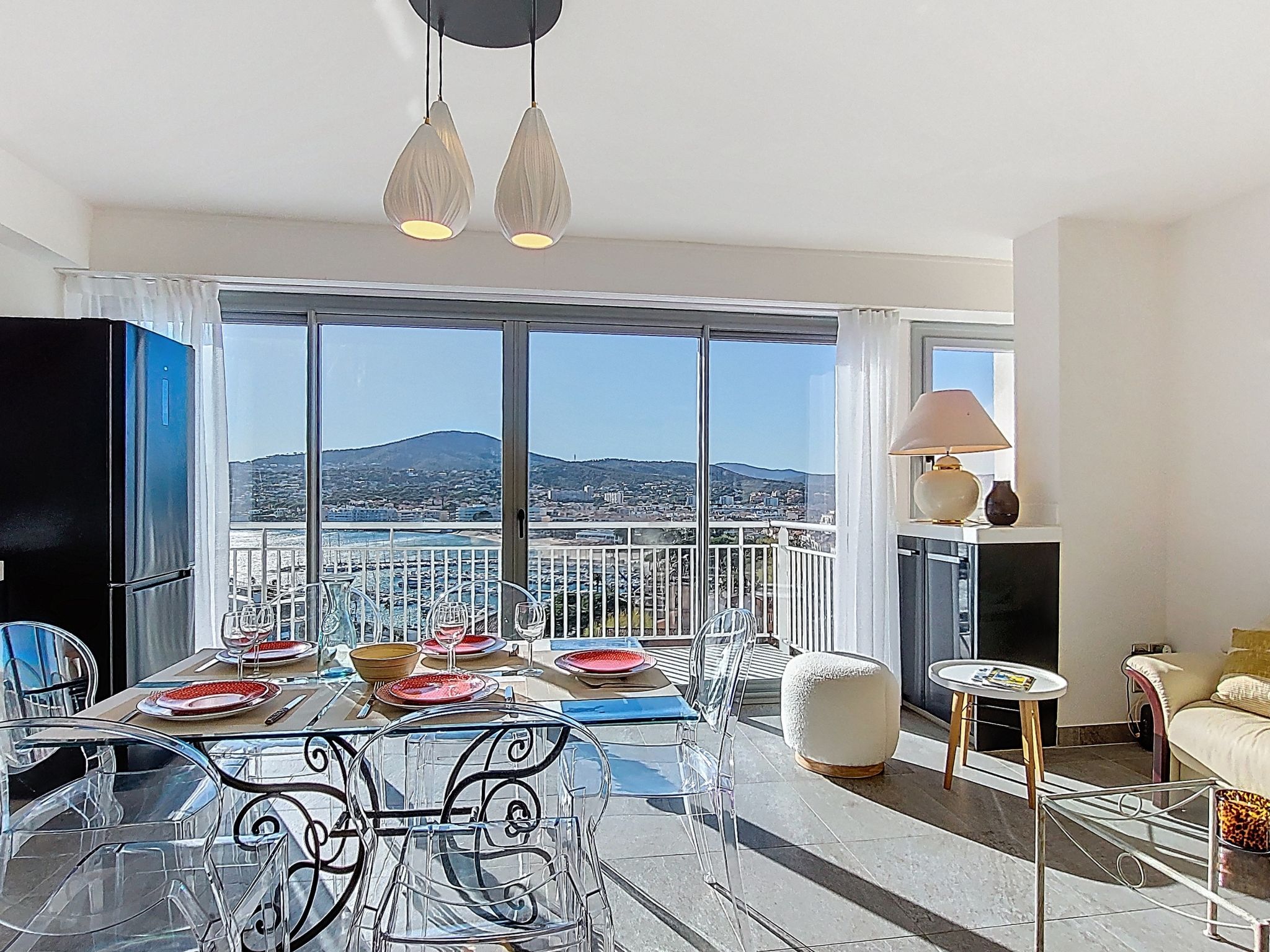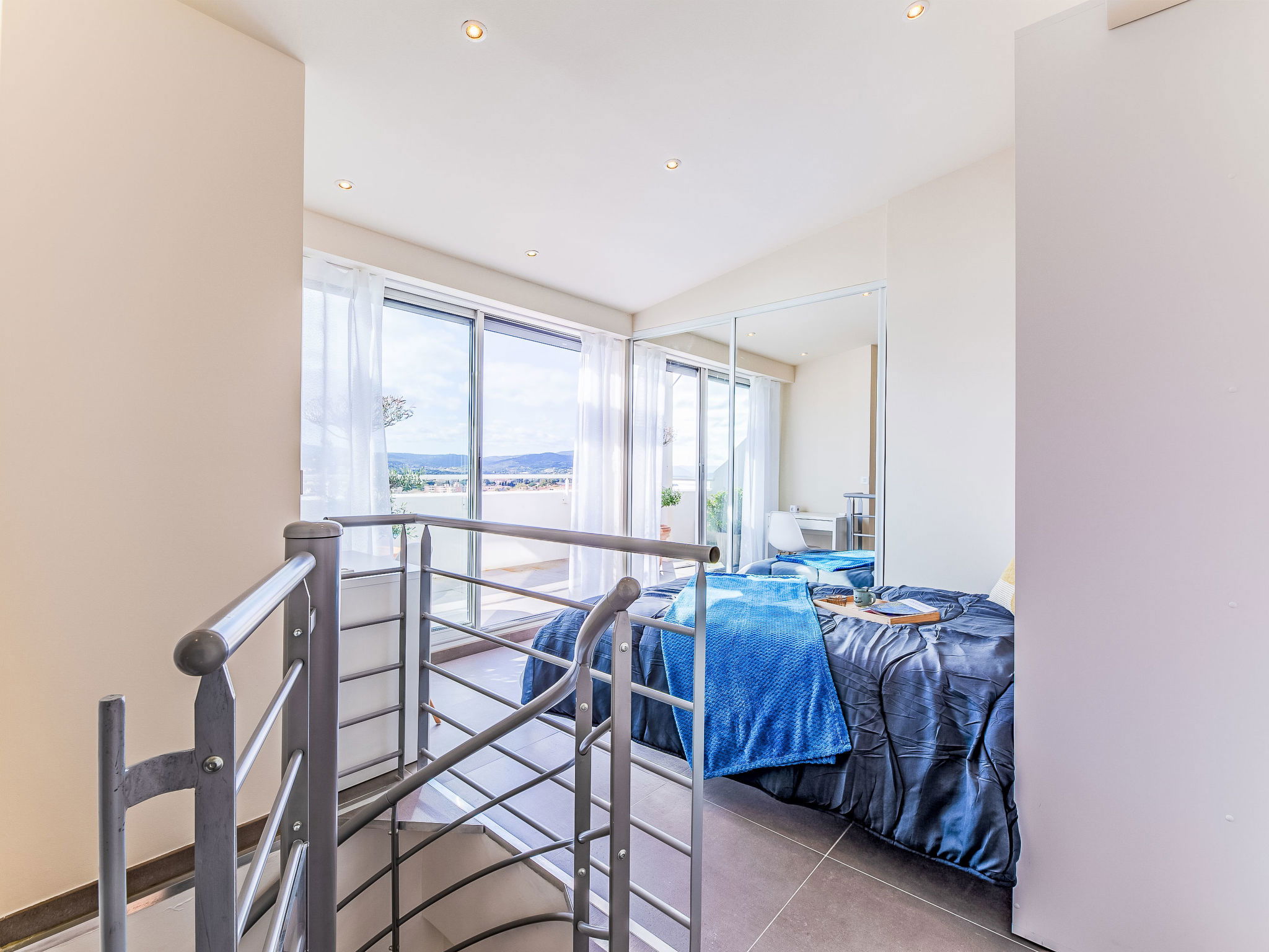 4-room maisonette 86 m2 on 10th floor, north-west facing position. Bright, fully renovated, modern furnishings: entrance hall. Living/dining room, west facing position with TV (flat screen). Exit to the balcony. 1 room, north facing position with 1 french bed (1 x 160 cm, length 200 cm). 1 room, north facing position with 2 beds (90 cm, length 200 cm). Open kitchen (oven, dishwasher, 4 induction hot plates, toaster, kettle, microwave, freezer, electric coffee machine). Shower, sep. WC. Air-conditioning, forced-air heating. Upper floor: (spiral staircase), 1 room, west facing position with 1 fold-away bed (120 cm, length 200 cm), shower. Exit to the terrace. Balcony 9 m2, west facing position, large balcony 47 m2, north-west facing position. Balcony furniture. Marvellous panoramic view of the sea and the town. Facilities: washing machine, iron, hair dryer. Internet (WiFi, free). Parking space n 595 (1 car). Please note: non-smokers only. Smoke alarm. Accommodation not suitable for PRM People with reduced mobility. Offer by a commercial proprietor according to Art. 155, IV, CGI 83115006050HT