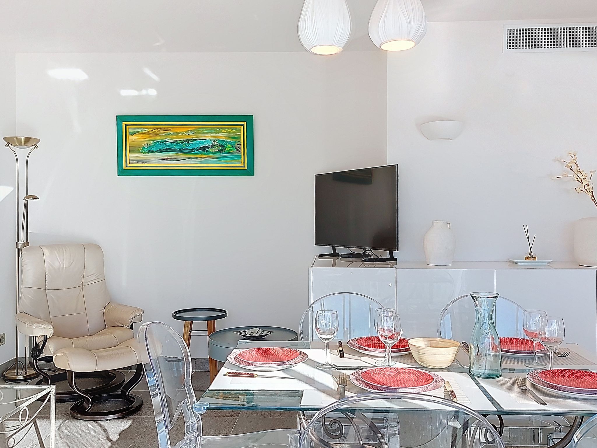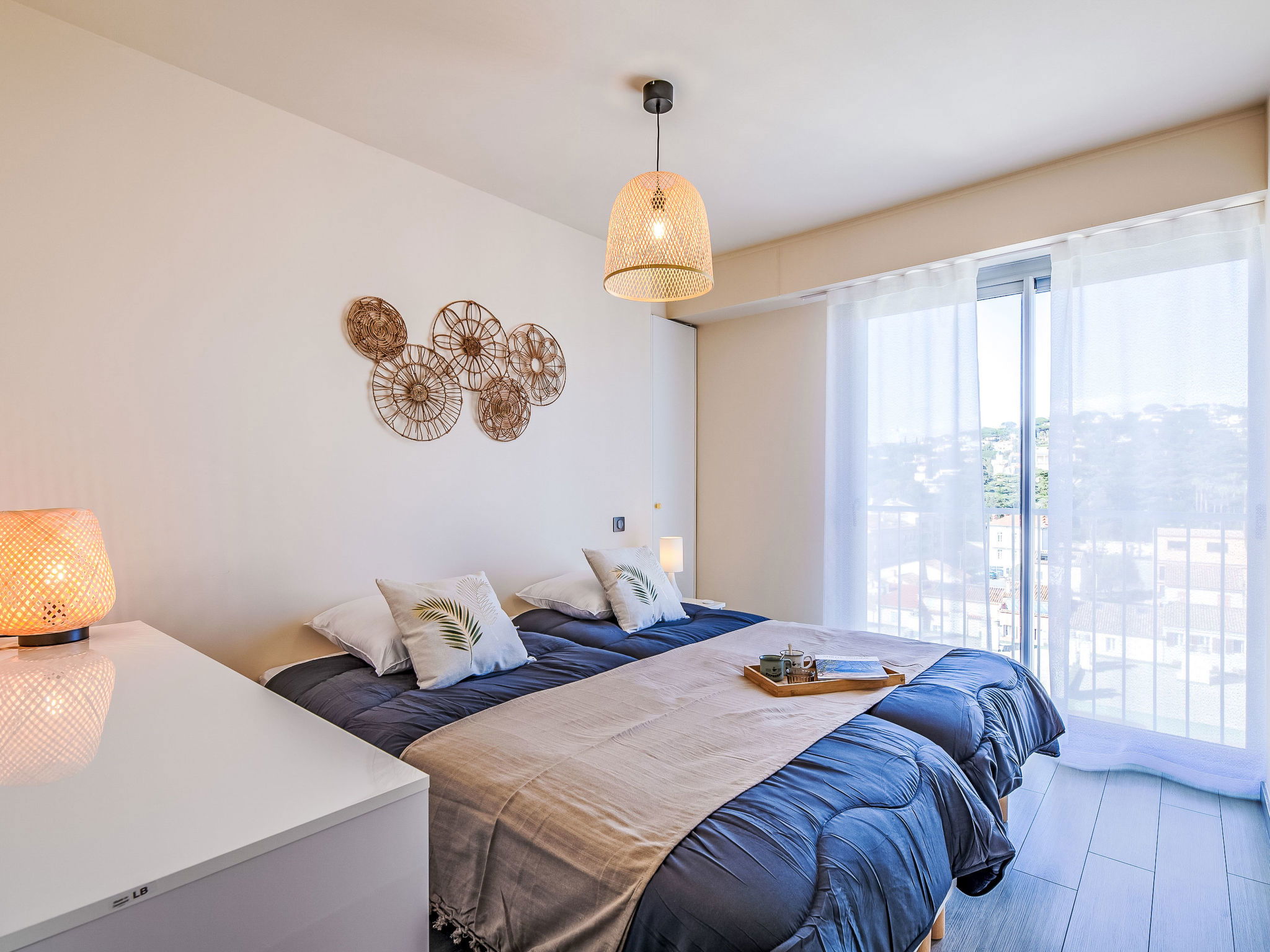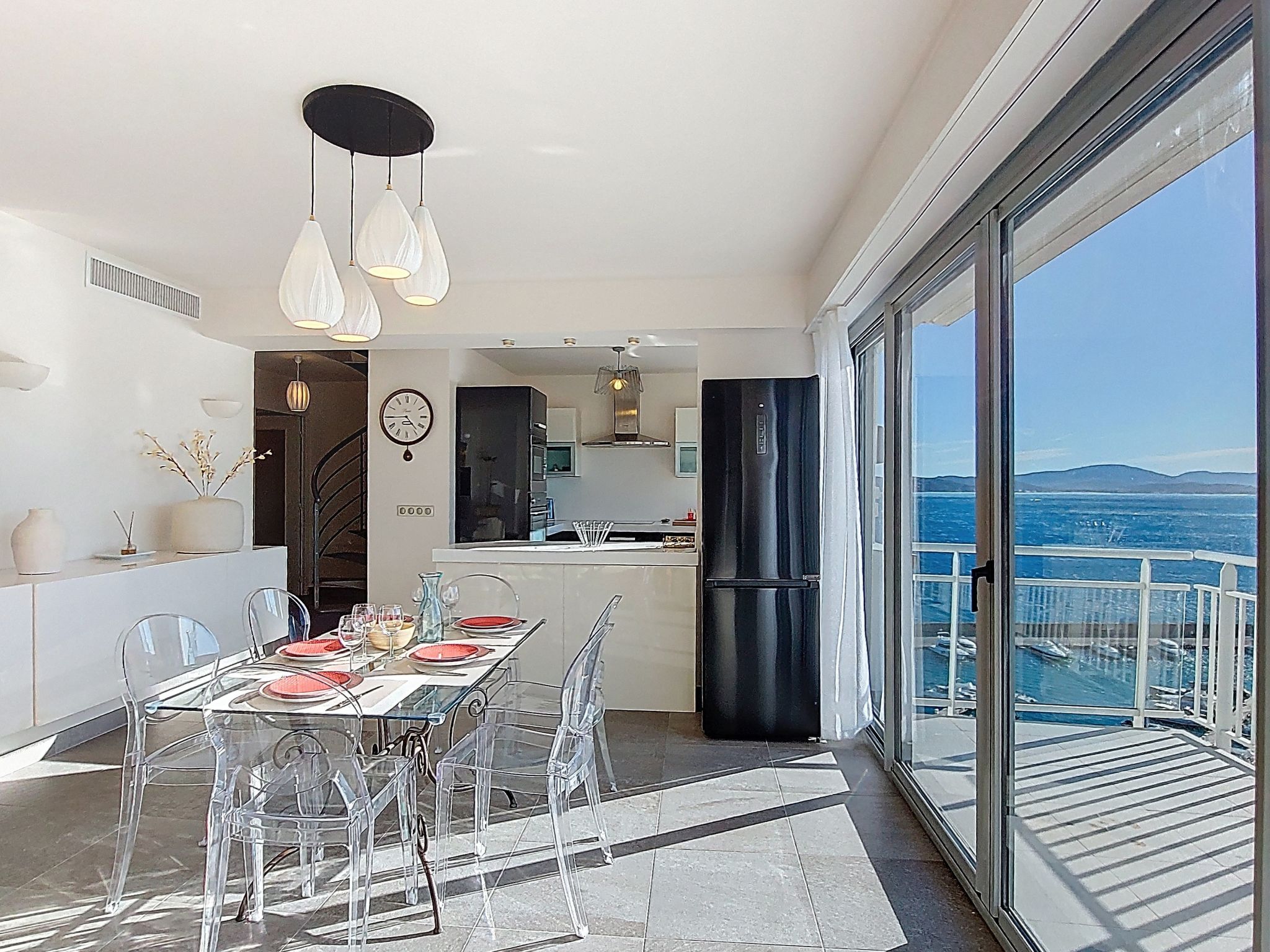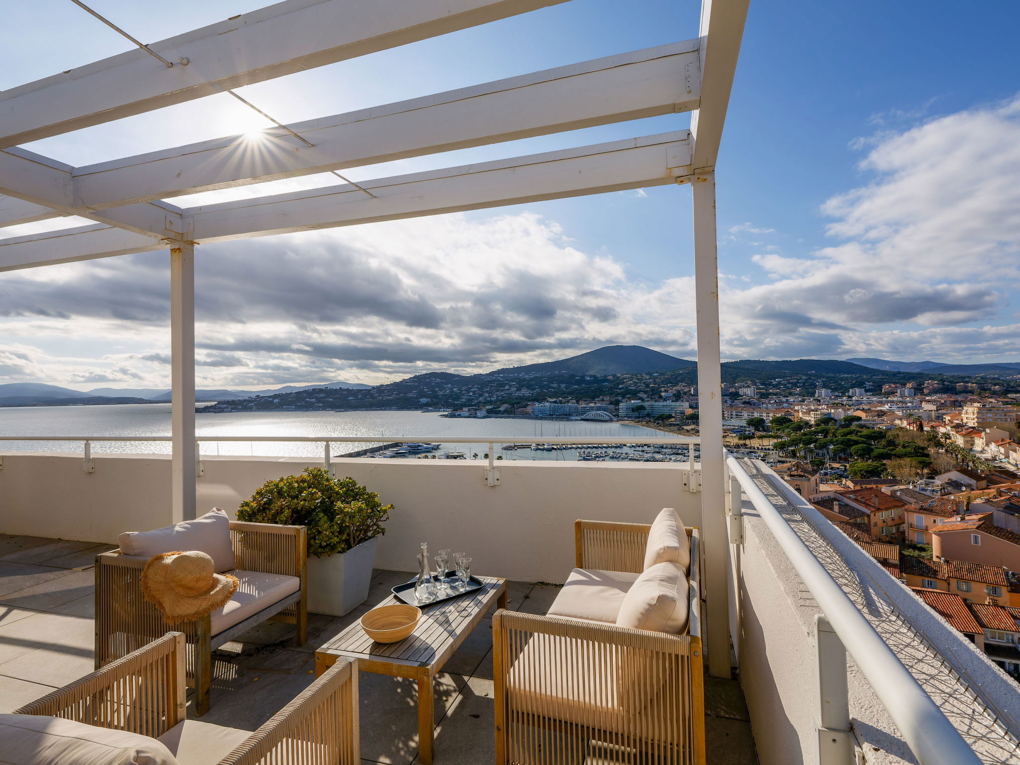 4-room maisonette 86 m2 on 10th floor, north-west facing position. Bright, fully renovated, modern furnishings: entrance hall. Living/dining room, west facing position with TV (flat screen). Exit to the balcony. 1 room, north facing position with 1 french bed (1 x 160 cm, length 200 cm). 1 room, north facing position with 2 beds (90 cm, length 200 cm). Open kitchen (oven, dishwasher, 4 induction hot plates, toaster, kettle, microwave, freezer, electric coffee machine). Shower, sep. WC. Air-conditioning, forced-air heating. Upper floor: (spiral staircase), 1 room, west facing position with 1 fold-away bed (120 cm, length 200 cm), shower. Exit to the terrace. Balcony 9 m2, west facing position, large balcony 47 m2, north-west facing position. Balcony furniture. Marvellous panoramic view of the sea and the town. Facilities: washing machine, iron, hair dryer. Internet (WiFi, free). Parking space n 595 (1 car). Please note: non-smokers only. Smoke alarm. Accommodation not suitable for PRM People with reduced mobility. Offer by a commercial proprietor according to Art. 155, IV, CGI 83115006050HT
