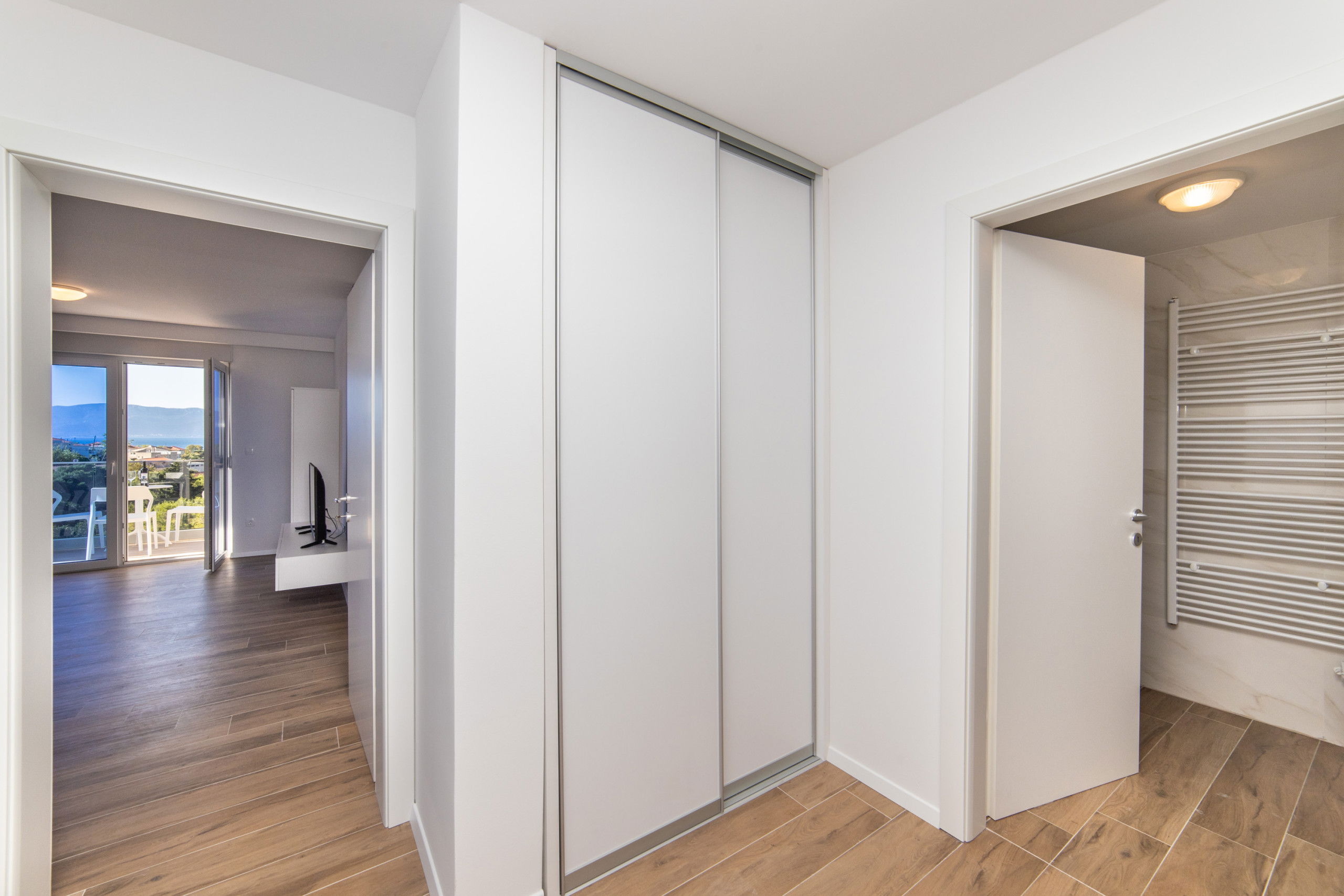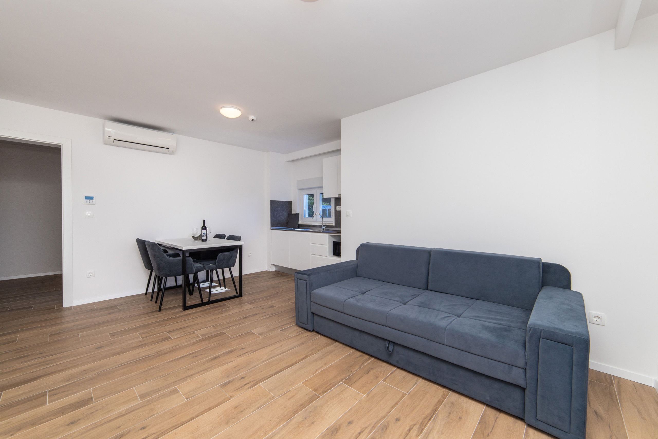 The apartment (46 m2) is functionally arranged and provides everything you need for a comfortable stay - a fully equipped kitchen, a comfortable sleeping and living area, as well as a private bathroom with a shower. Thanks to its practical layout and pleasant ambiance, it is perfect for couples or individuals. It can accommodate a maximum of 4 people, who will use 1 double bed in the bedroom and 1 sofa bed for two people in the living room. Each apartment/studio has a sea view and a balcony with a seating area.