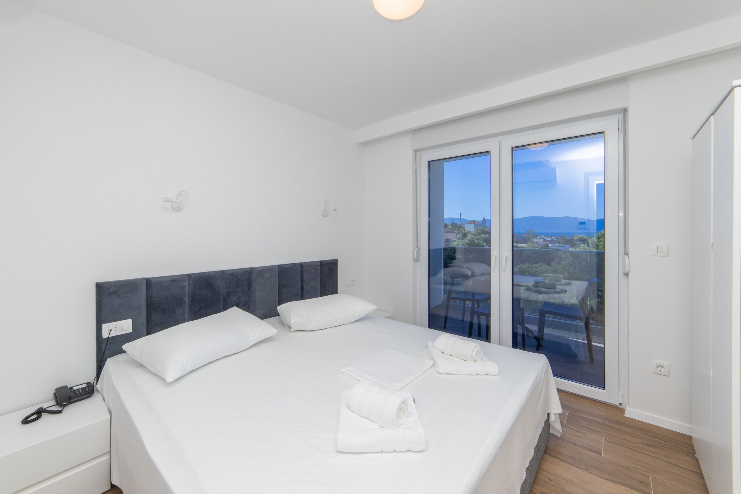 The apartment (46 m2) is functionally arranged and provides everything you need for a pleasant stay - a fully equipped kitchen, a comfortable sleeping and living area, as well as two bathrooms with a shower, one of which is en suite. Thanks to its practical layout and pleasant ambiance, it is perfect for couples or individuals. It can accommodate a maximum of 4 people, who will use 1 double bed in the bedroom and 1 sofa bed for two people in the living room. Each apartment/studio has a sea view and a balcony with seating.