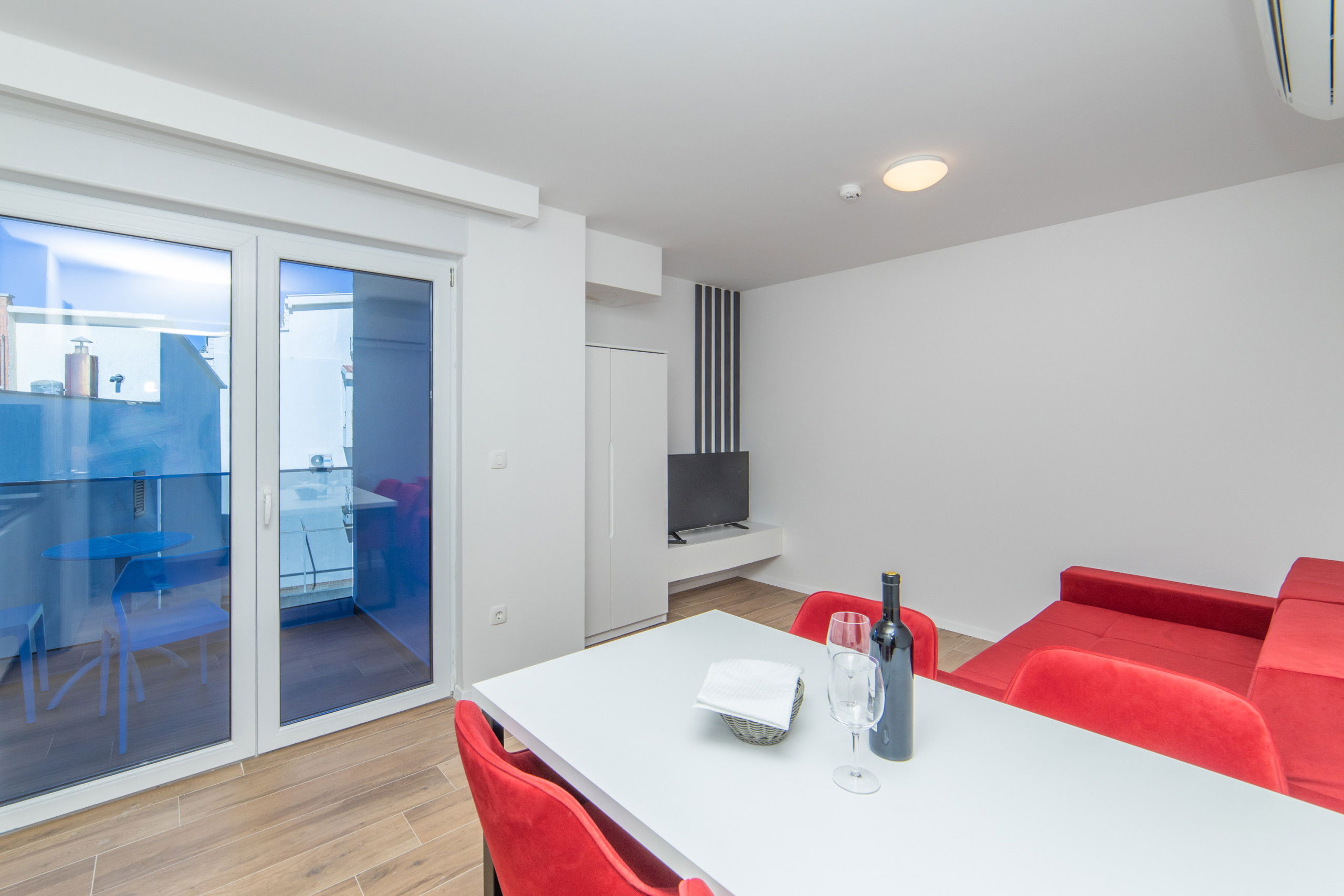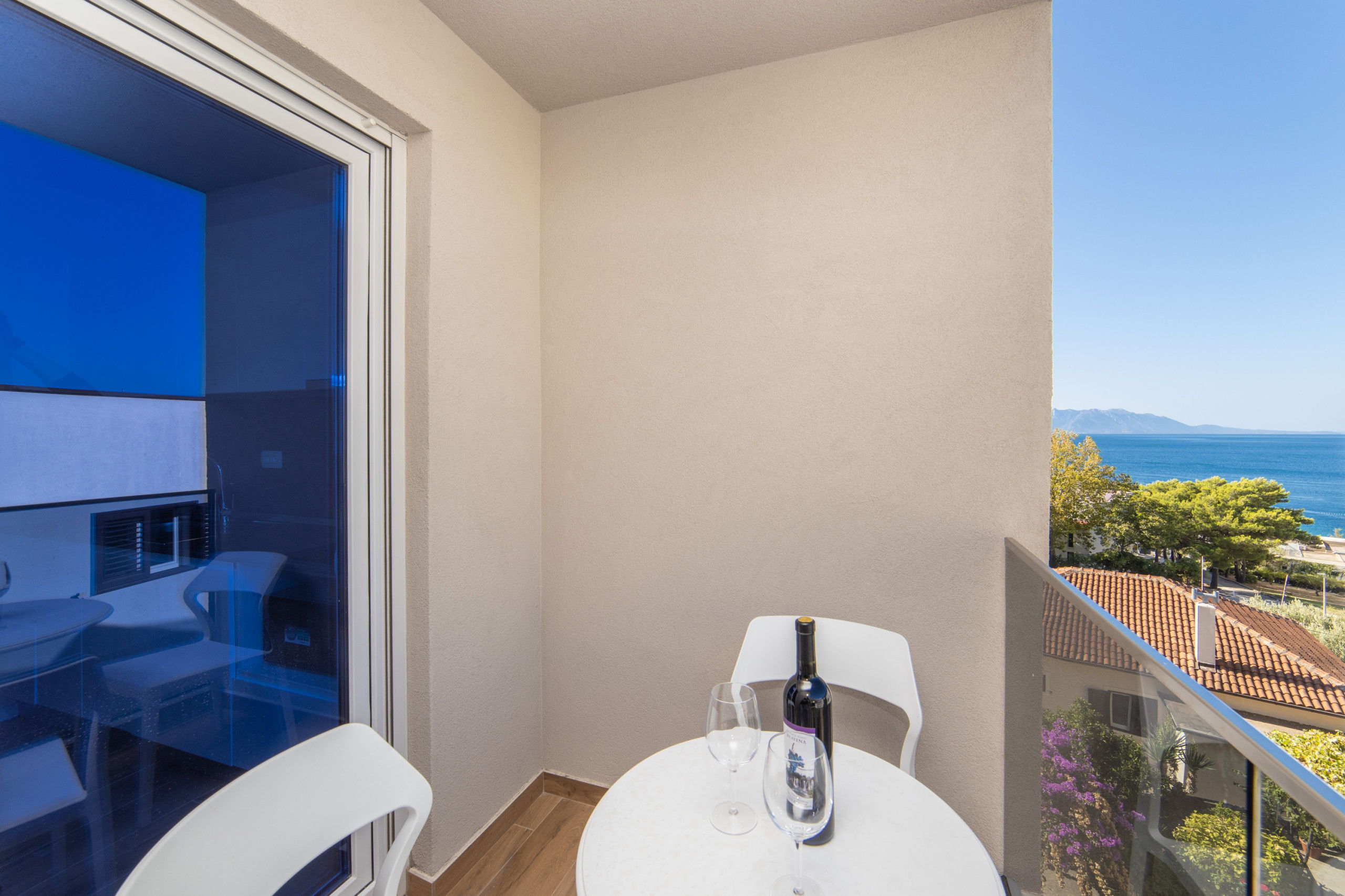 The apartment (46 m2) is functionally arranged and provides everything you need for a comfortable stay - a fully equipped kitchen, a comfortable sleeping and living area, as well as a private bathroom with a shower. Thanks to its practical layout and pleasant ambiance, it is perfect for couples or individuals. It can accommodate a maximum of 4 people, who will use 1 double bed in the bedroom and 1 sofa bed for two people in the living room. Each apartment/studio has a sea view and a balcony with a seating area.