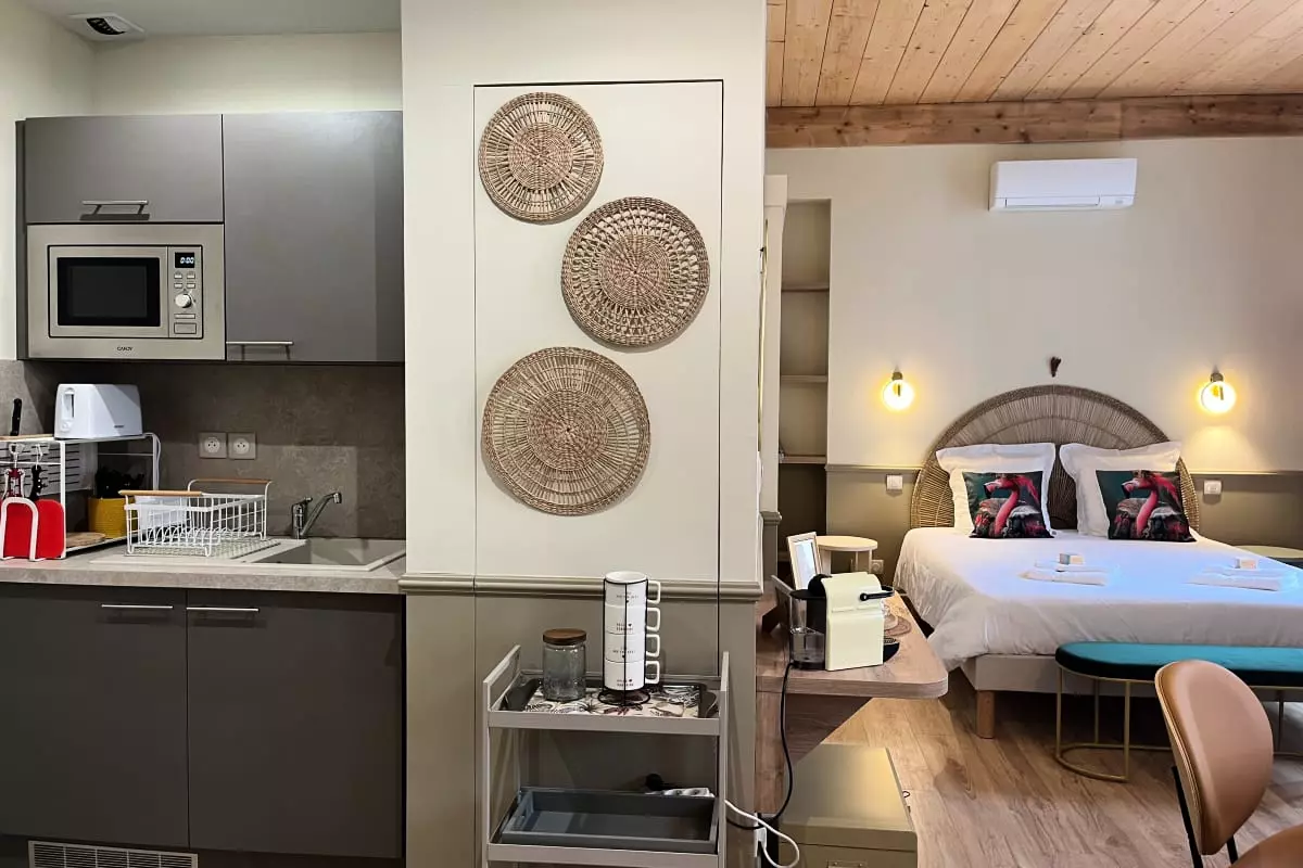In terms of amenities, everything has been designed to make your daily life easier: the kitchen has a microwave and a Nespresso machine for energizing mornings. You will also find an iron, a garment steamer, a hairdryer, and a handheld vacuum cleaner at your disposal.