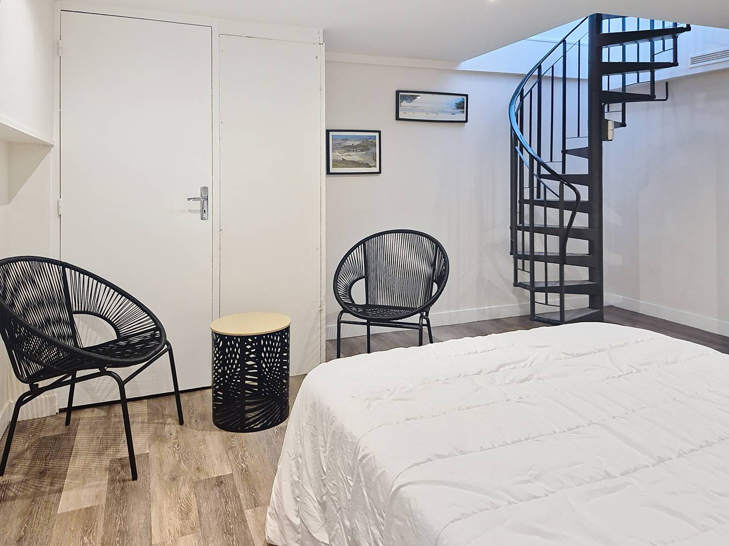- Access to the windowless bedroom in the souplex level via a spiral staircase (140 cm bed, duvet)