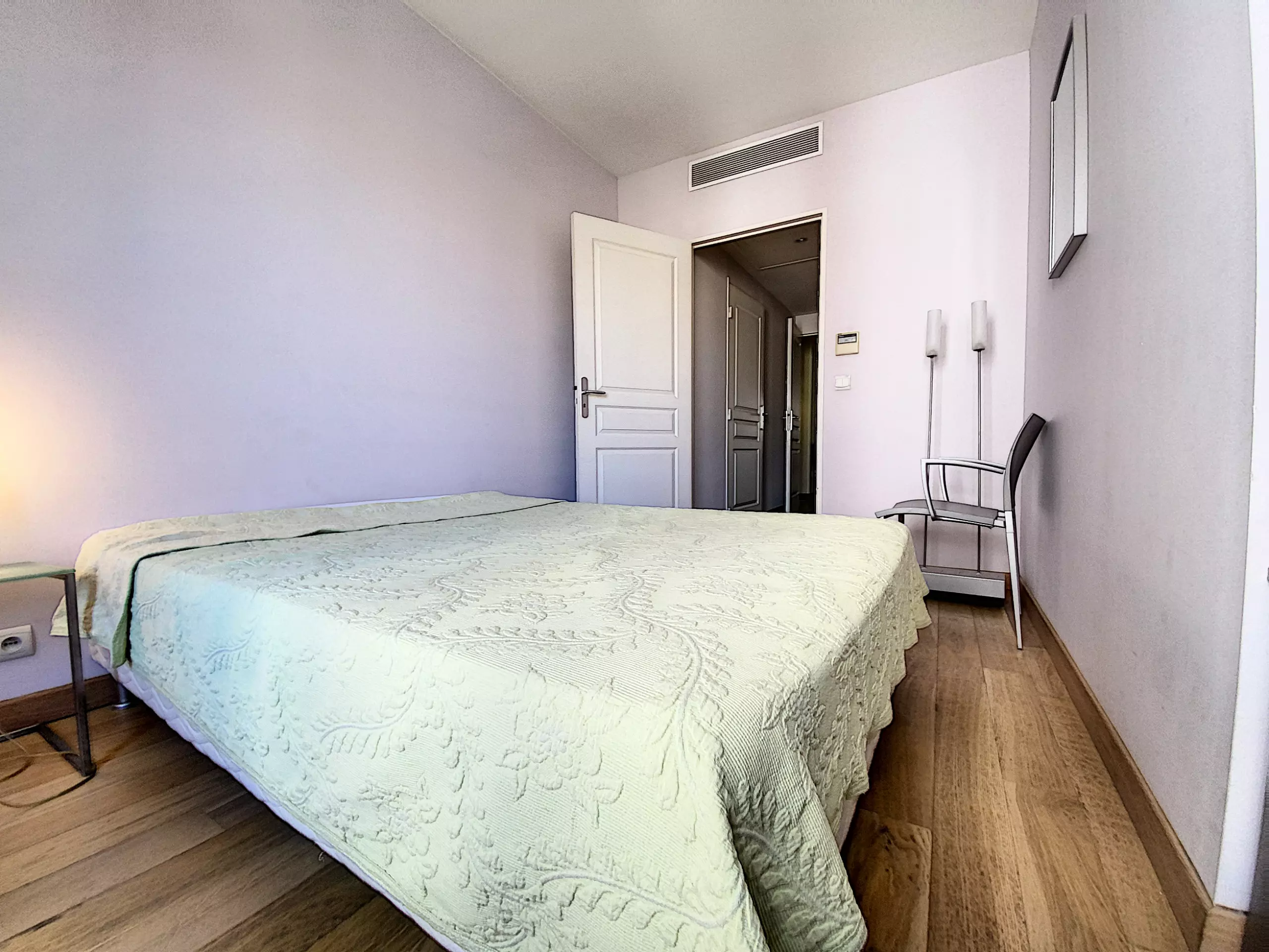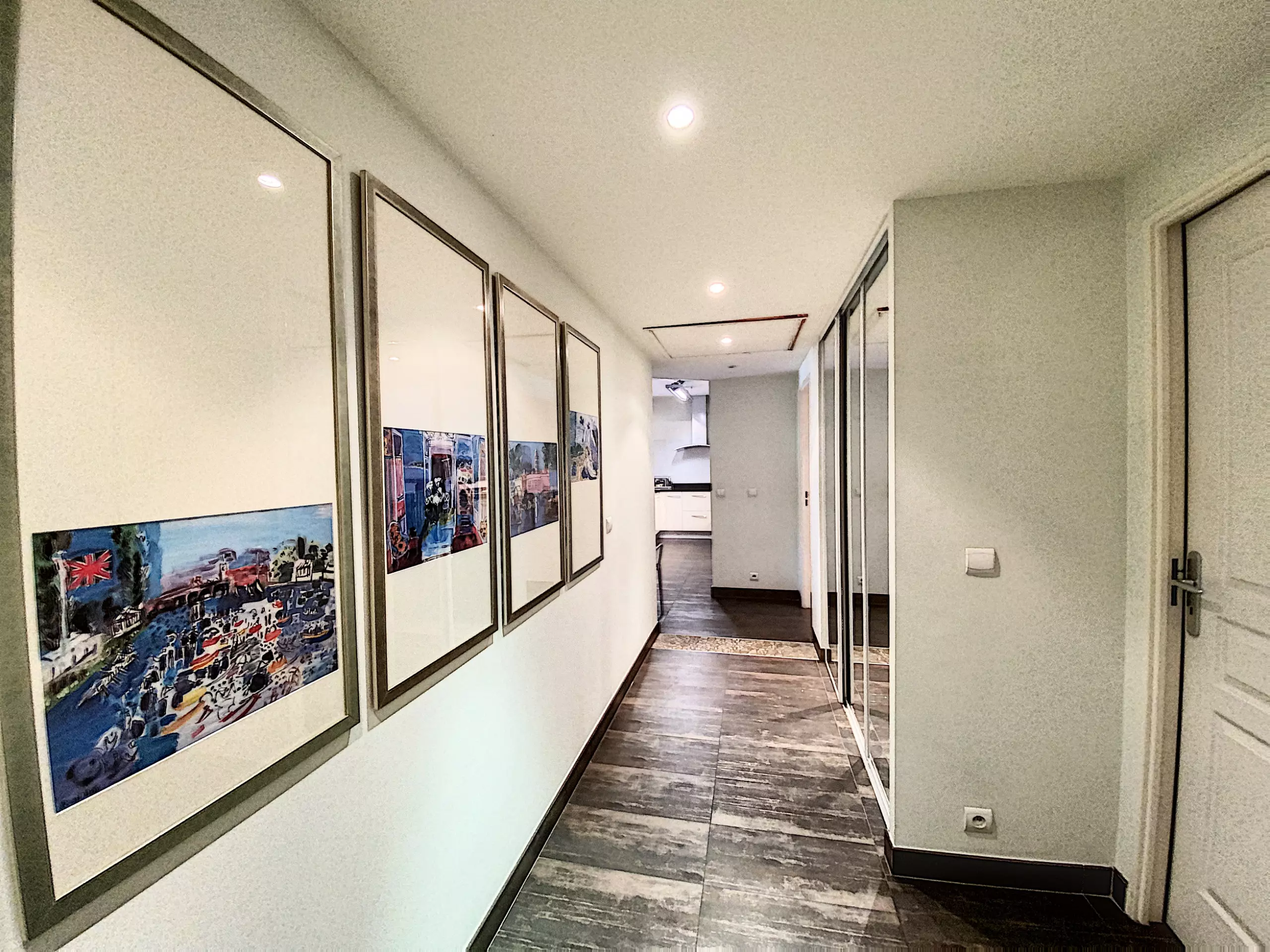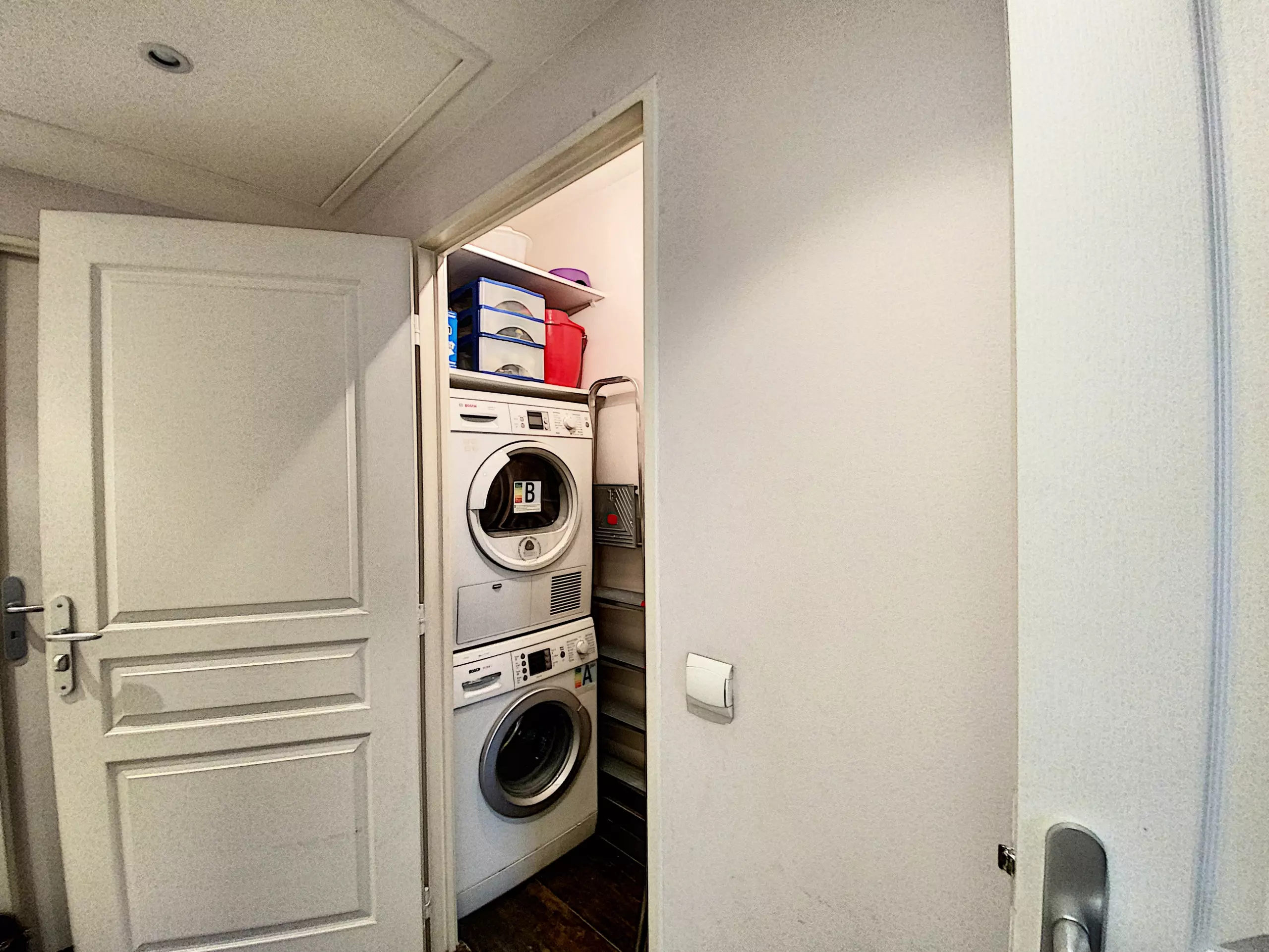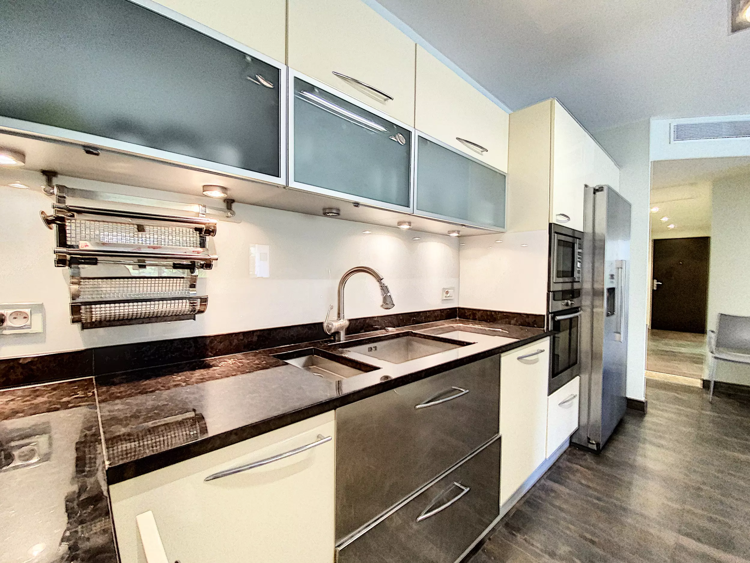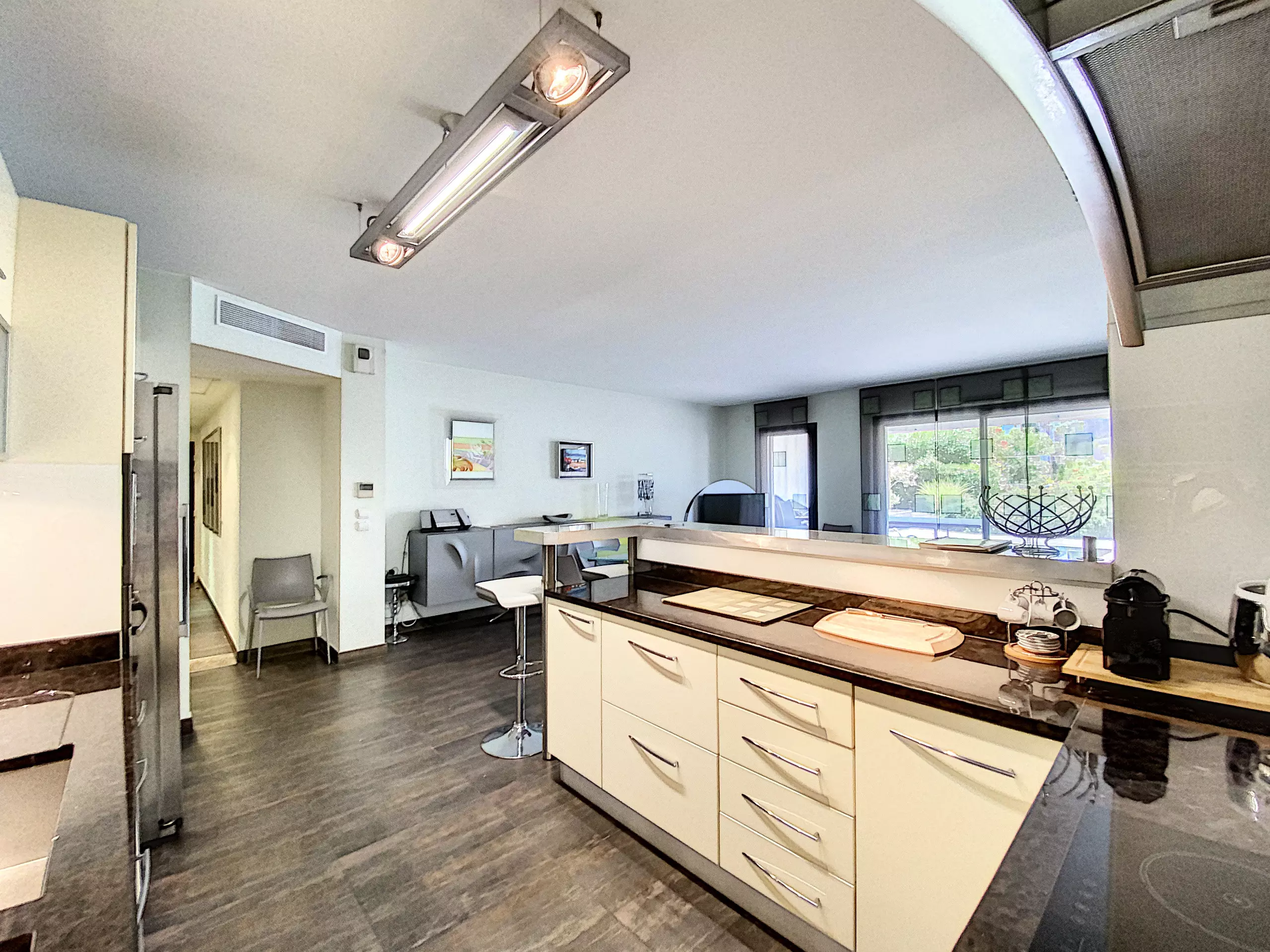 To enjoy the mild Mediterranean climate, a large furnished terrace awaits you with elegant teak flooring, offering an ideal space to relax and soak up the sun. Electric shutters with centralized control provide complete control over light and privacy, while reversible air conditioning ensures optimal comfort year-round. In addition, parking is available for your vehicle, offering added convenience in this popular destination.