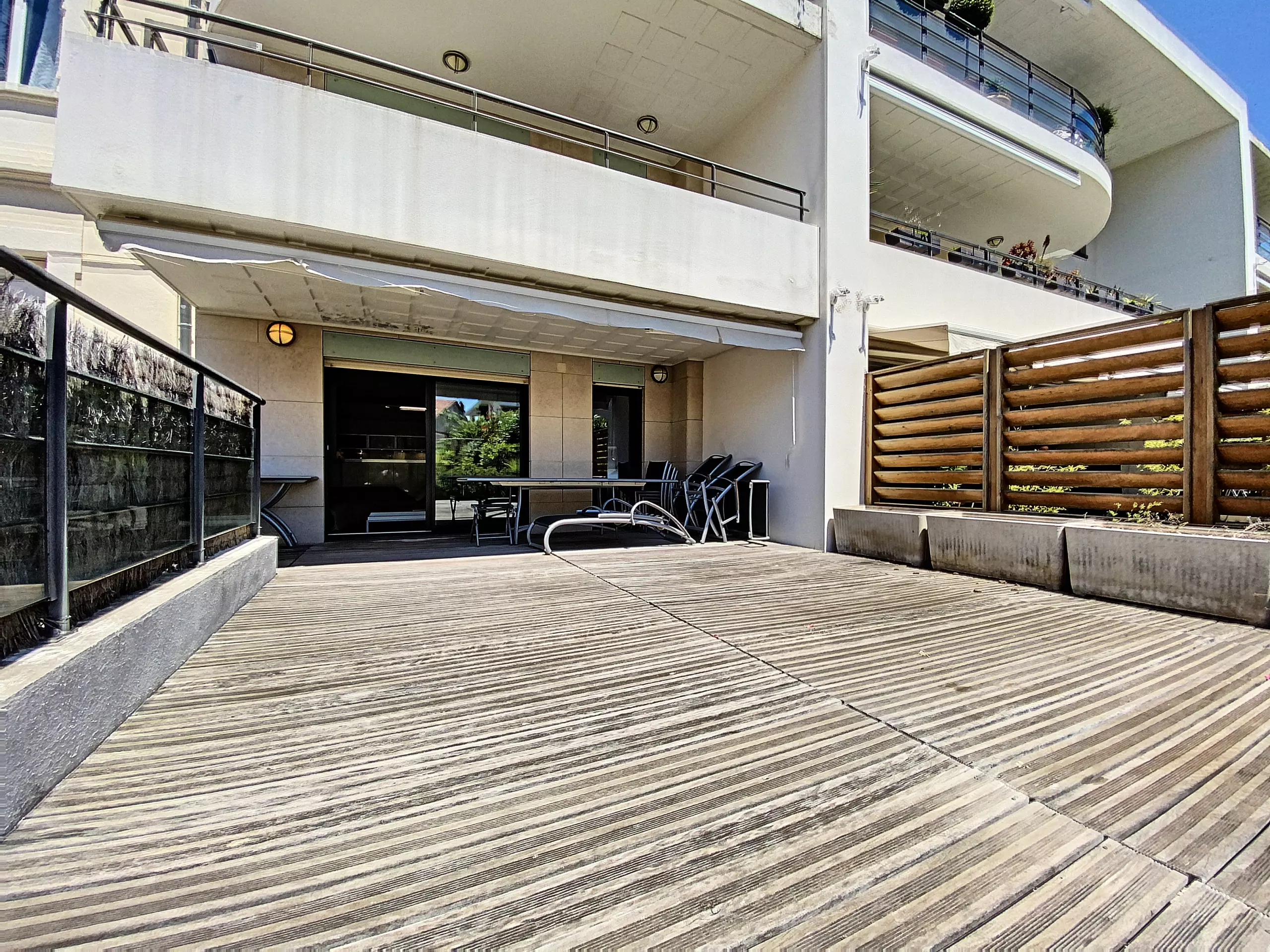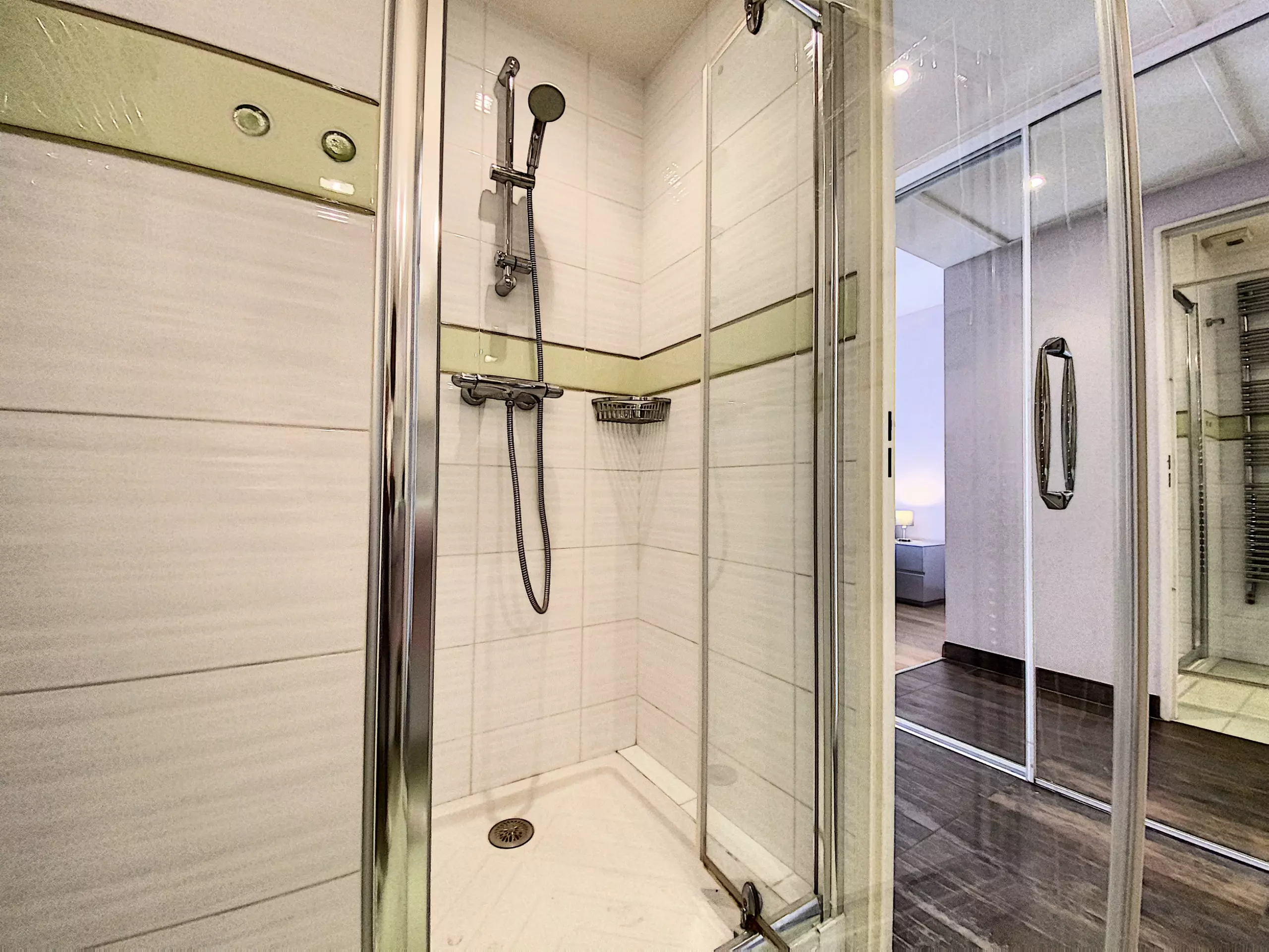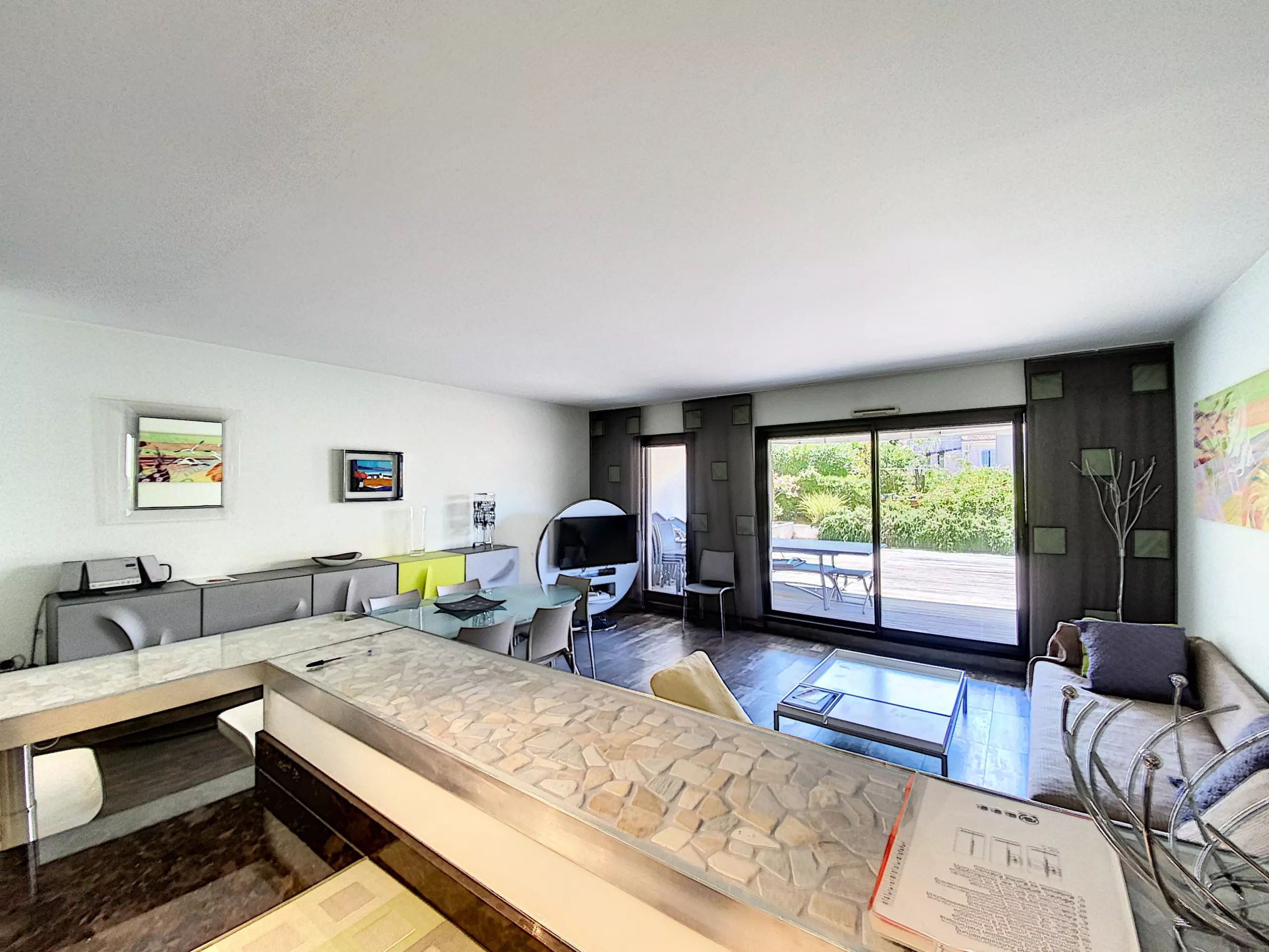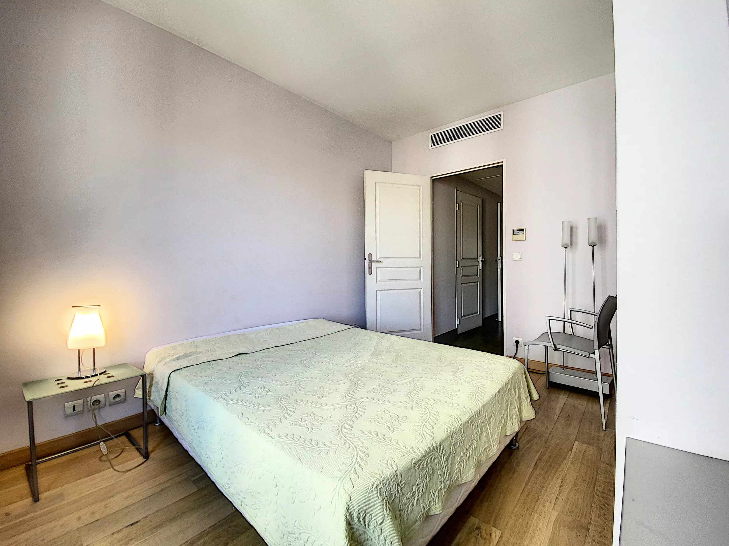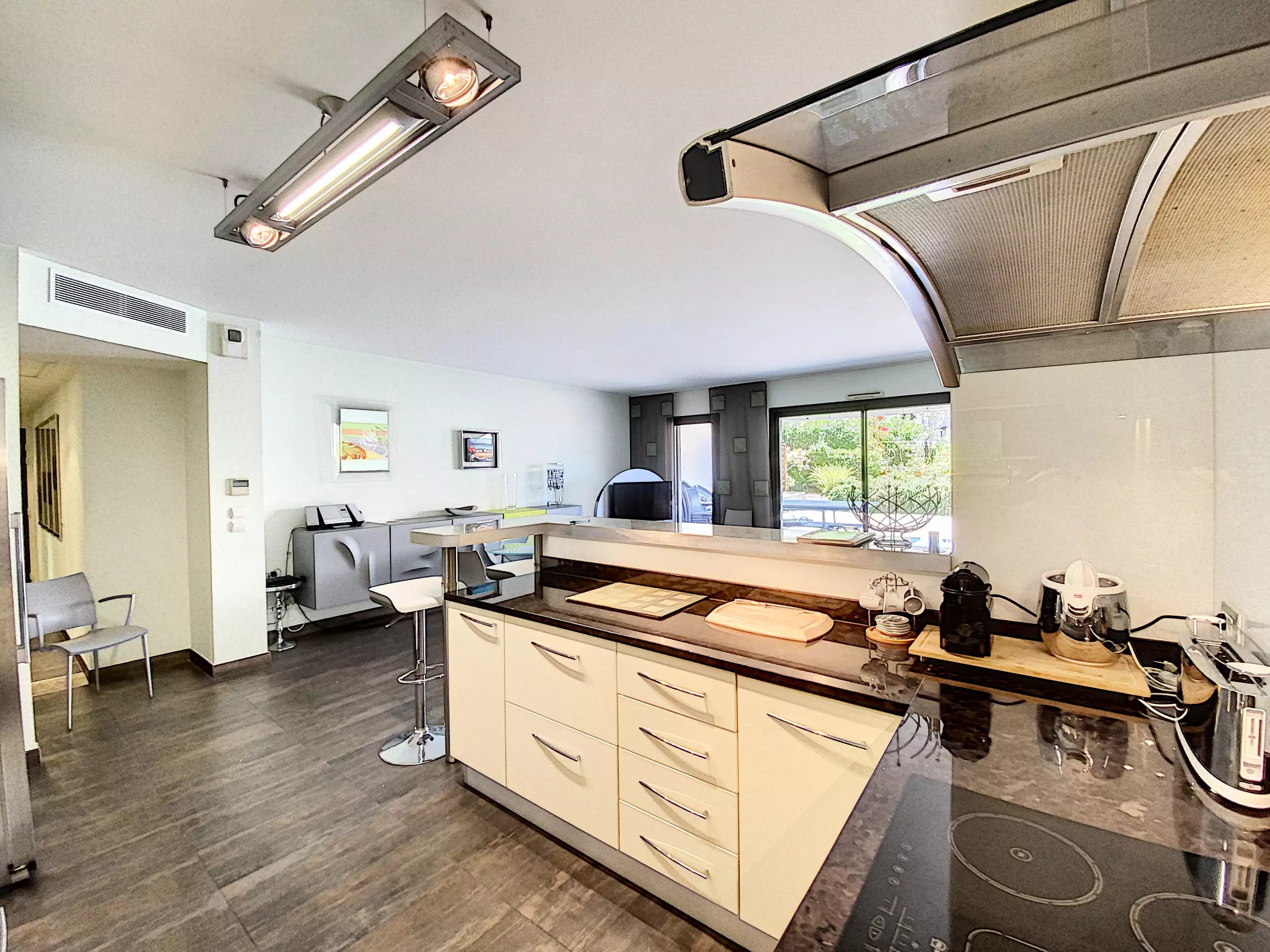 To enjoy the mild Mediterranean climate, a large furnished terrace awaits you with elegant teak flooring, offering an ideal space to relax and soak up the sun. Electric shutters with centralized control provide complete control over light and privacy, while reversible air conditioning ensures optimal comfort year-round. In addition, parking is available for your vehicle, offering added convenience in this popular destination.