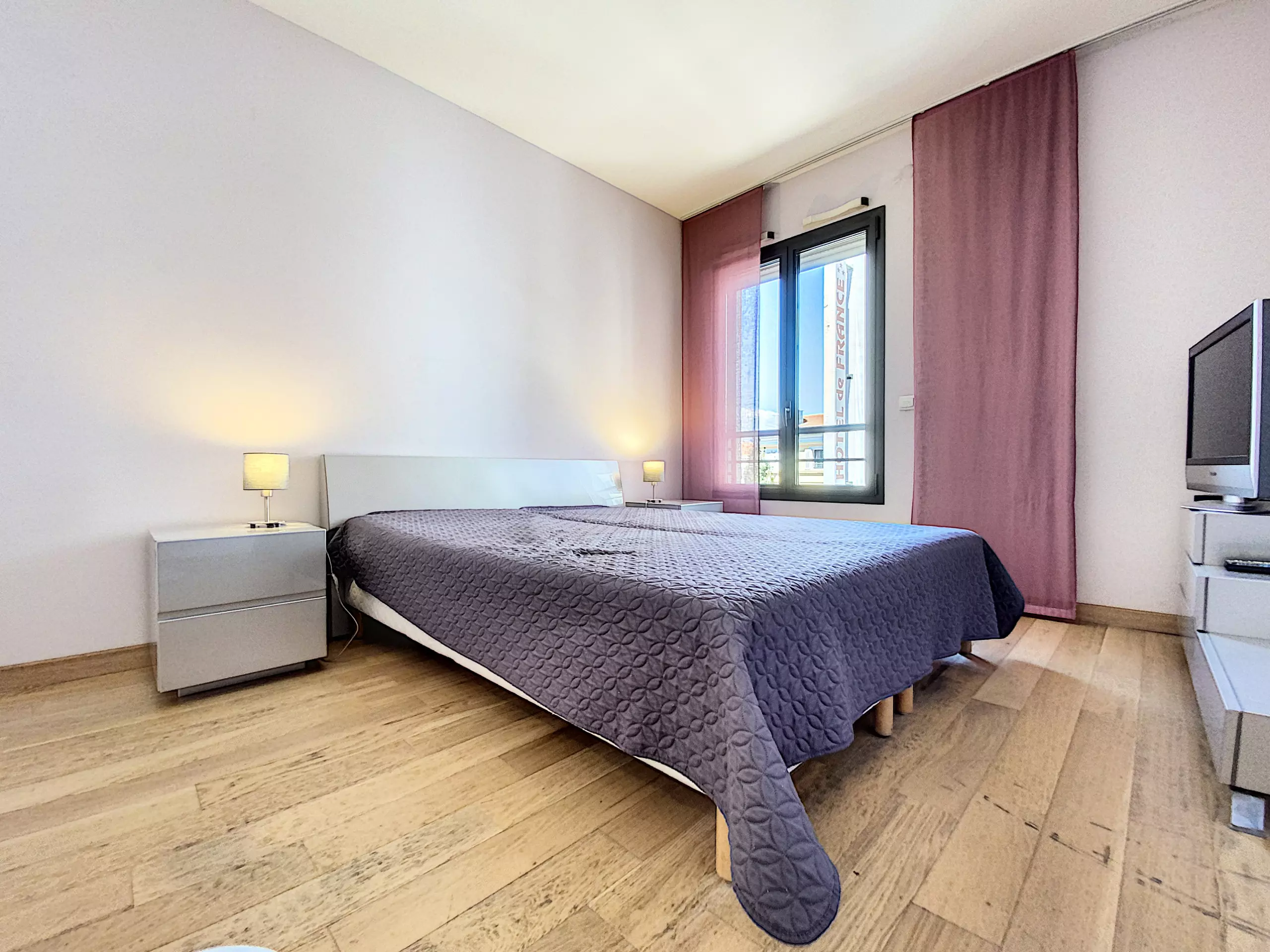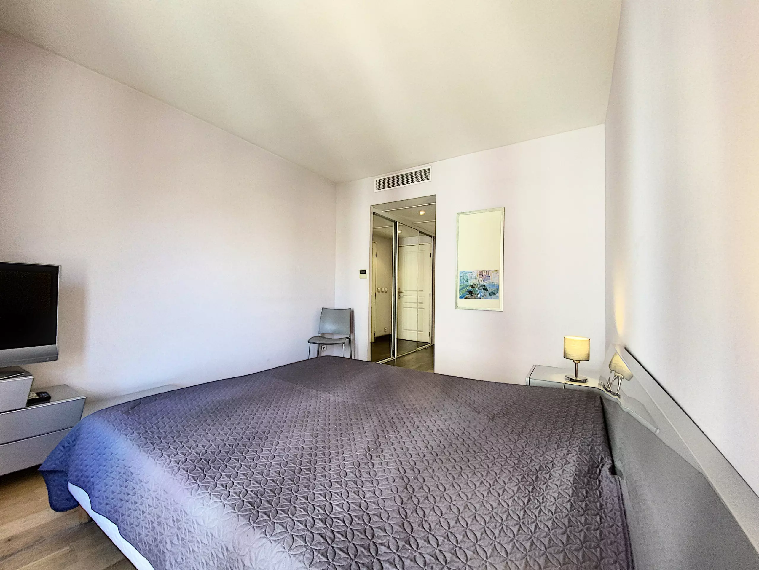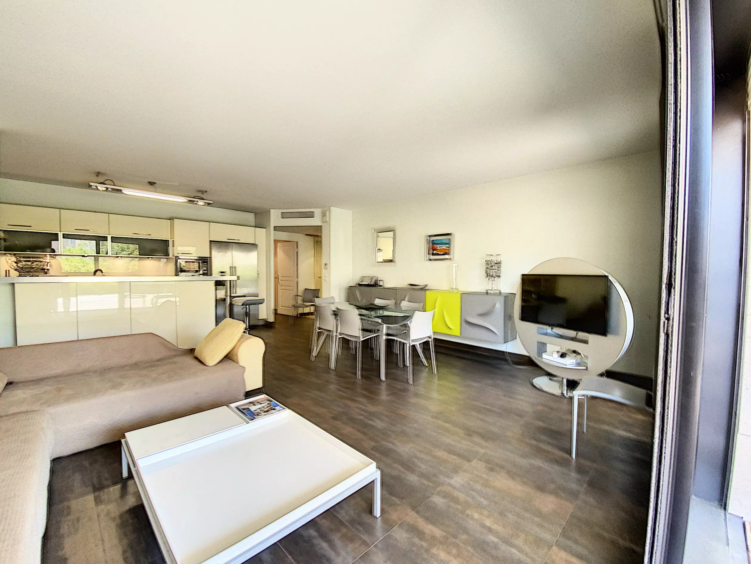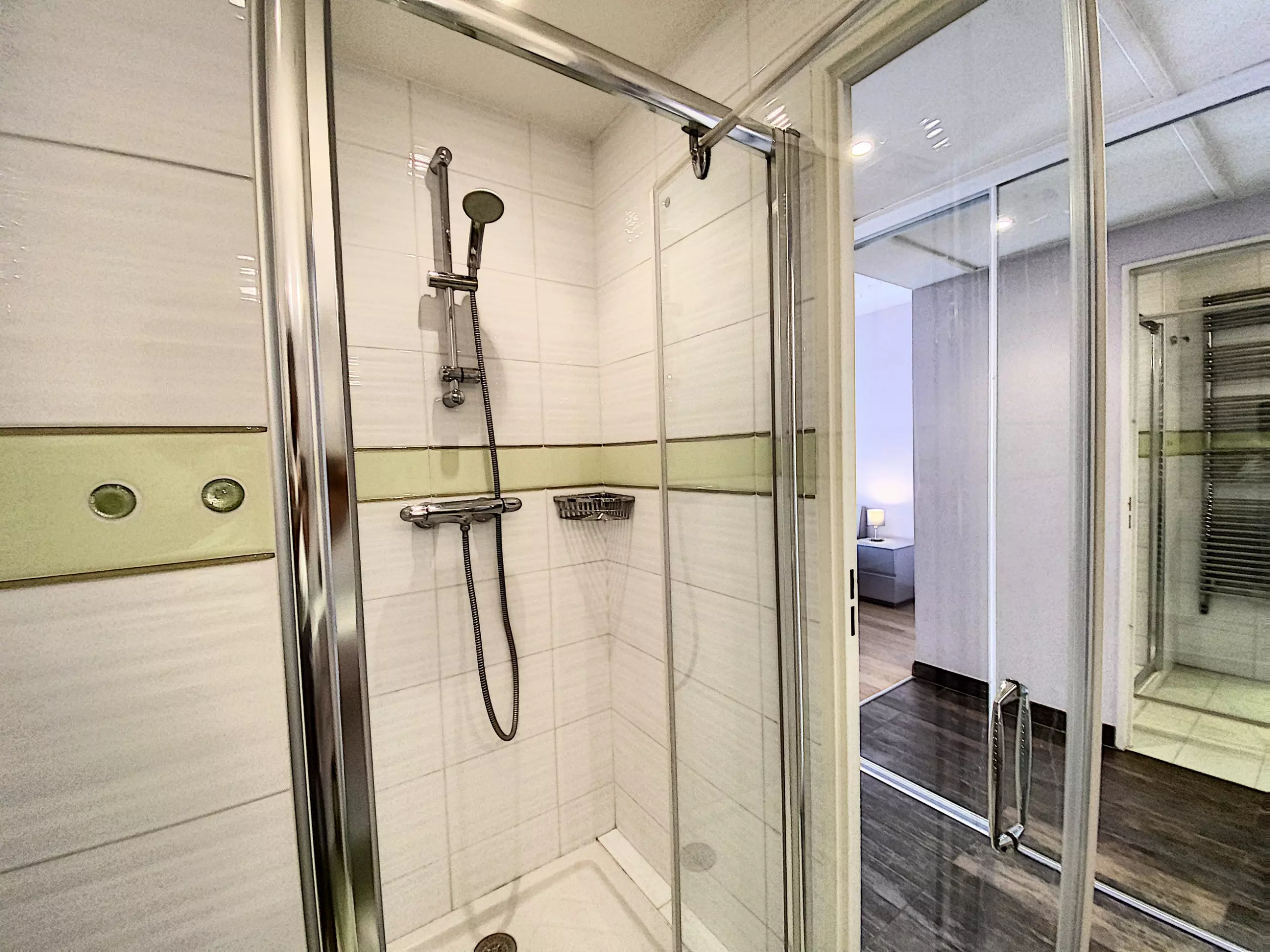 To enjoy the mild Mediterranean climate, a large furnished terrace awaits you with elegant teak flooring, offering an ideal space to relax and soak up the sun. Electric shutters with centralized control provide complete control over light and privacy, while reversible air conditioning ensures optimal comfort year-round. In addition, parking is available for your vehicle, offering added convenience in this popular destination.