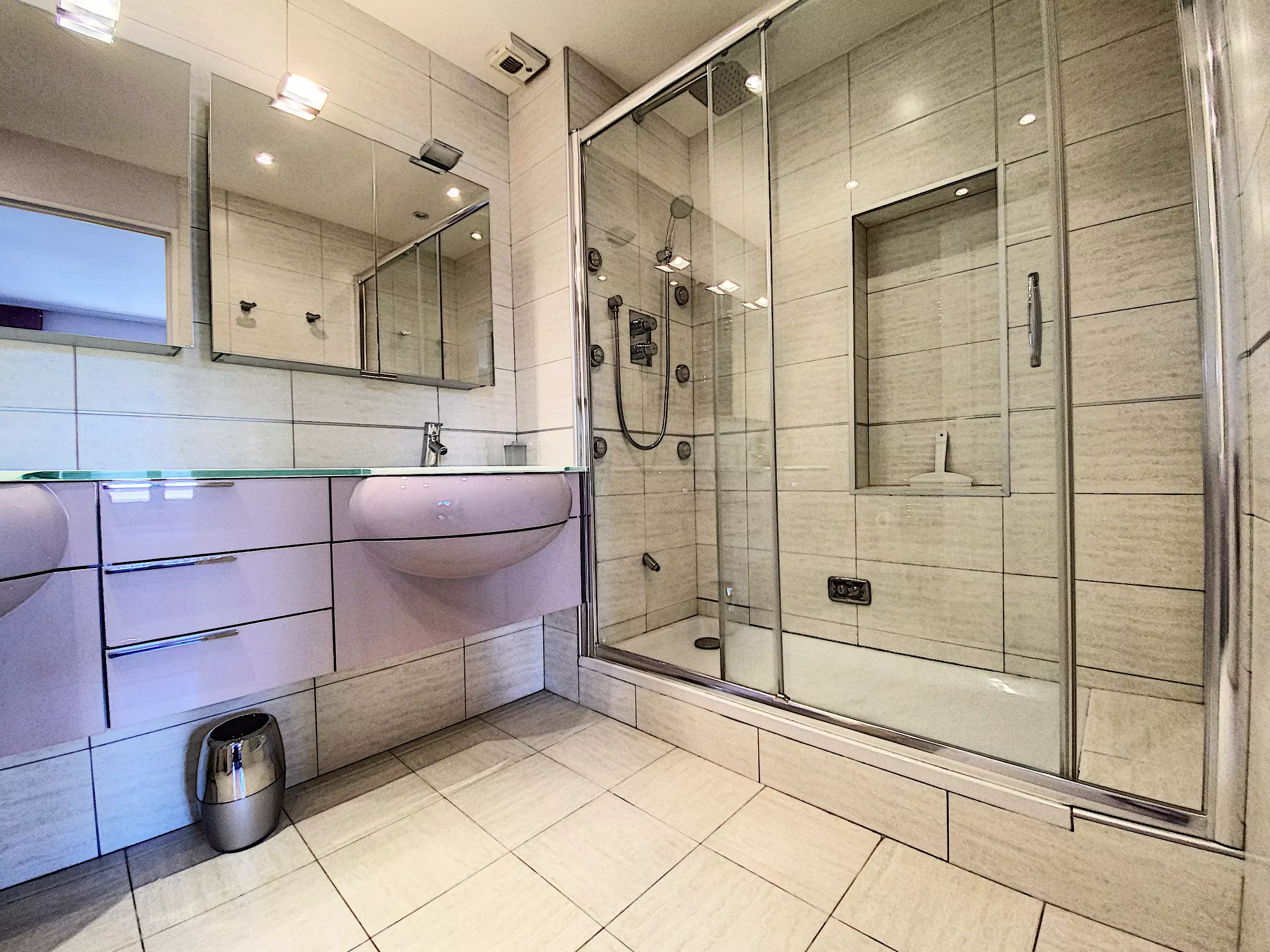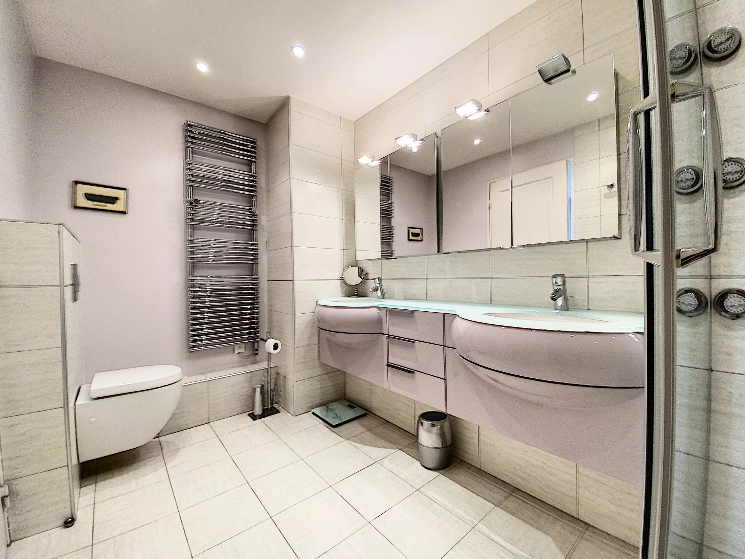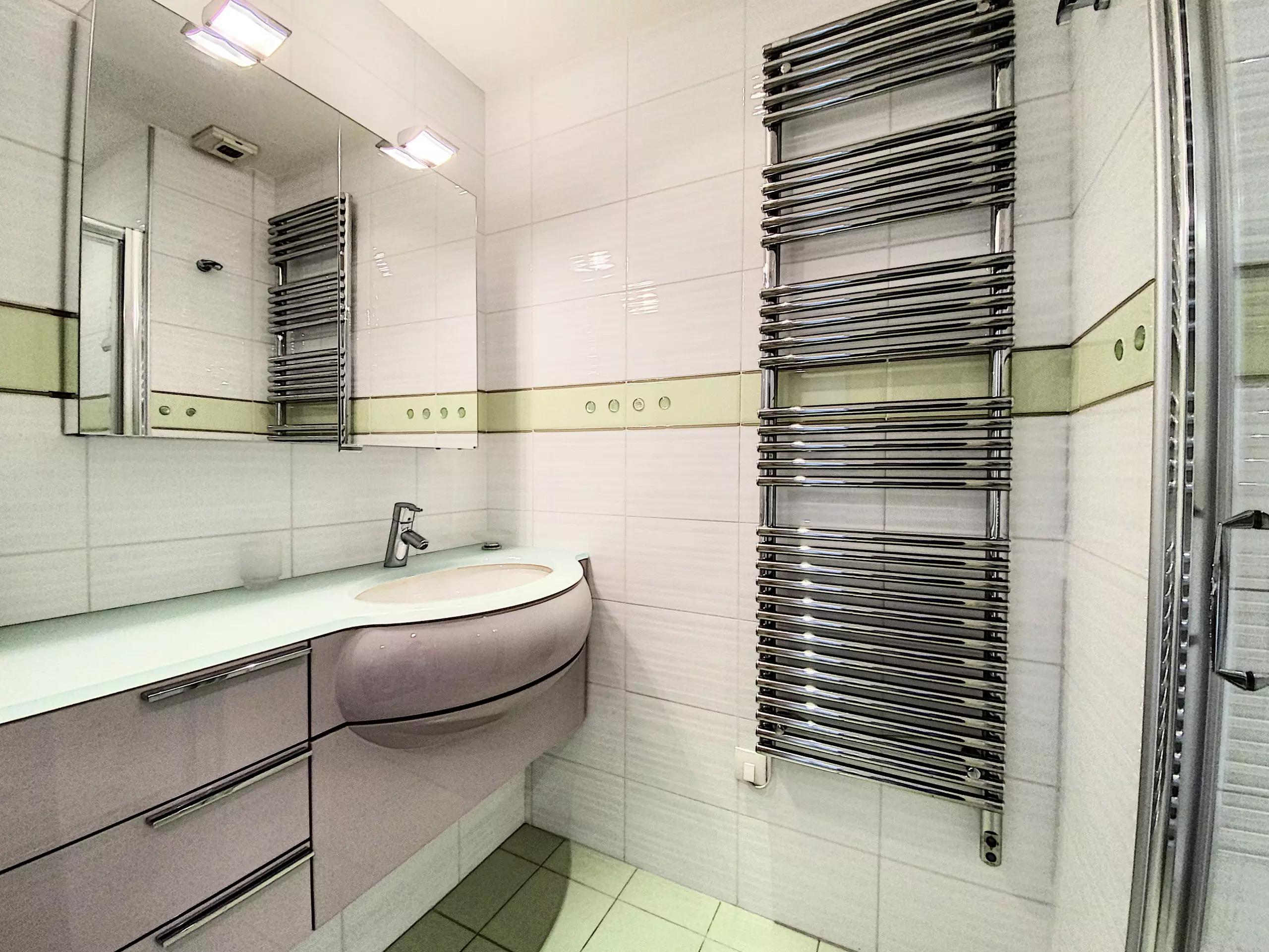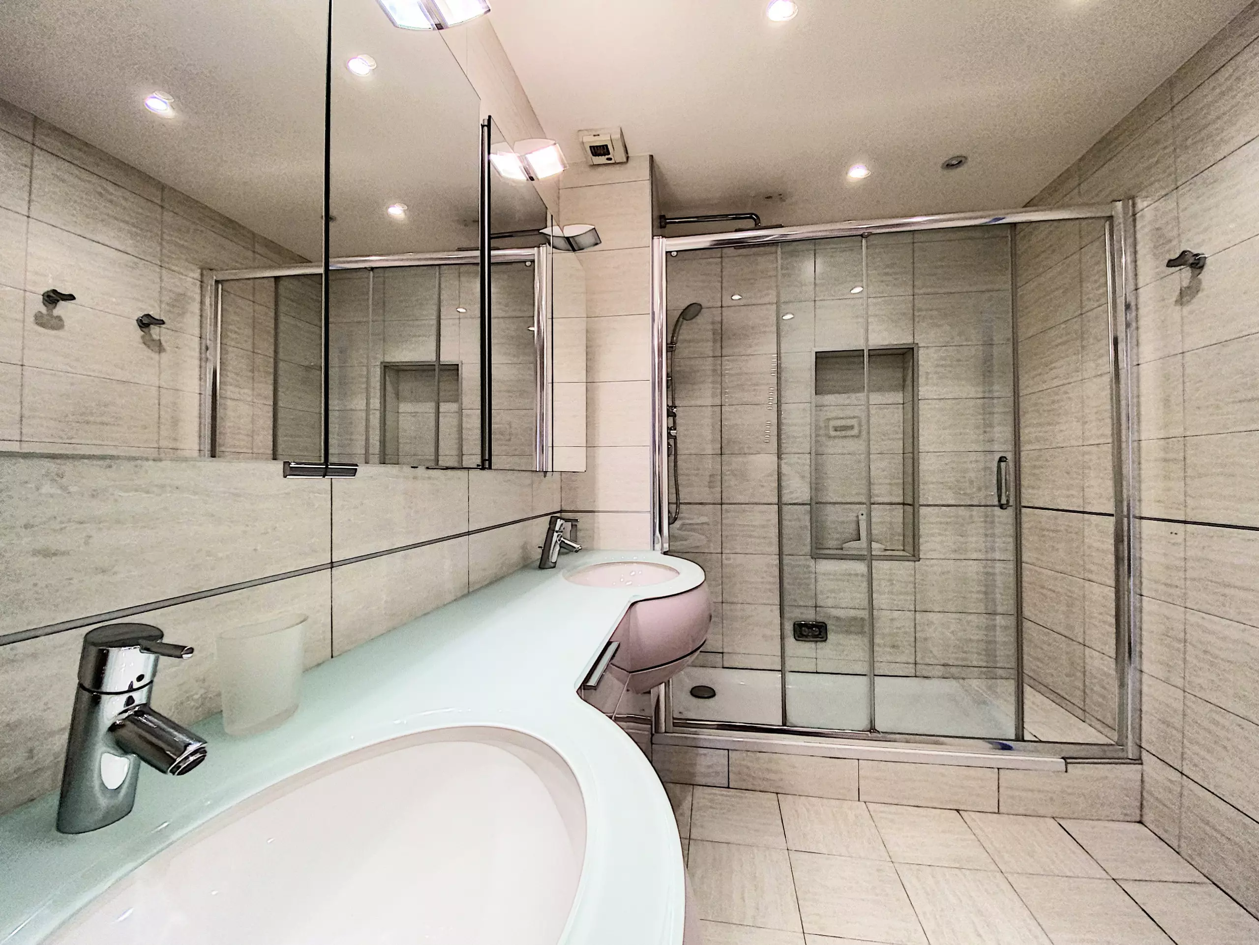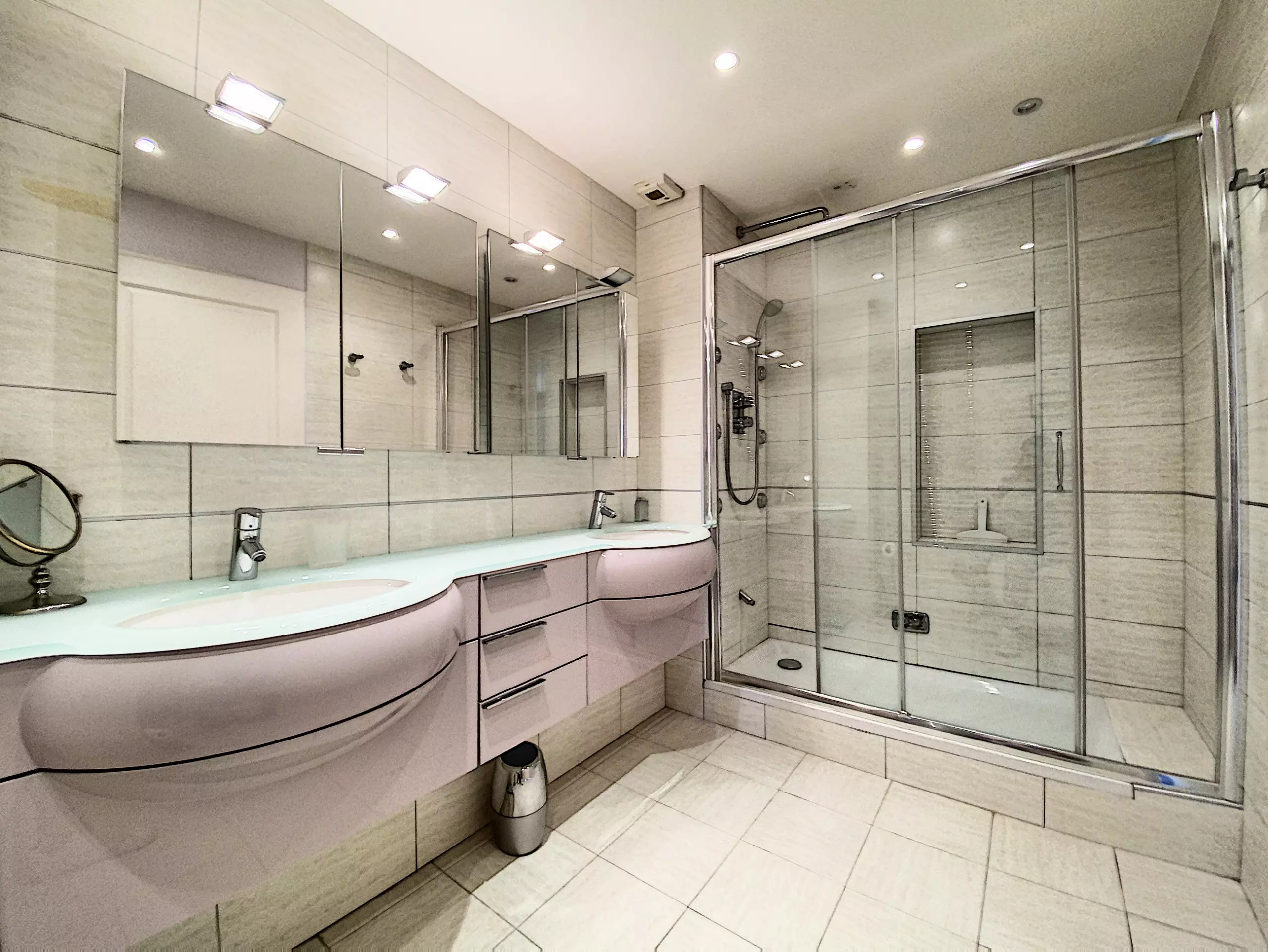 The apartment spans a generous 124 square meters and boasts an optimal layout. You'll find three elegantly decorated bedrooms, each offering a peaceful retreat. The bedroom features two twin beds and an en-suite shower room with a large walk-in shower, double vanity, and toilet. A second shower room and a separate toilet are also available for your convenience. The second bedroom is furnished with a double bed and a television, while the third bedroom offers twin beds and a convenient laundry area for your everyday needs.