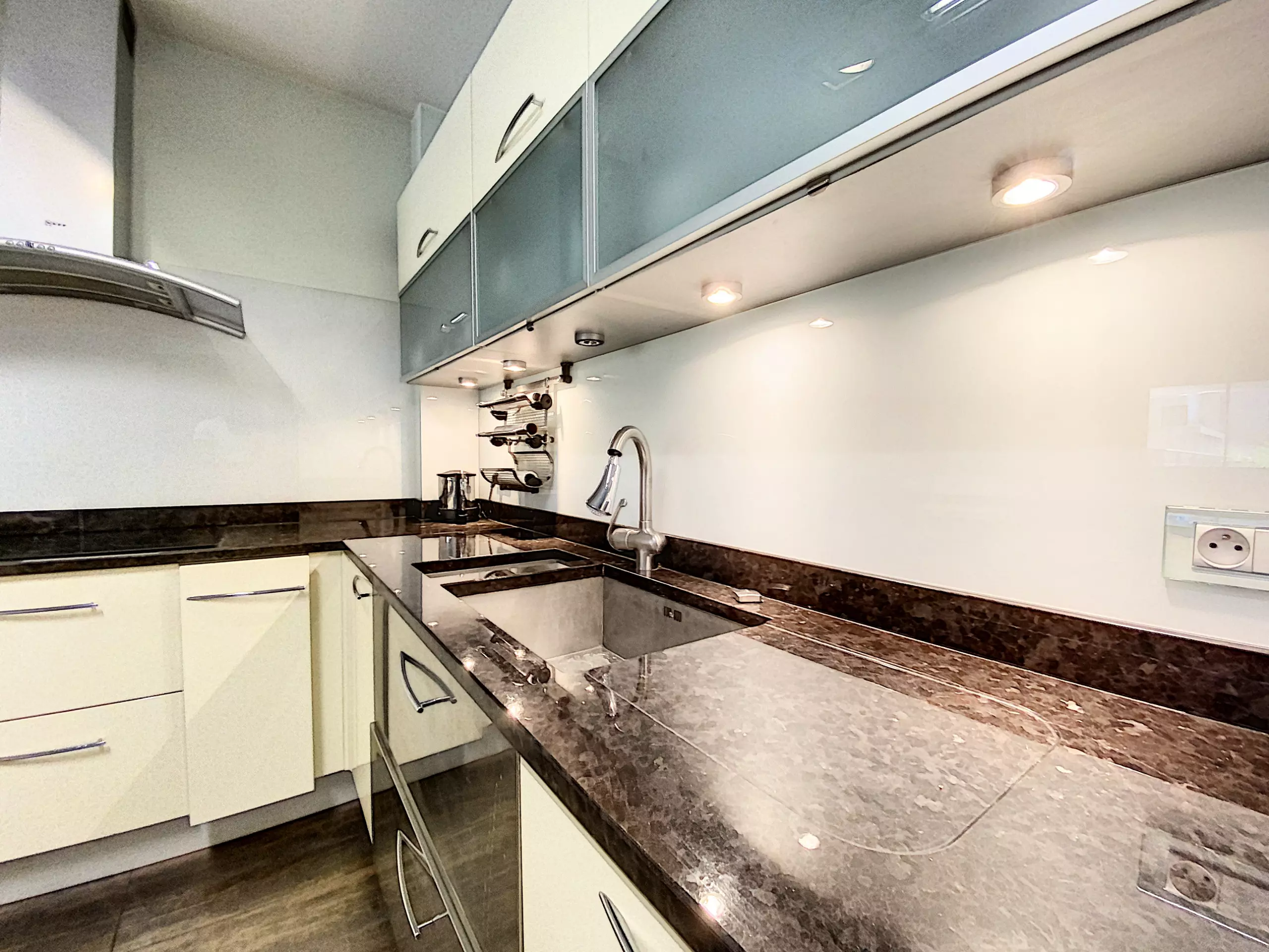 The centerpiece of this apartment is its spacious living area, where you can relax on the comfortable corner sofa while watching TV on a large screen. Enjoy a DVD player and CD player for your entertainment, as well as Wi-Fi throughout the apartment to stay connected. The fully equipped kitchen includes an American-style refrigerator, a conventional oven, a microwave, a ceramic hob, and a dishwasher, allowing you to prepare meals with ease.