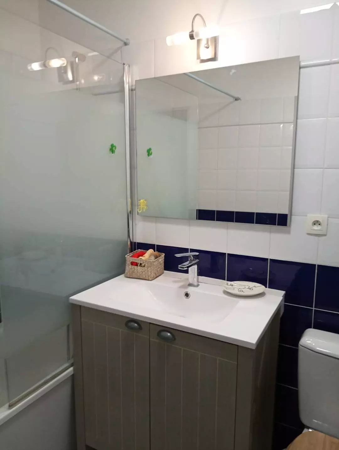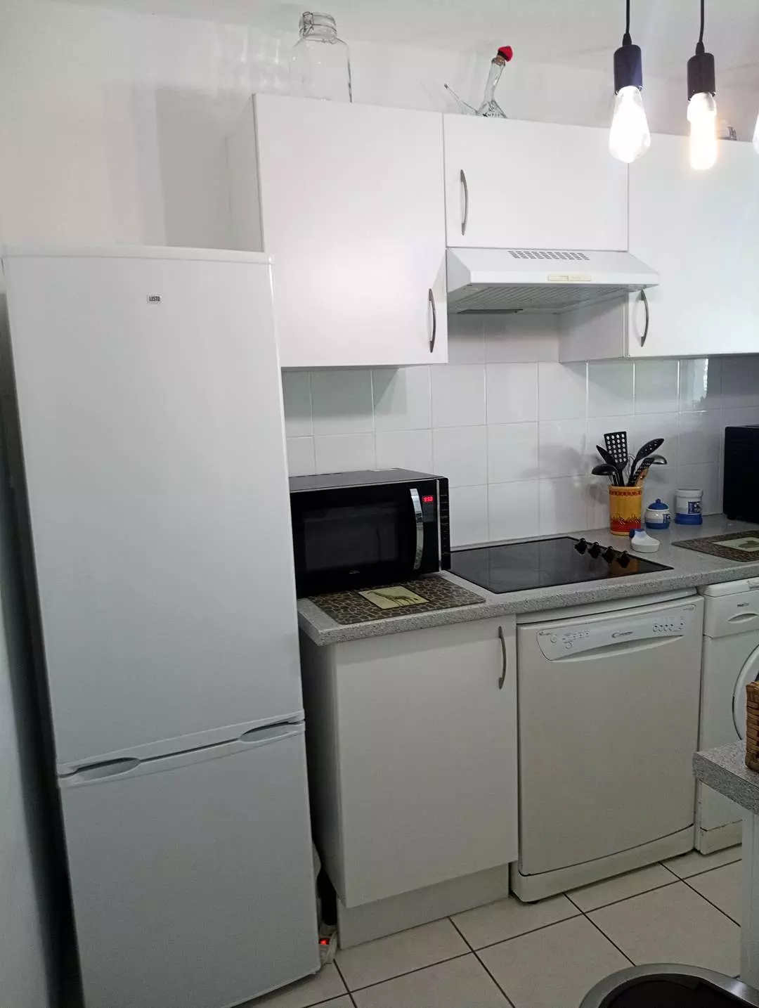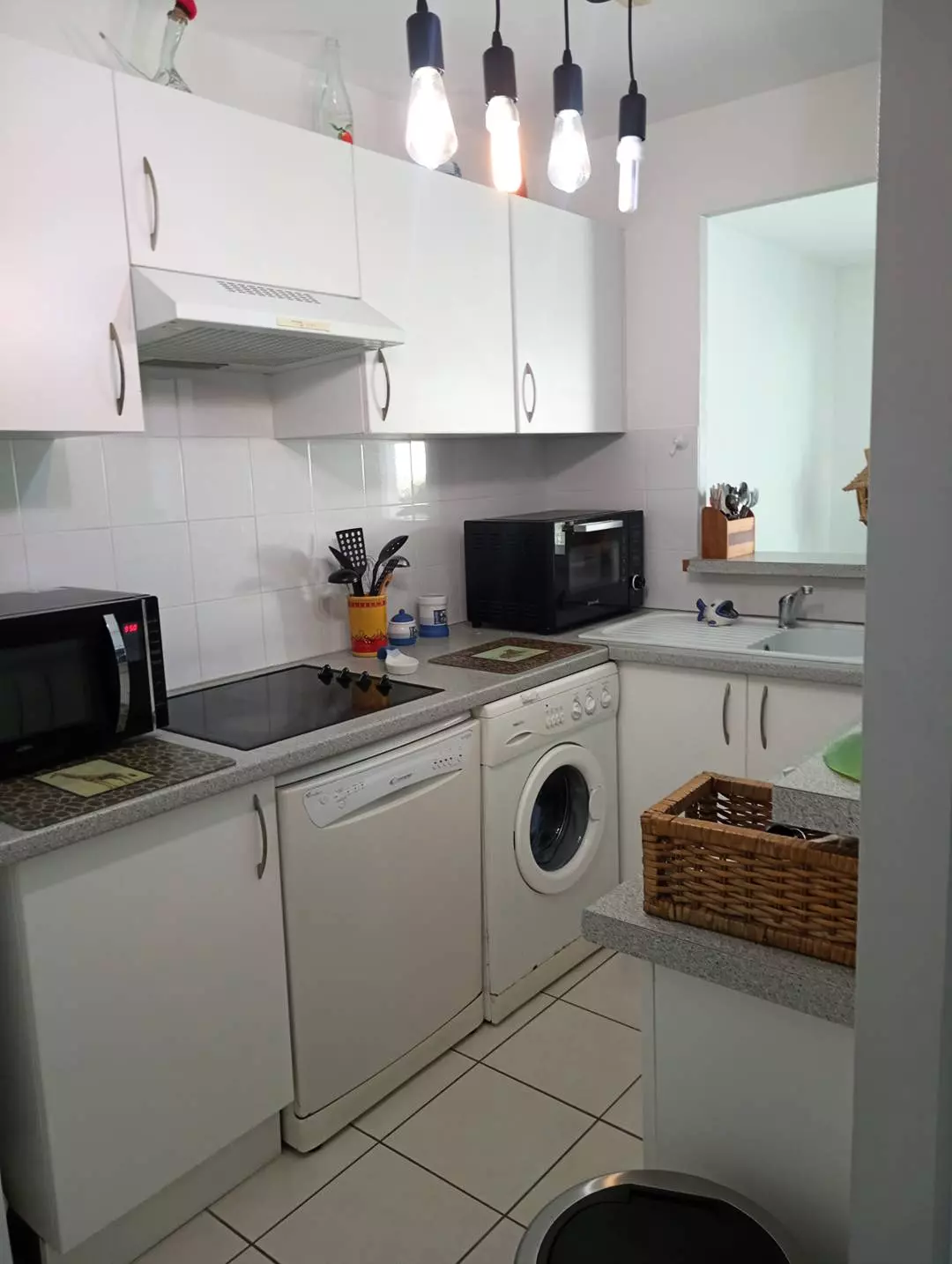 The kitchen is functional and well-equipped: ceramic hob, mini-oven, microwave, fridge-freezer and washing machine.