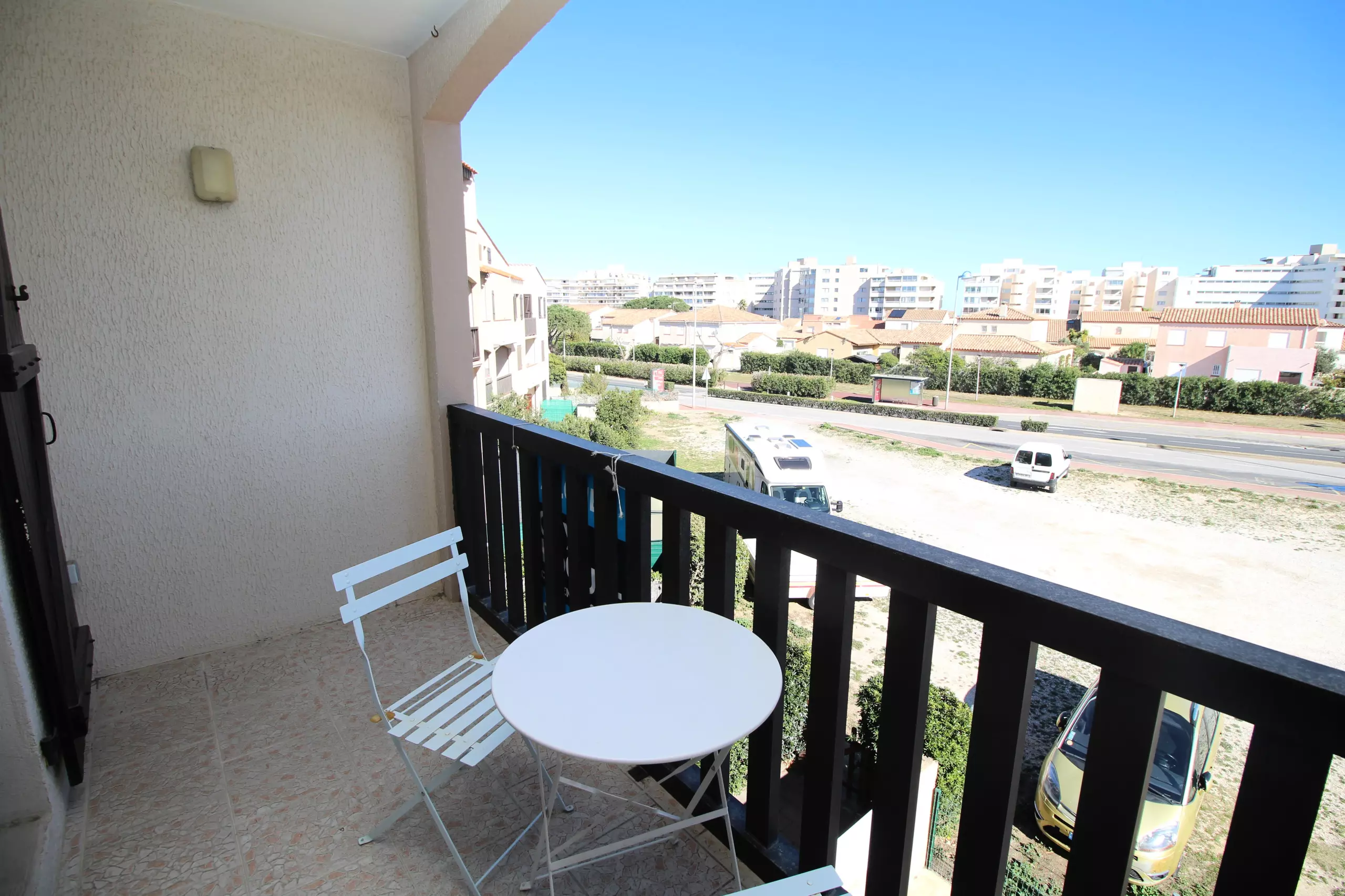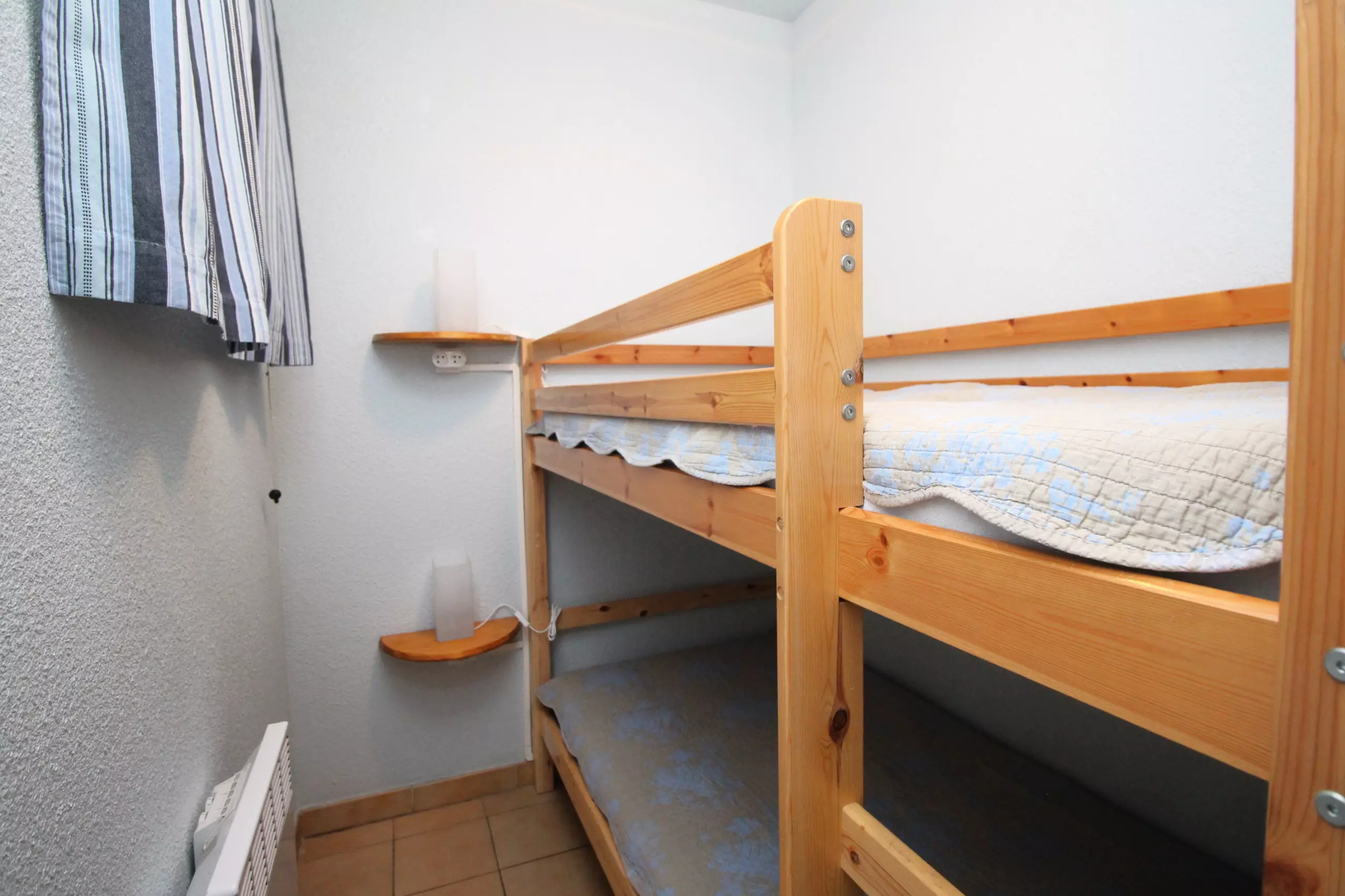 It consists of an entrance leading to a cabin with bunk beds, a shower room with WC, and a living room with open kitchen and access to the balcony.