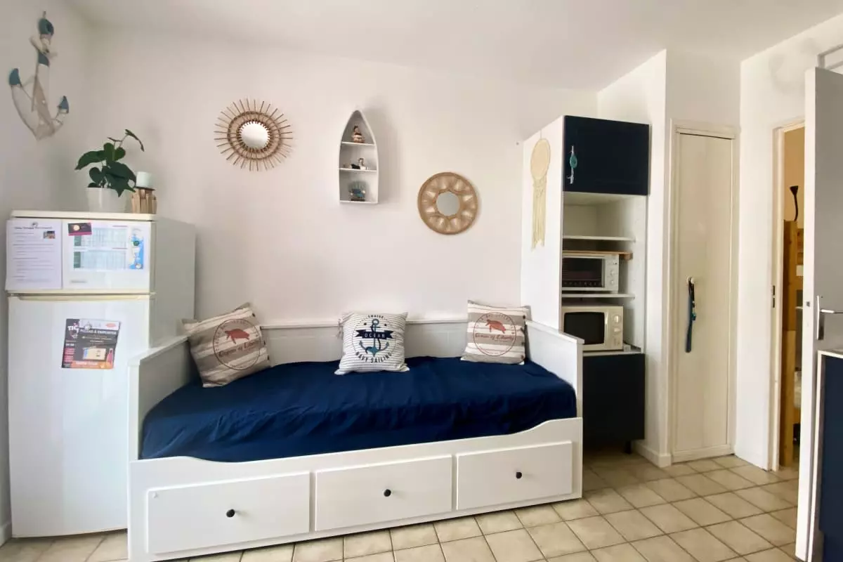 The living room transforms into a cozy relaxation space thanks to its 160x200 sofa bed. For younger children, a dedicated sleeping area features a bunk bed made up of two single beds measuring 80x190.