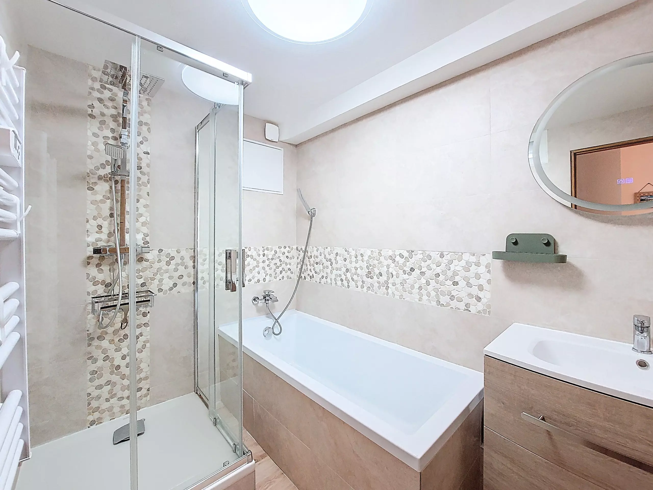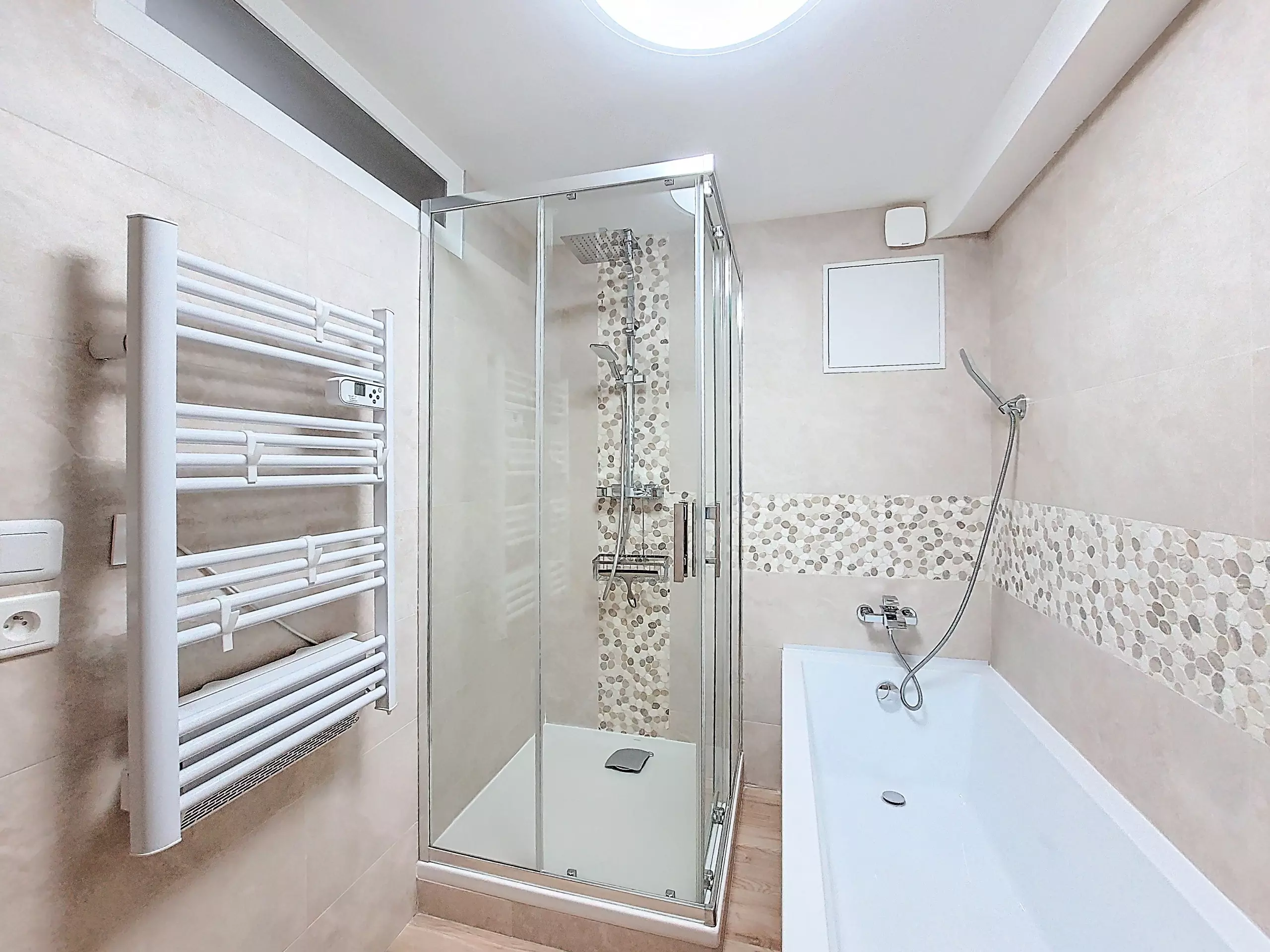 The spacious and functional bathroom is equipped with both a bathtub and a shower, a towel warmer, and storage. A separate toilet completes the setup for added everyday comfort.