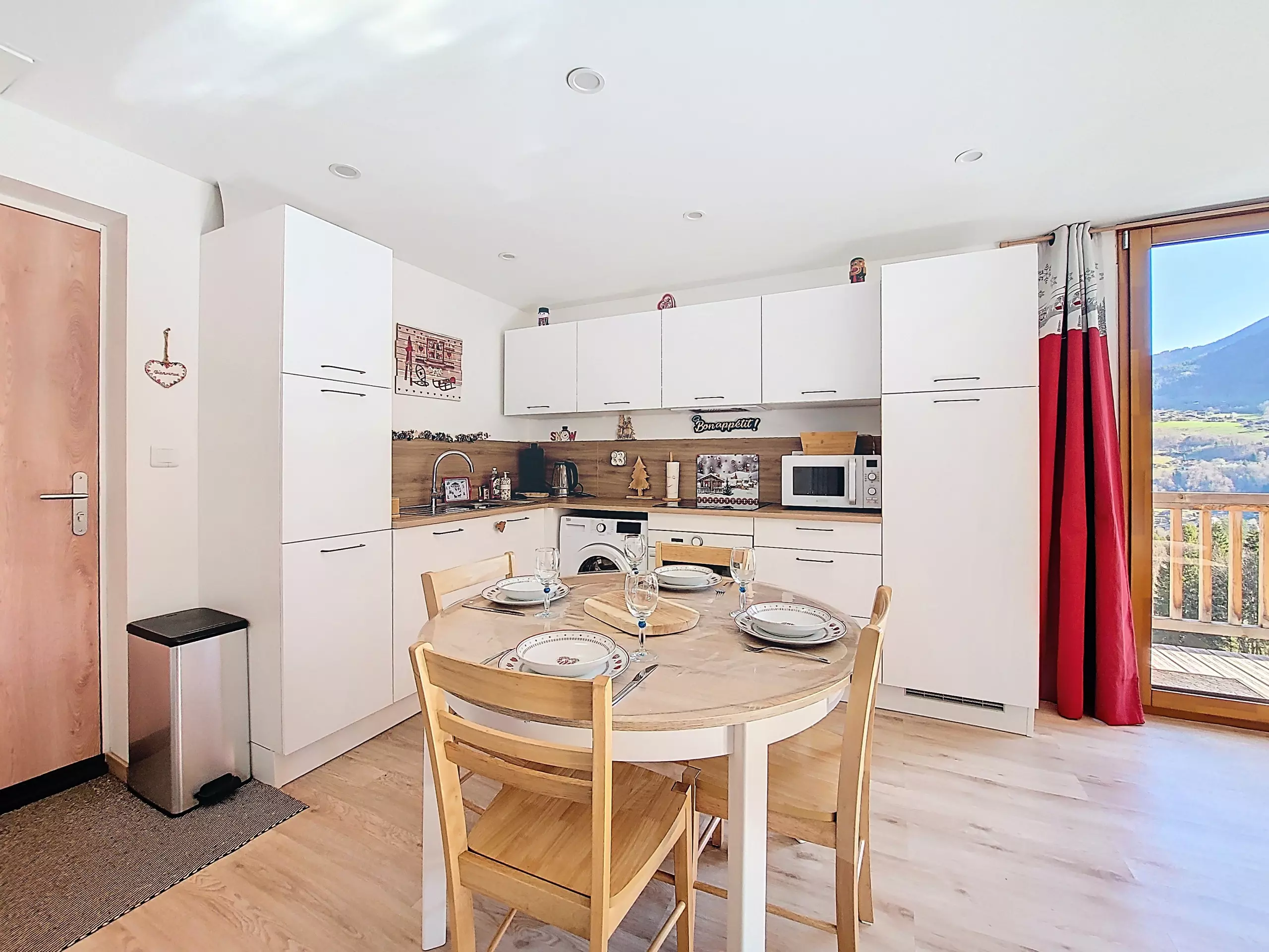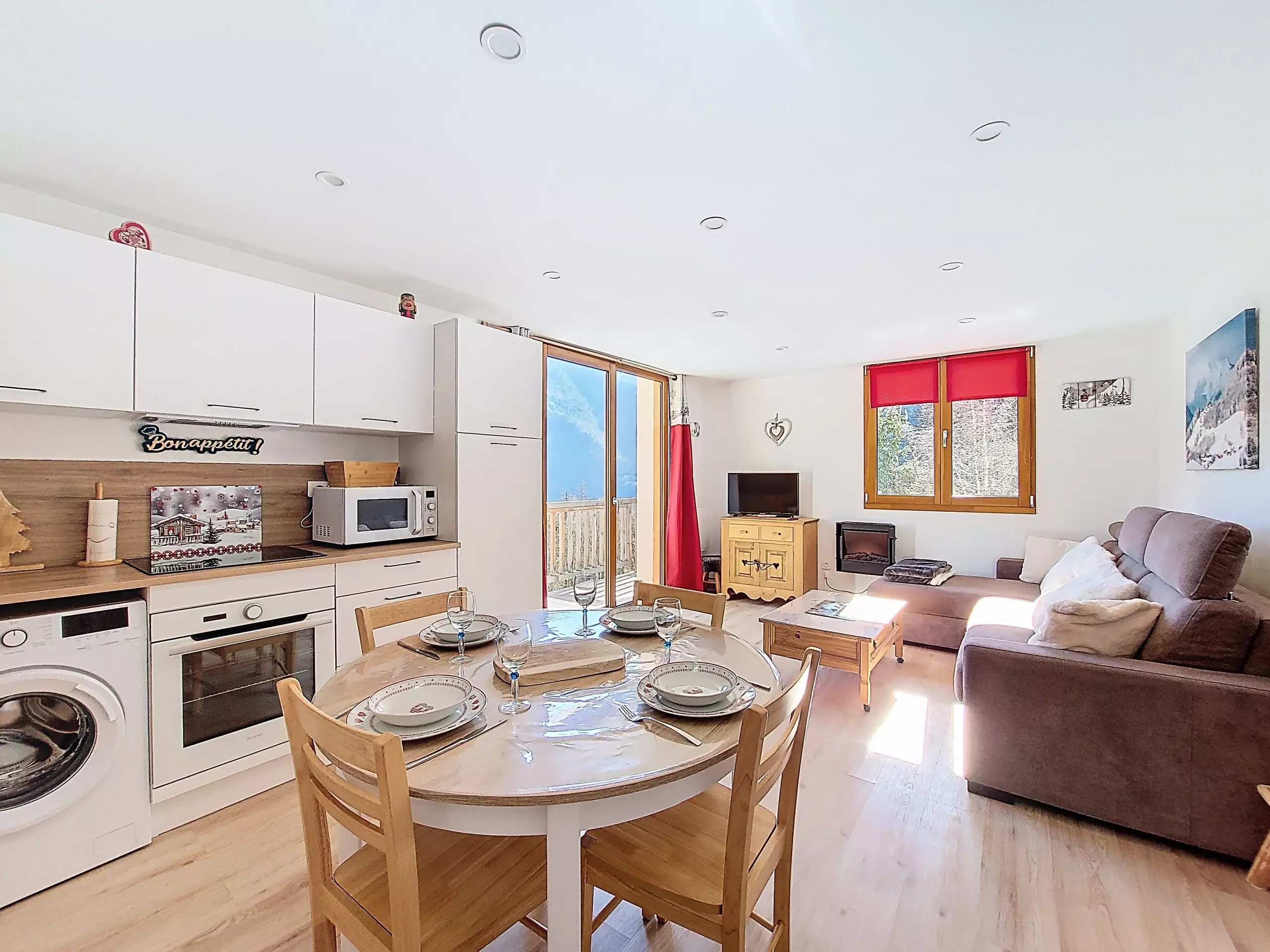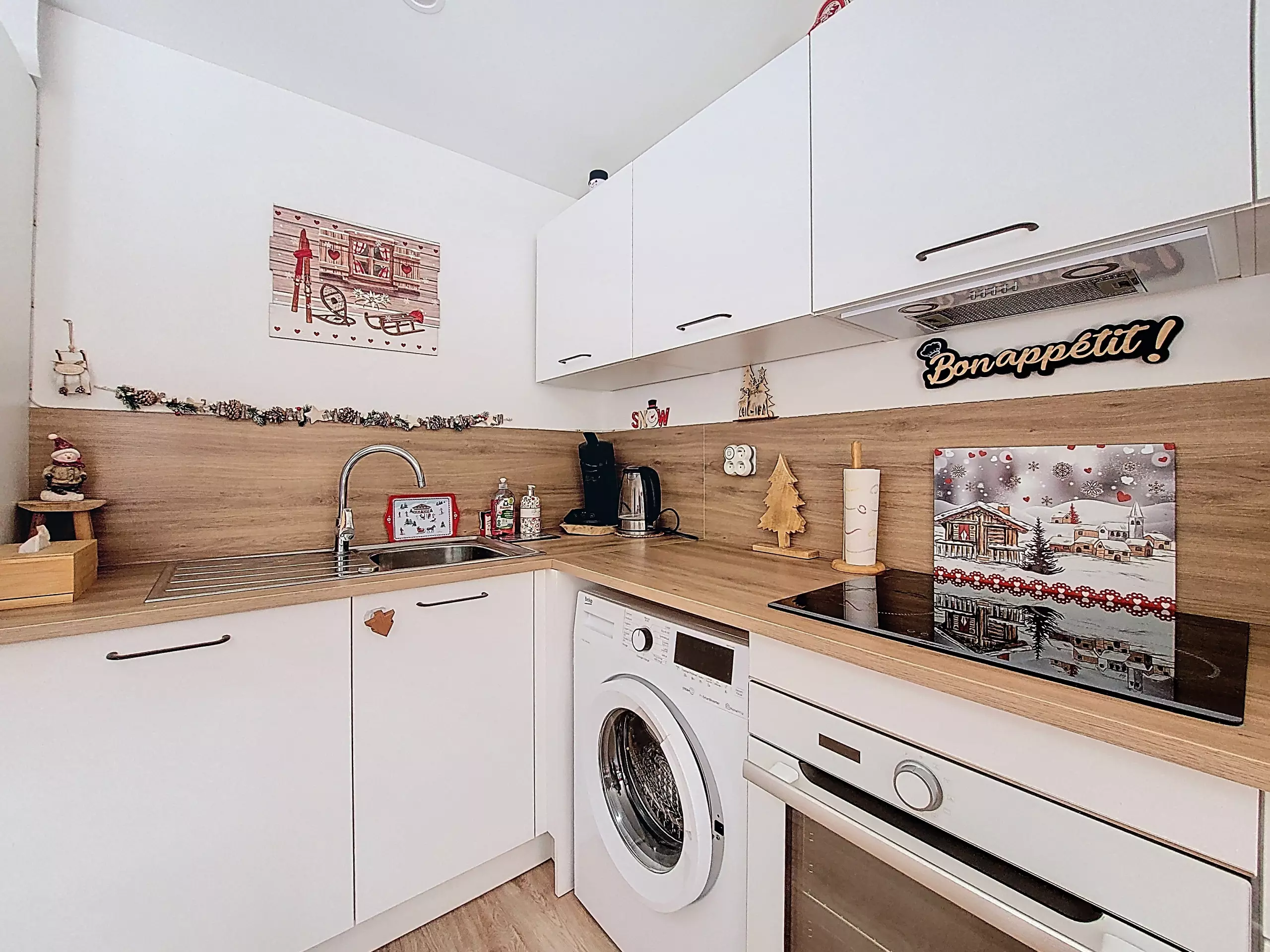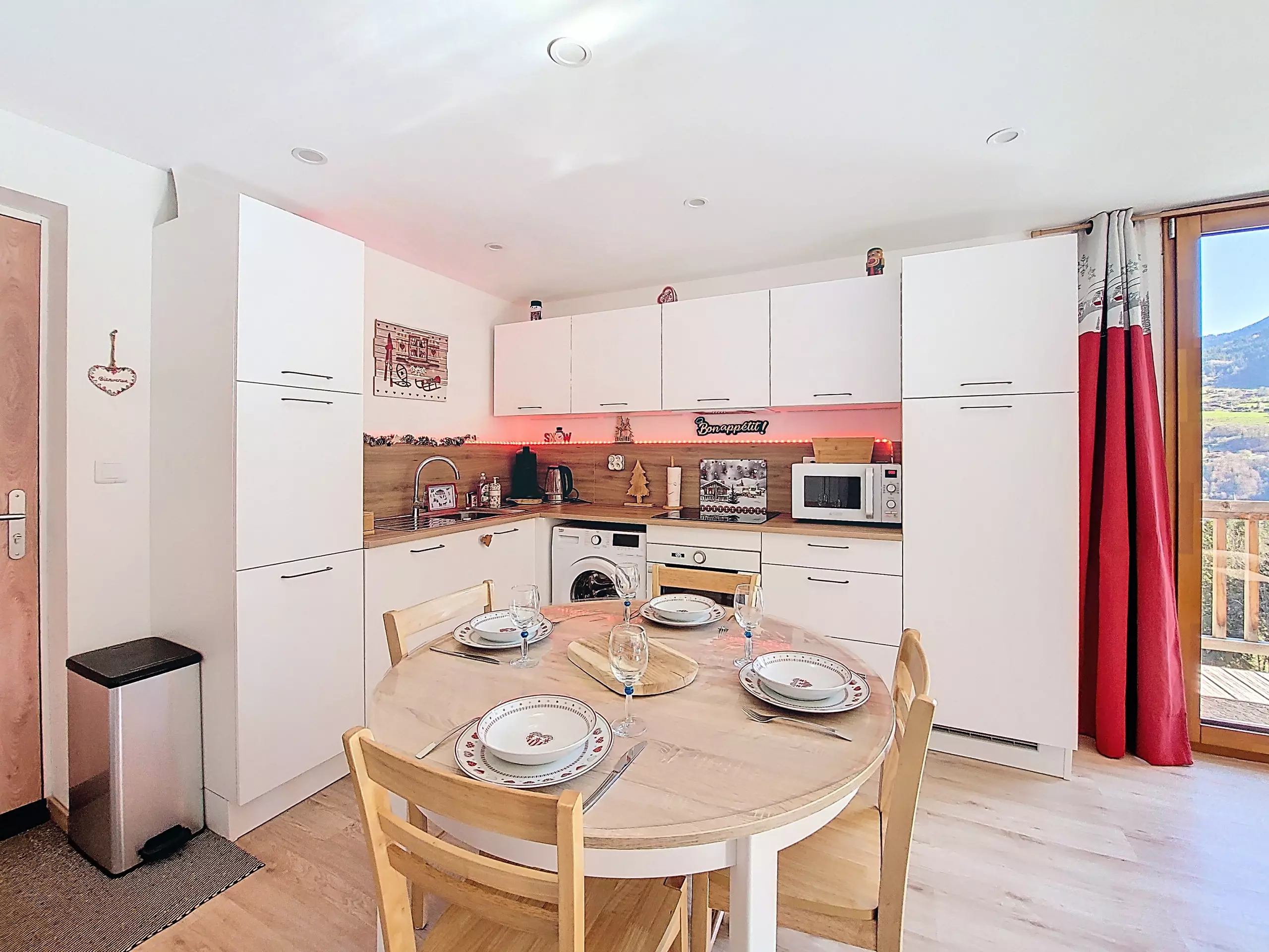 Upon arrival, you will be captivated by the brightness and welcoming atmosphere of the living area. The main space is organized around a fully equipped kitchen — induction hob, extractor hood, dishwasher, washing machine, refrigerator with freezer, oven, microwave, kettle, coffee machine — not forgetting the raclette, fondue, croque-monsieur and crepe maker appliances for sharing truly convivial moments after a day in the mountains.