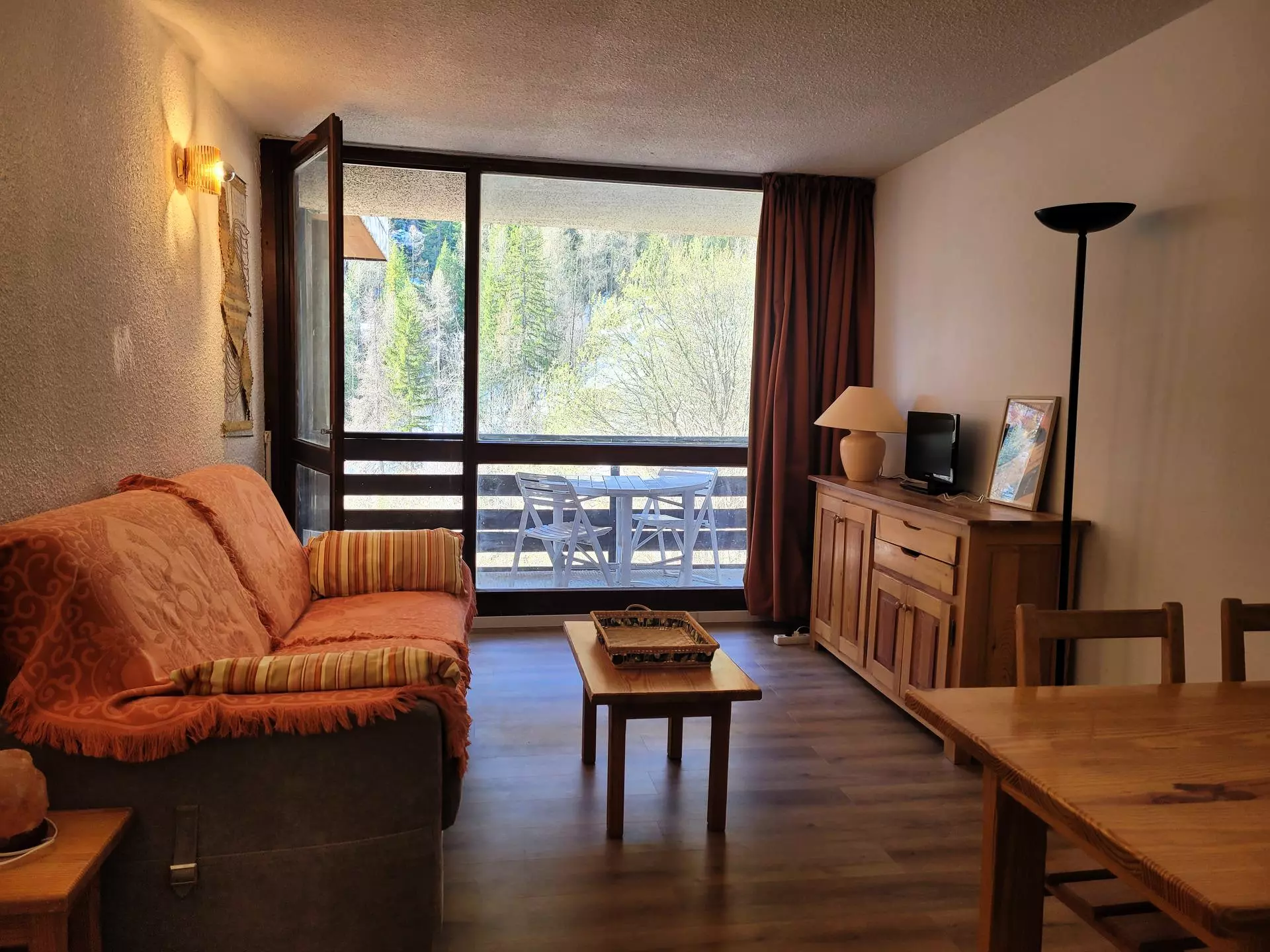 * Living room: 1 convertible sofa bed (Rapido type), HD TV, dining area, plenty of storage, balcony access;