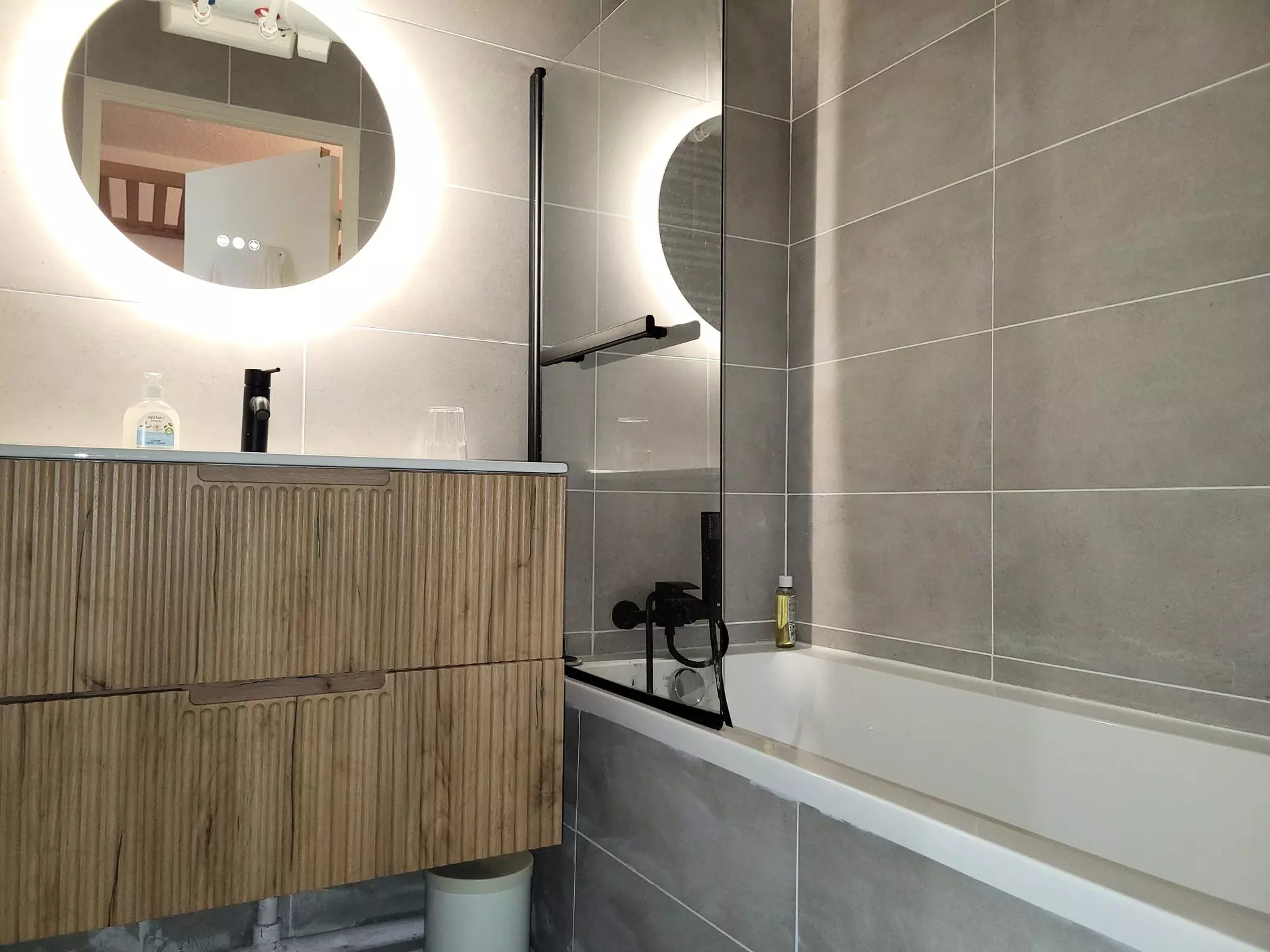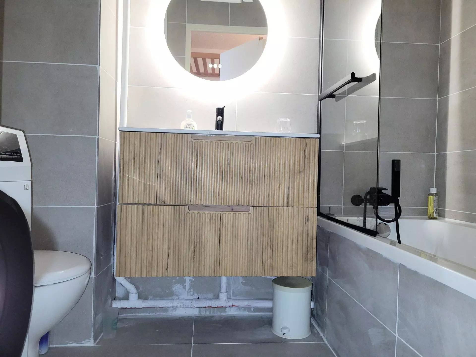 * Bathroom with bathtub, toilet and washing machine