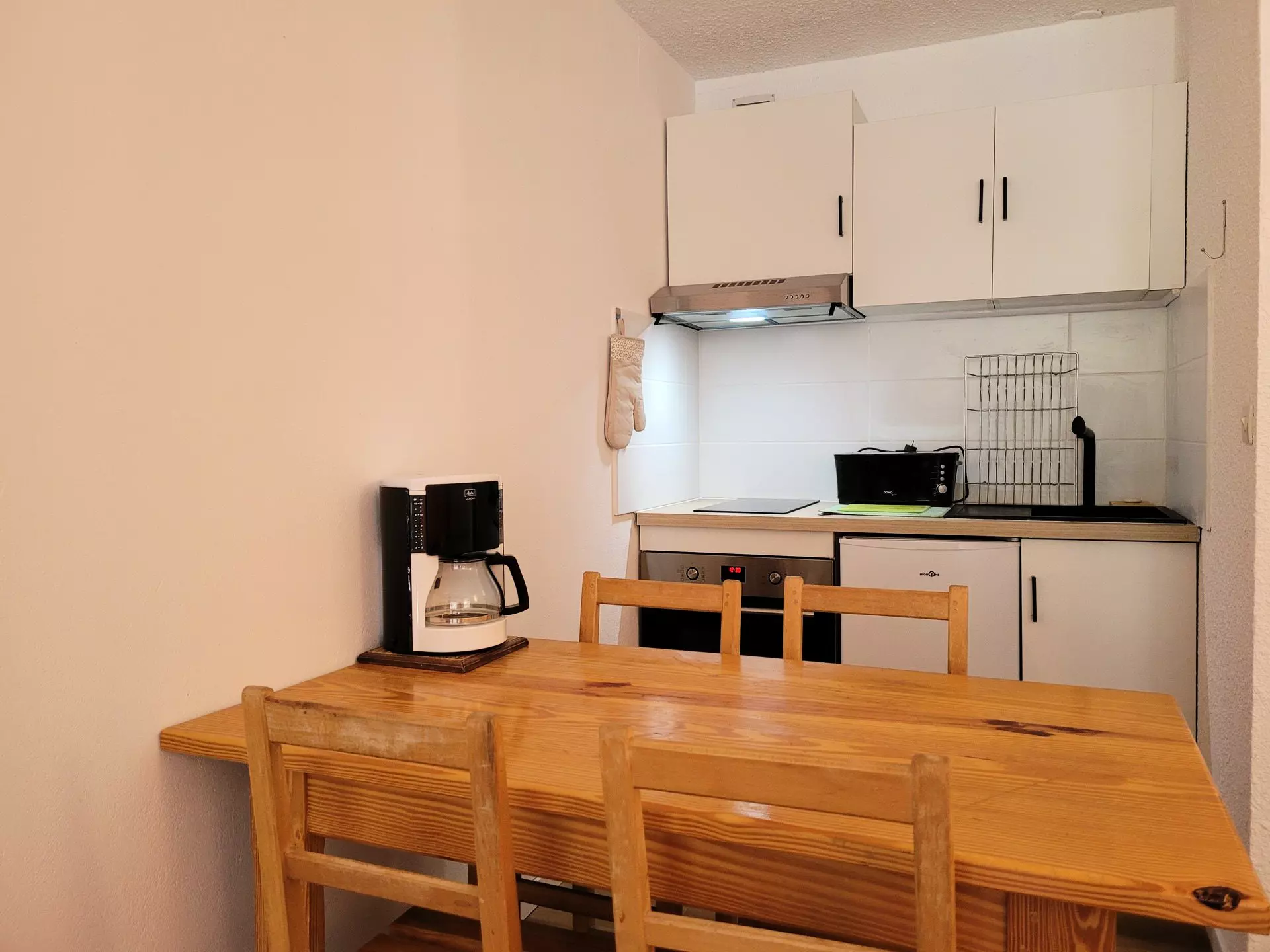* Kitchen area: Small refrigerator, 2 electric hobs, microwave, filter coffee maker, toaster,
