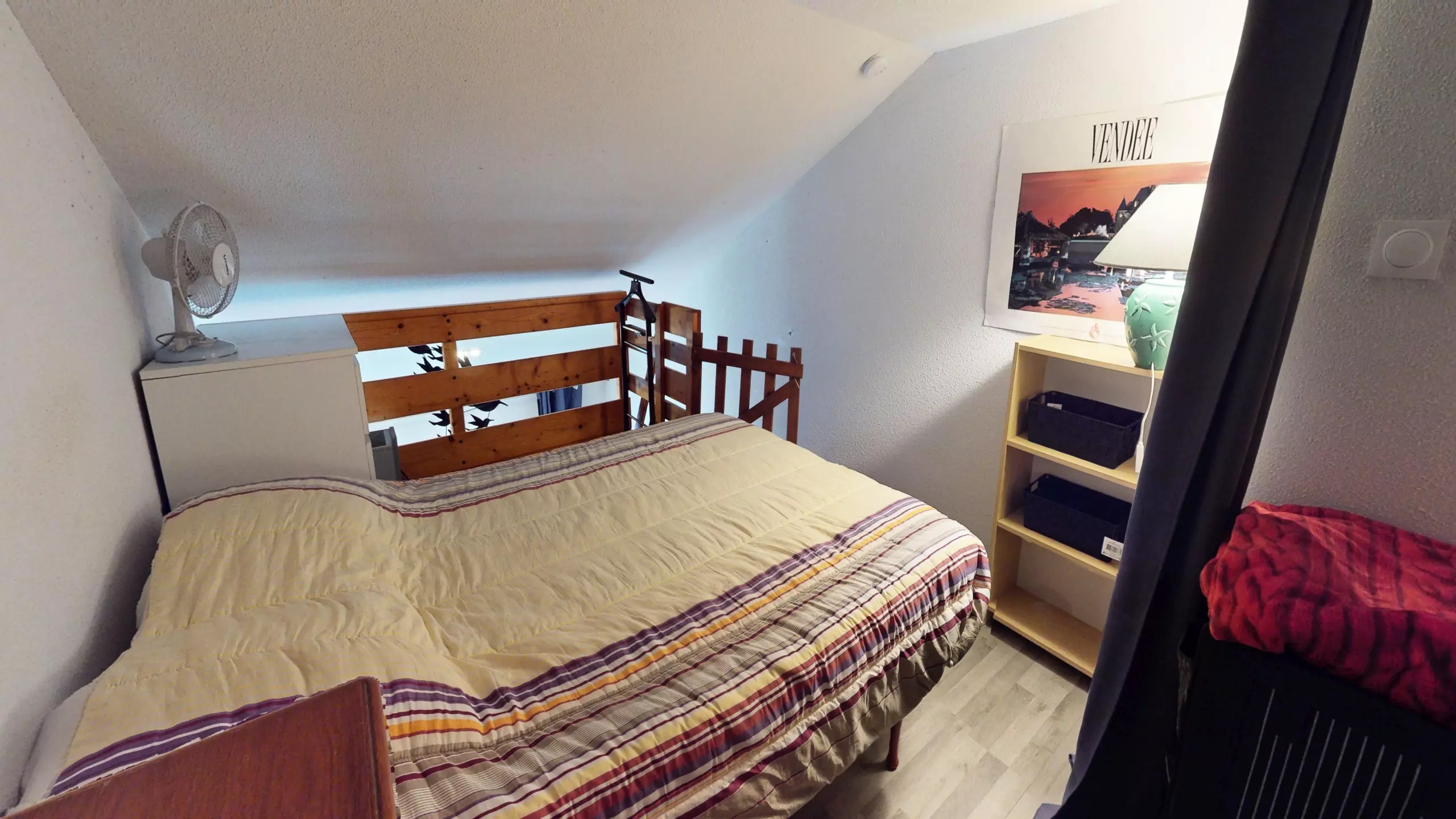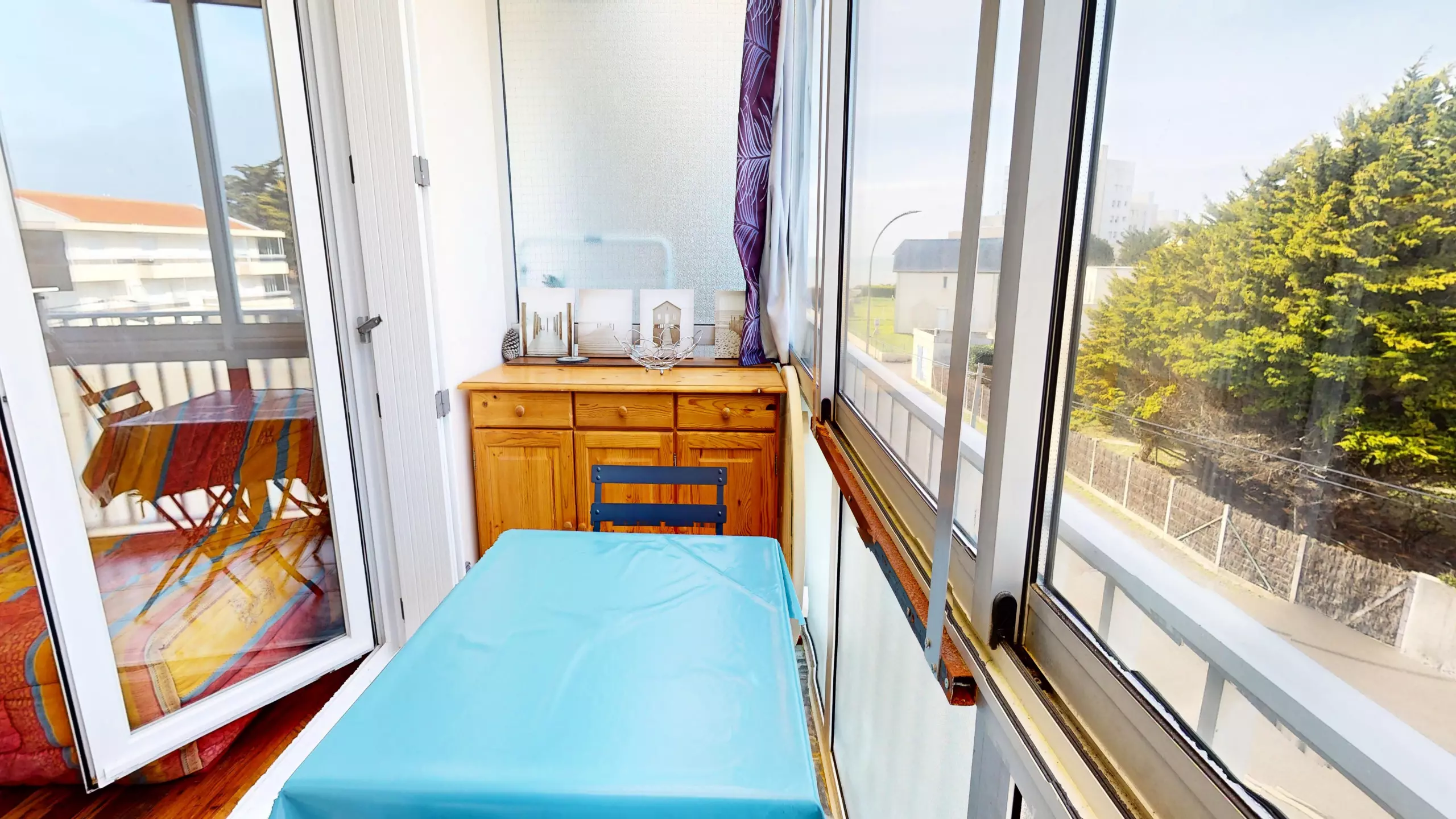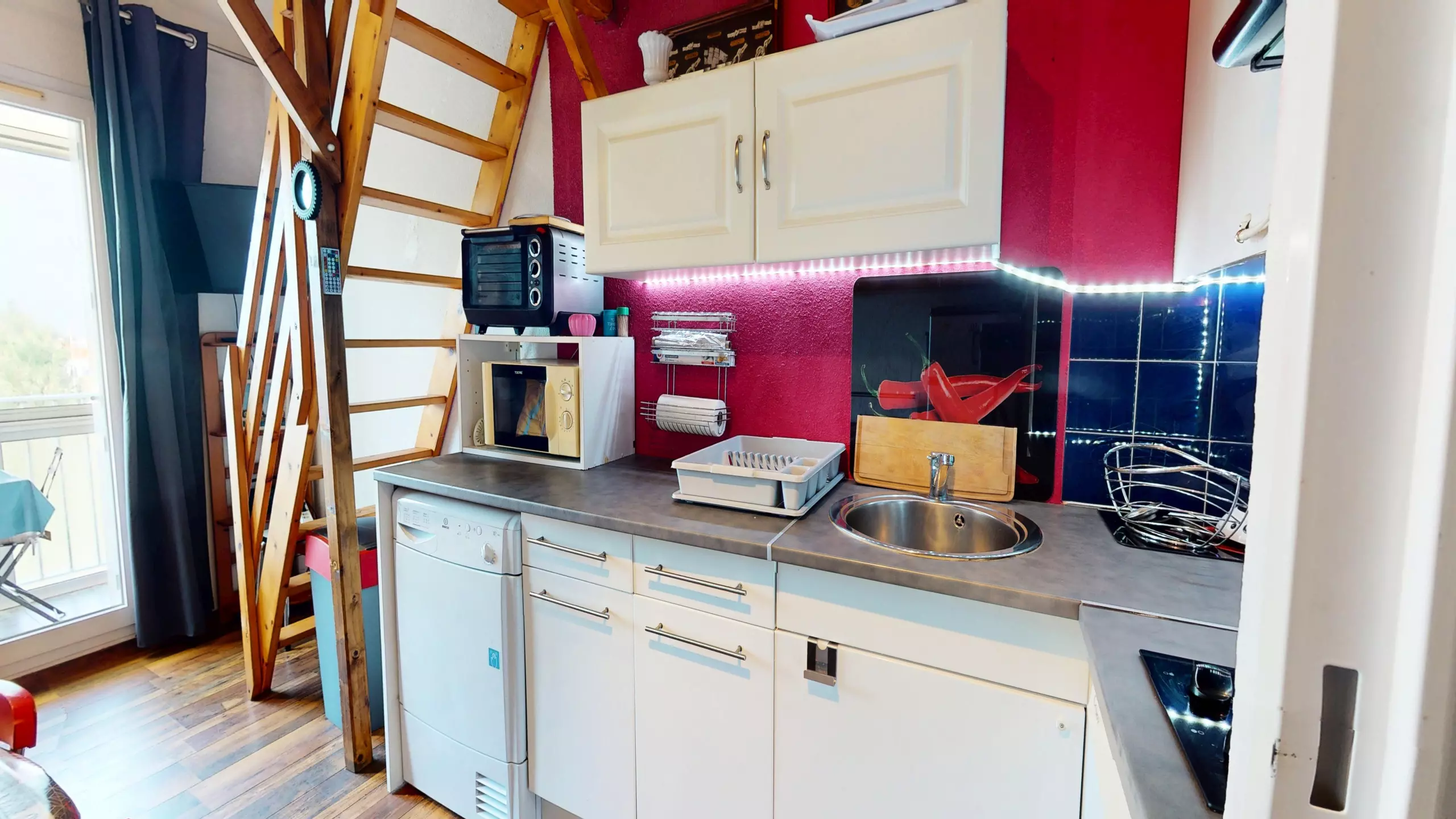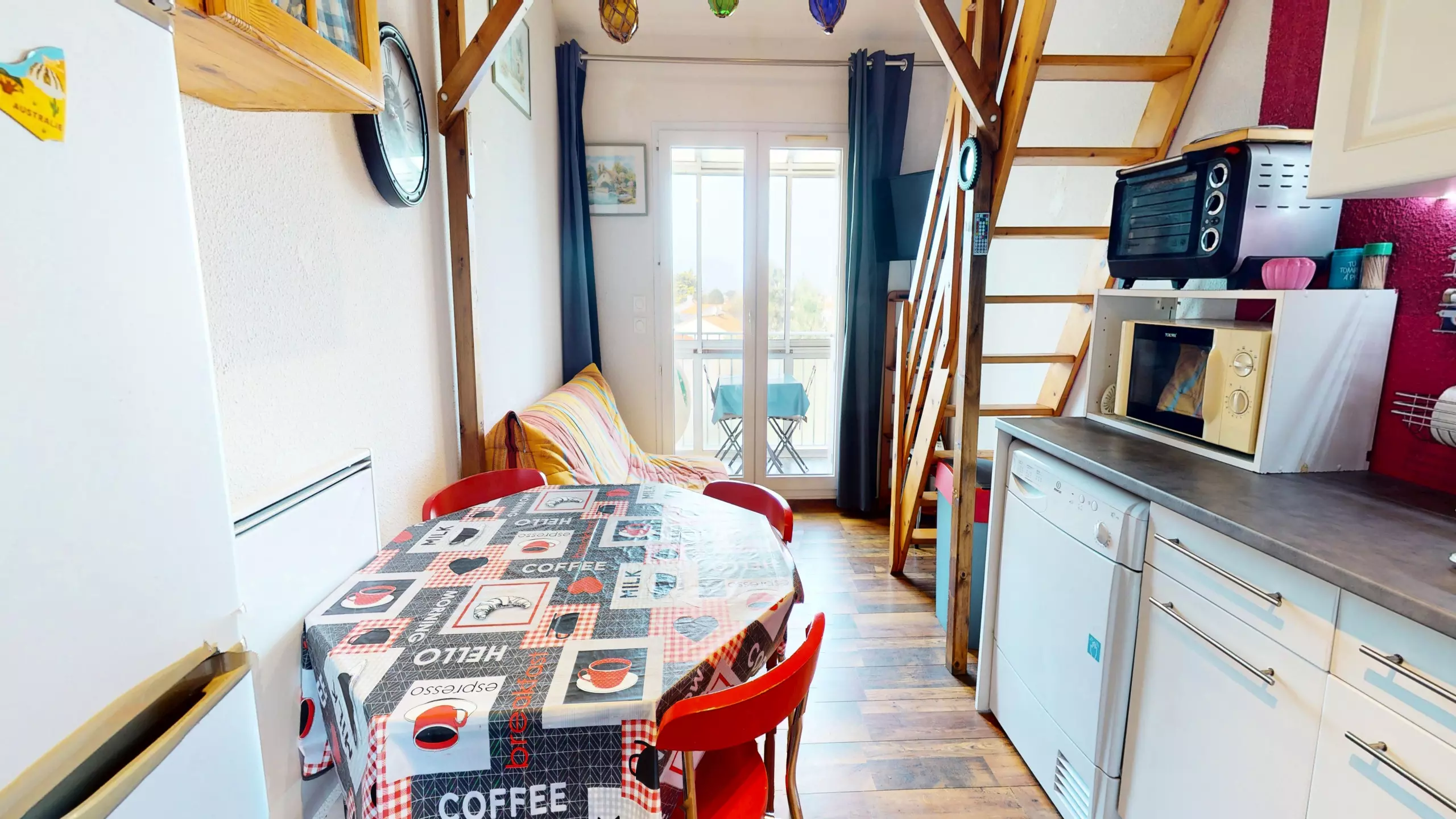 Head up to the sleeping area: a welcoming mezzanine houses two double beds (140x190cm), cleverly separated by curtains to ensure privacy. The highlight? The small loggia furnished with garden furniture. Turning to your left, you can glimpse the sea in the distance, a constant invitation to stroll to the shore just steps away.