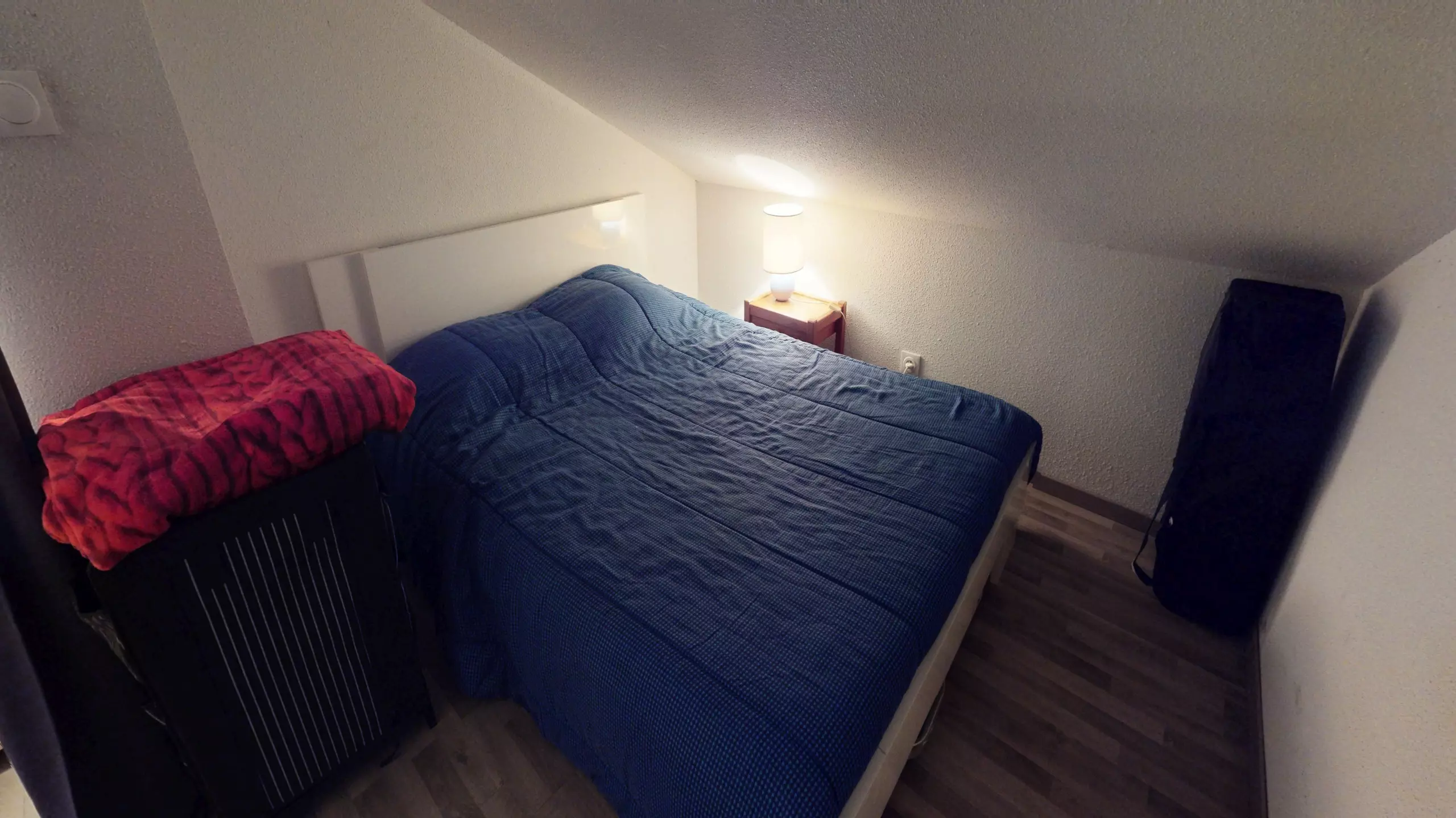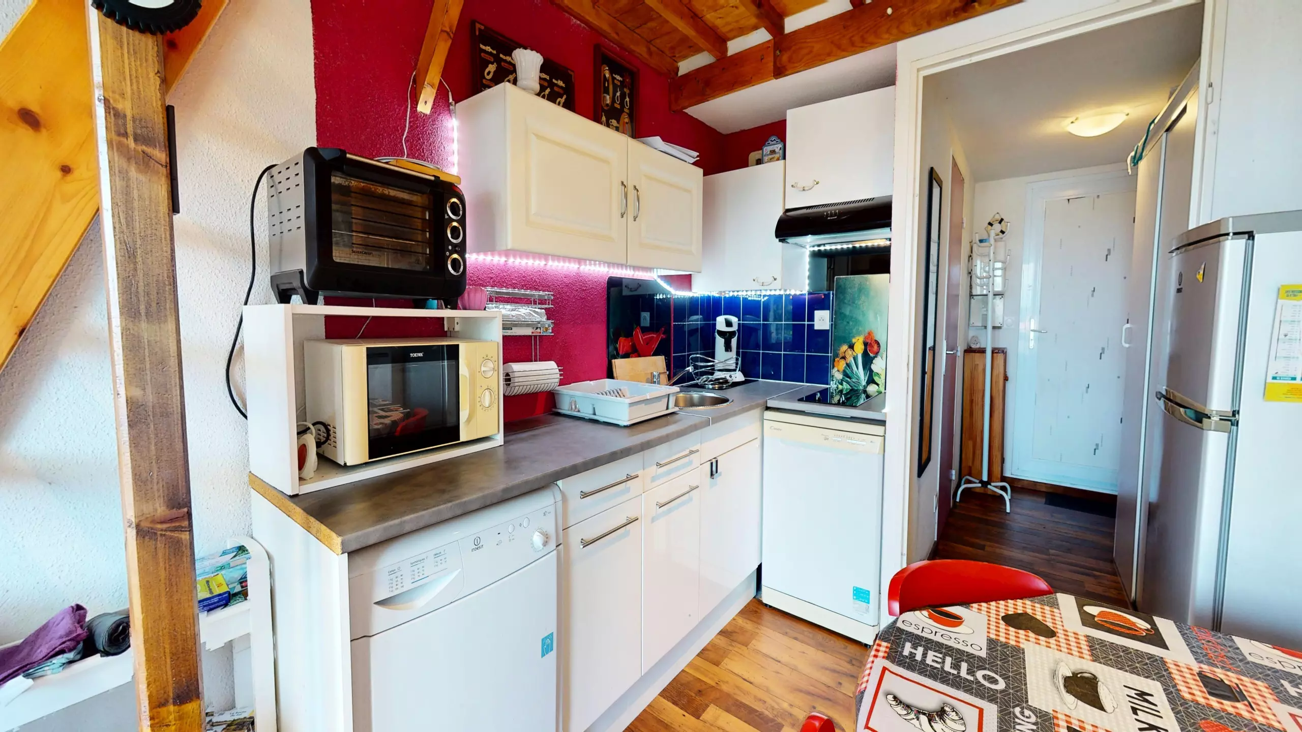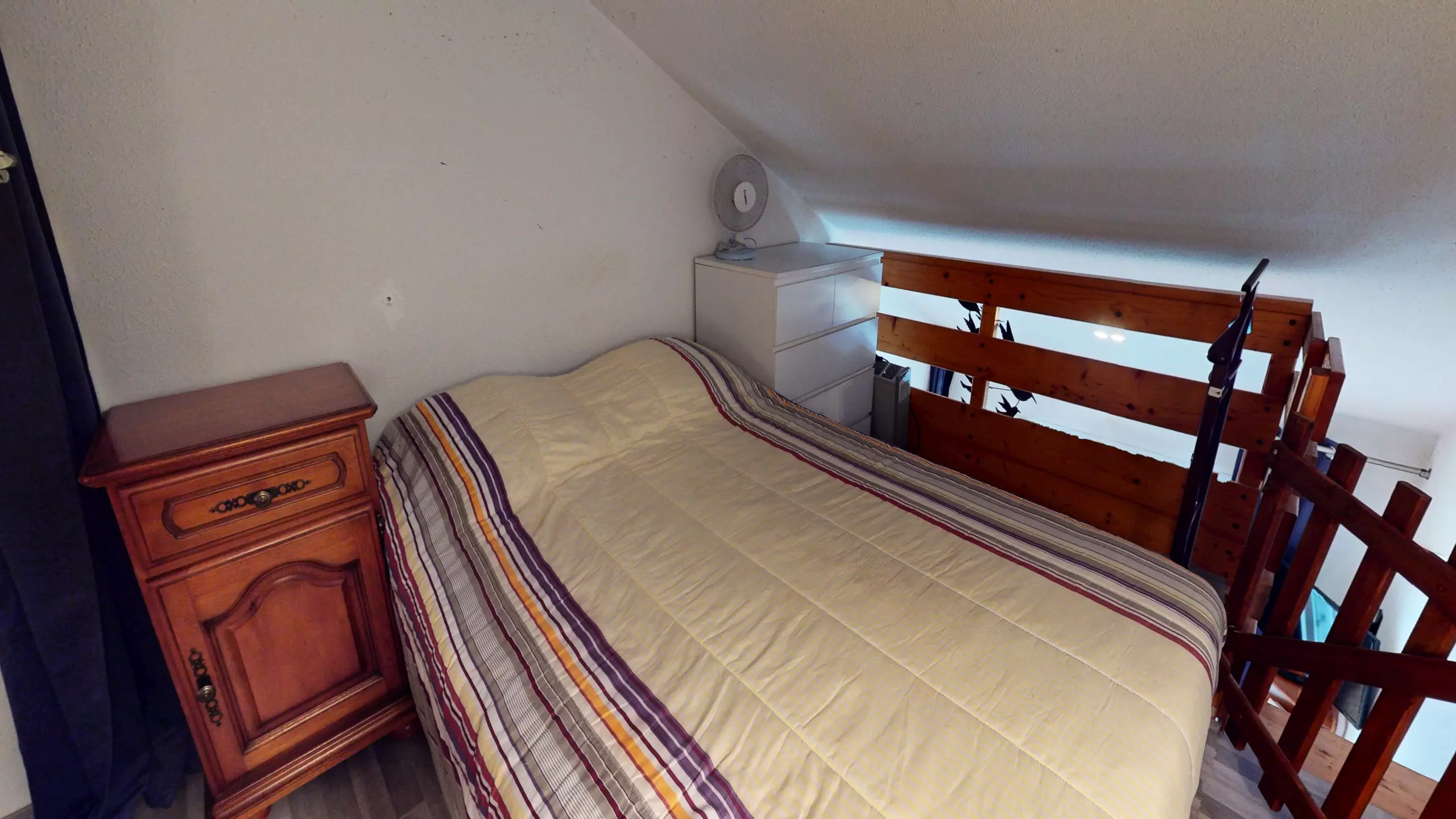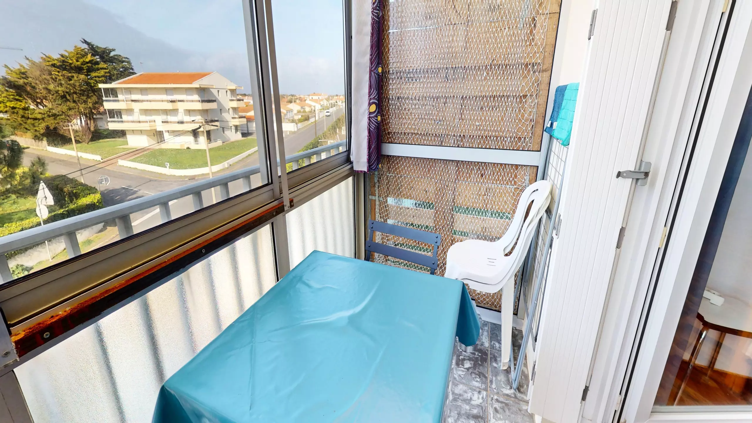 Head up to the sleeping area: a welcoming mezzanine houses two double beds (140x190cm), cleverly separated by curtains to ensure privacy. The highlight? The small loggia furnished with garden furniture. Turning to your left, you can glimpse the sea in the distance, a constant invitation to stroll to the shore just steps away.