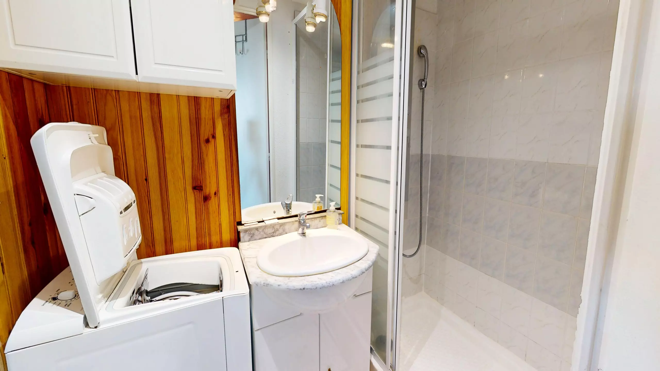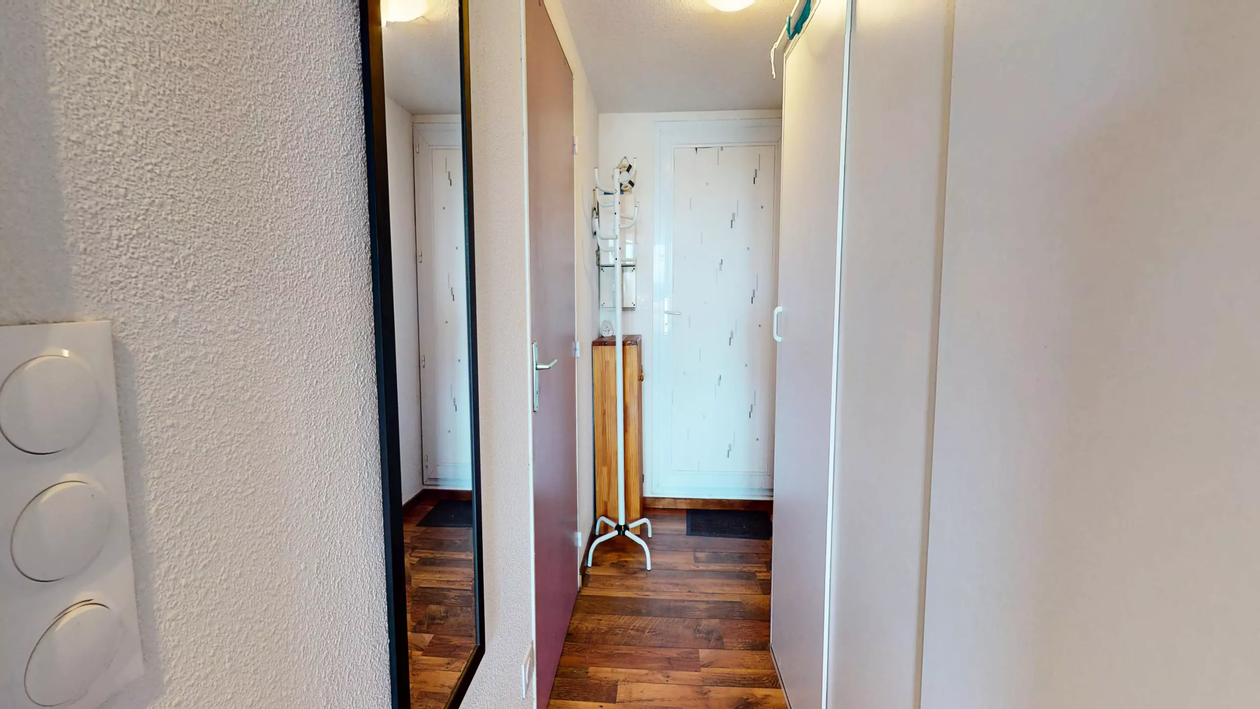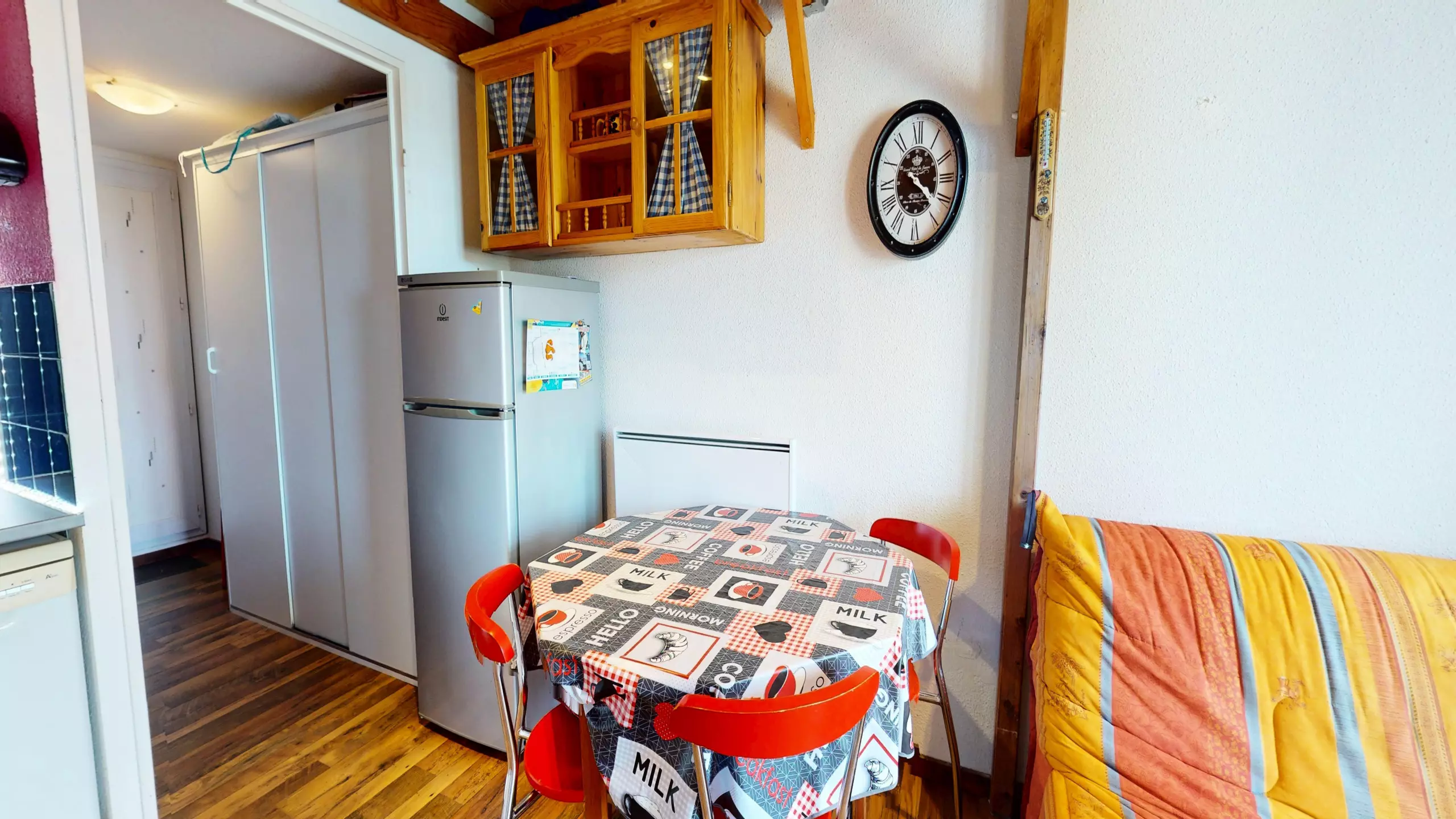 From the moment you step inside, the space is designed for your comfort: to your right, you'll find a functional bathroom with a shower and toilet. The heart of the studio then opens onto a beautiful, modern, and fully equipped open-plan kitchen (including induction hobs) so you can prepare your meals independently. Opposite, a lovely dining table awaits you for shared meals, followed by a cozy lounge area with a television, ideal for relaxing after a day of swimming.