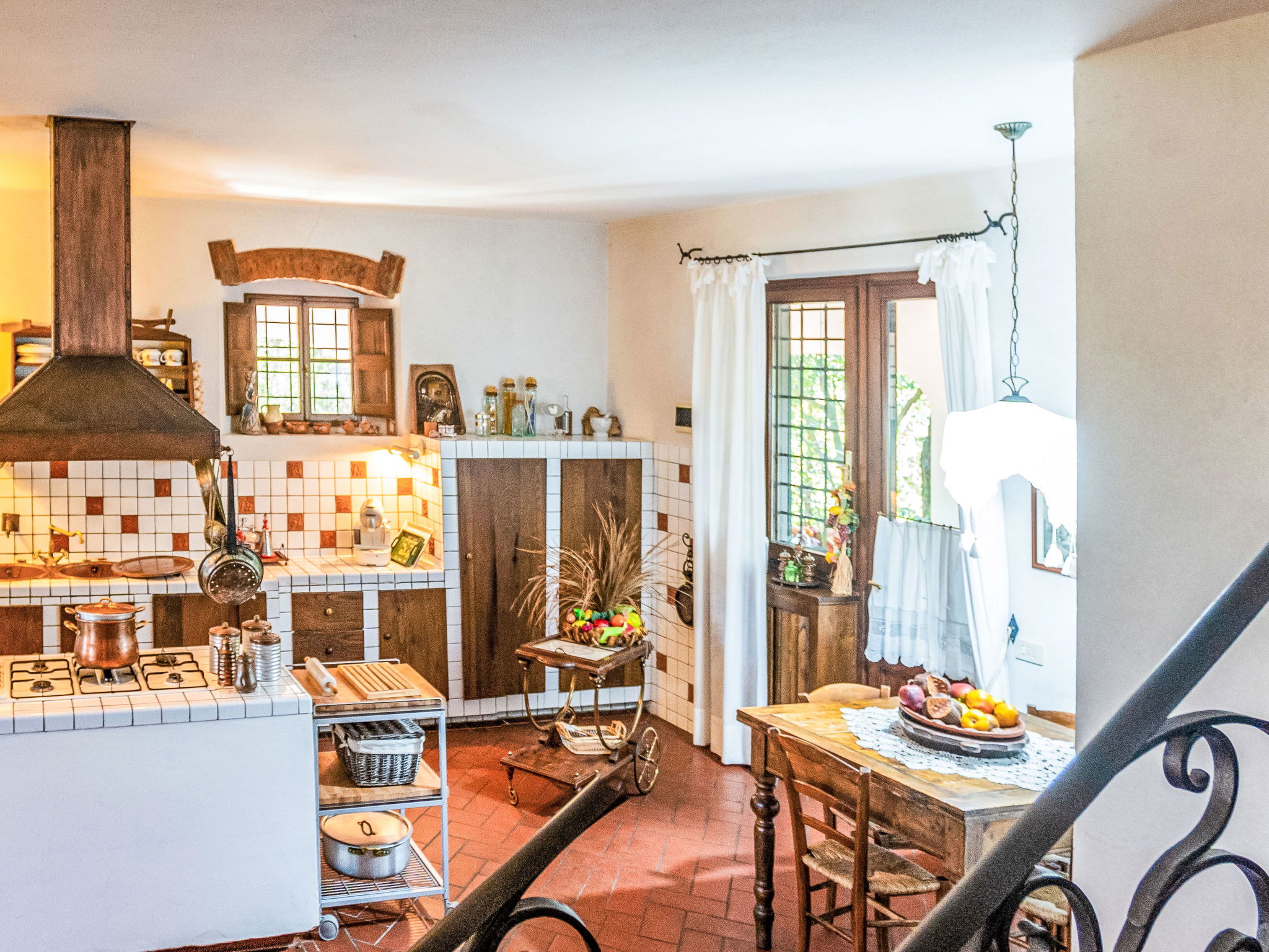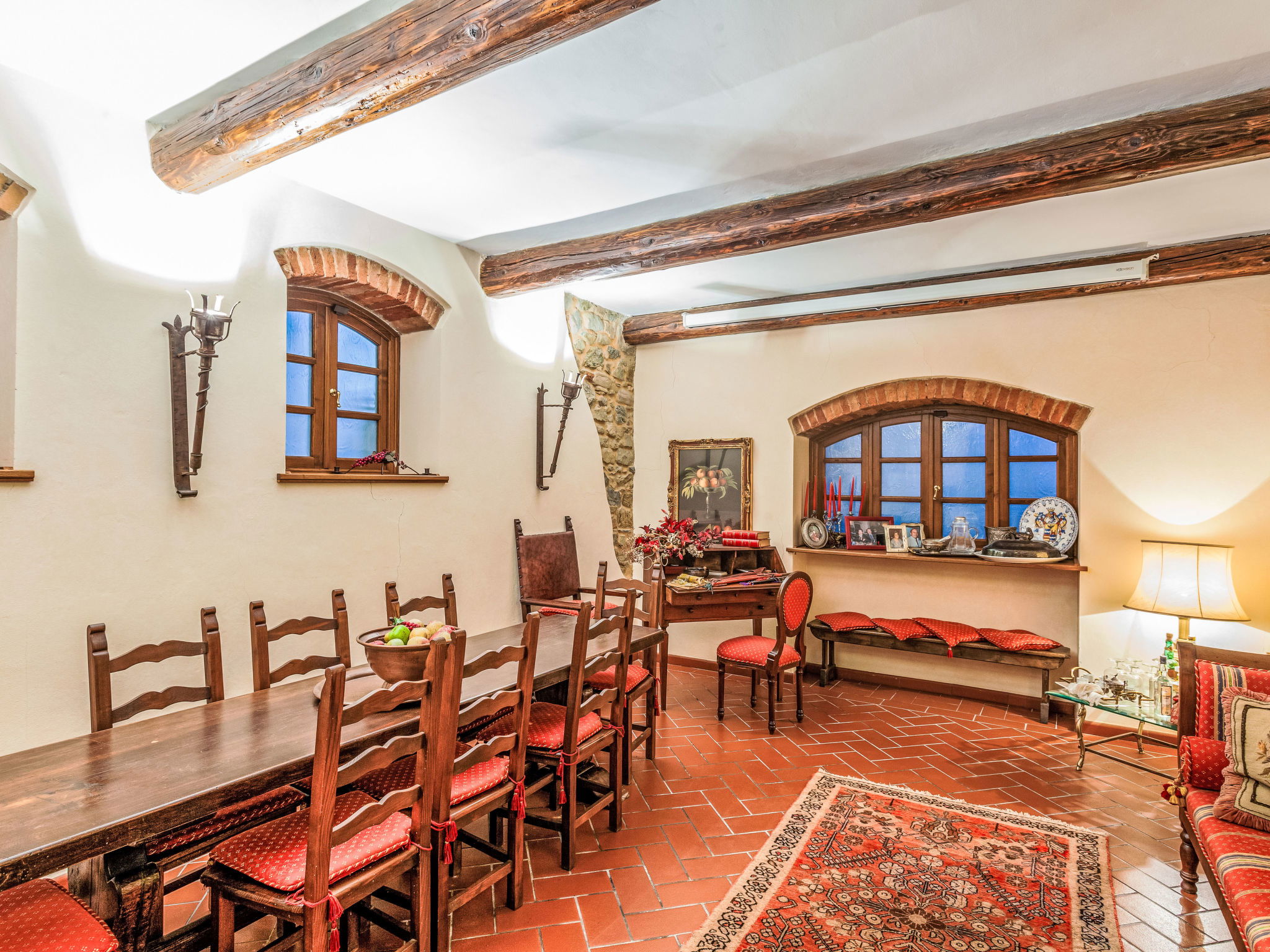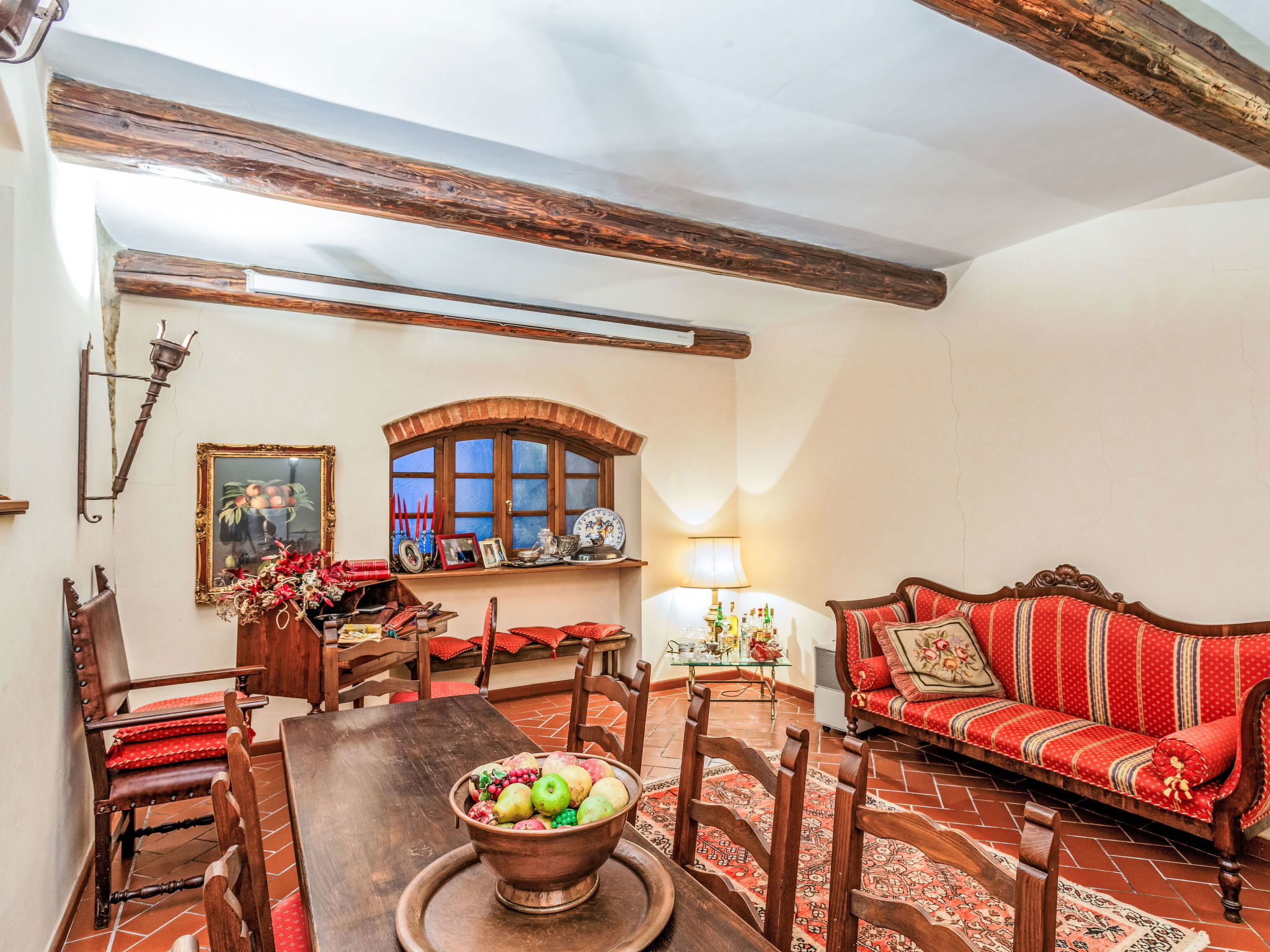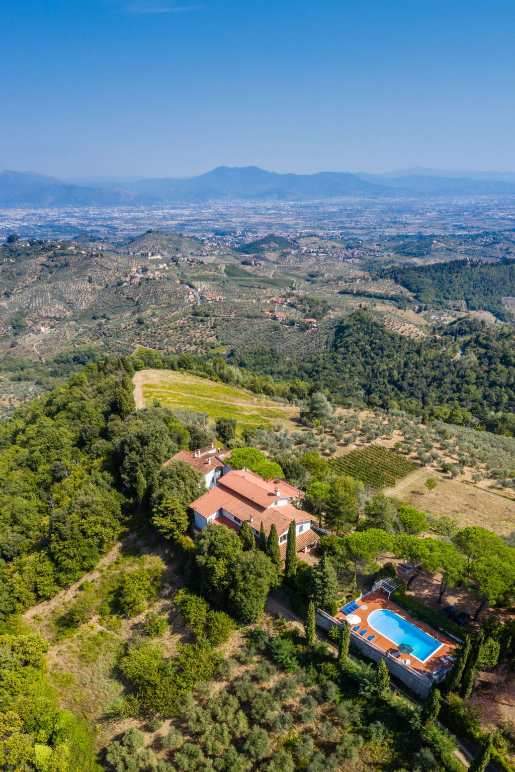 Large, cosy villa "Villa Colle Mediceo", 400 m a.s.l., 2 storeys, detached, built in 1500, renovated in 1996, surrounded by trees, fields and vineyards. In the district of Fornia 5 km from the centre of Carmignano, in a quiet, sunny position. Private: property 3 ha (fenced), natural garden 300 m2 (fenced), swimming pool (13 x 7 m, depth 130 - 210 cm, seasonal availability: 15.May. - 30.Sep.). Outdoor shower, arbour, garden furniture. In the house: table football, washing machine. 800 m long bumpy motor access. Parking (for 4 cars) on the premises. Grocery 5 km, supermarket 5 km, shopping centre 5 km, restaurant 800 m, bar 5 km, bus stop 5 km. Nearby attractions: Firenze 30 km, Casa di Leonardo Da Vinci 15 km, Torre di Pisa 70 km.