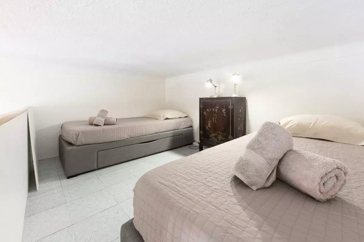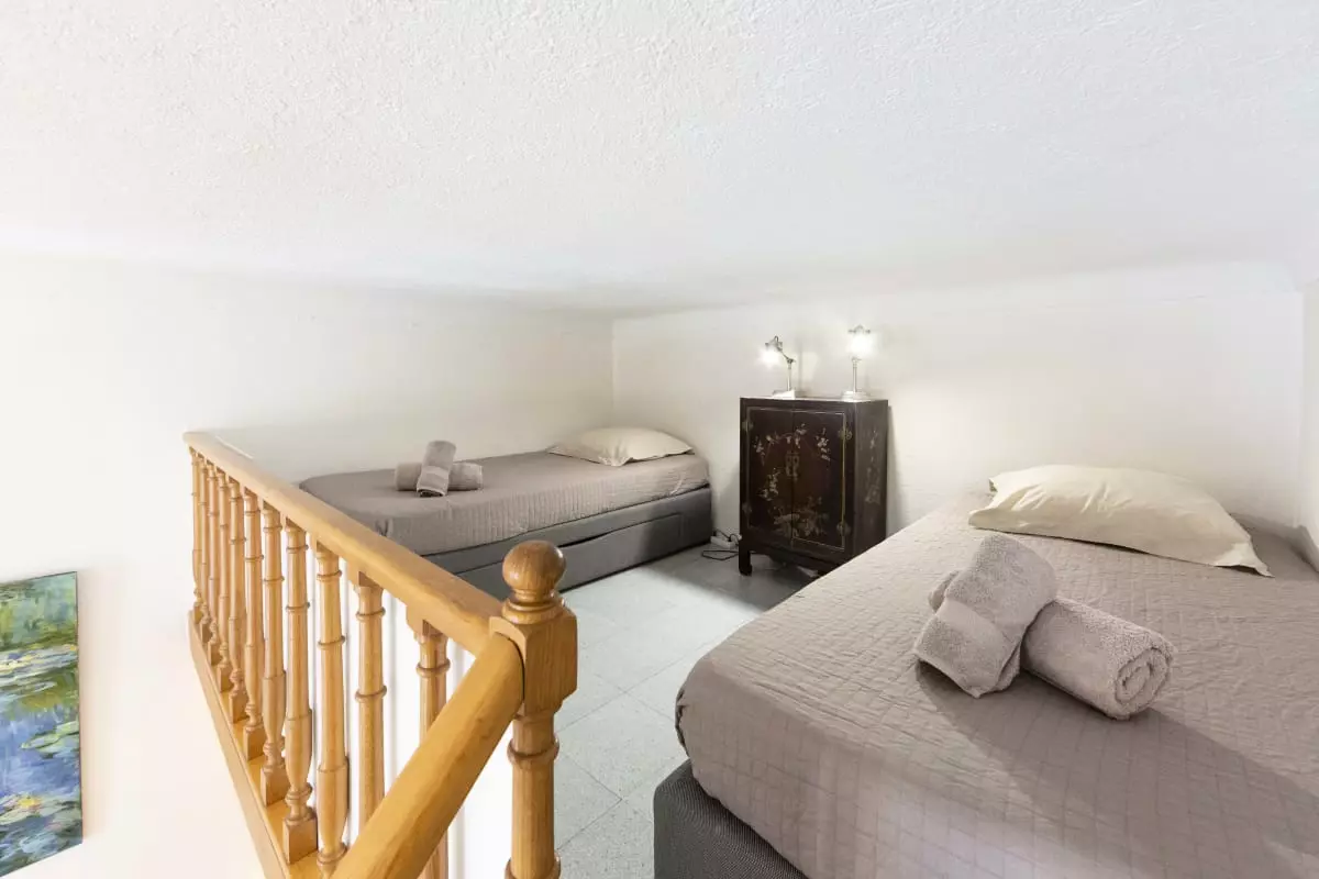 1 open mezzanine bedroom with 2 single beds (90cm) that can accommodate 2 people,