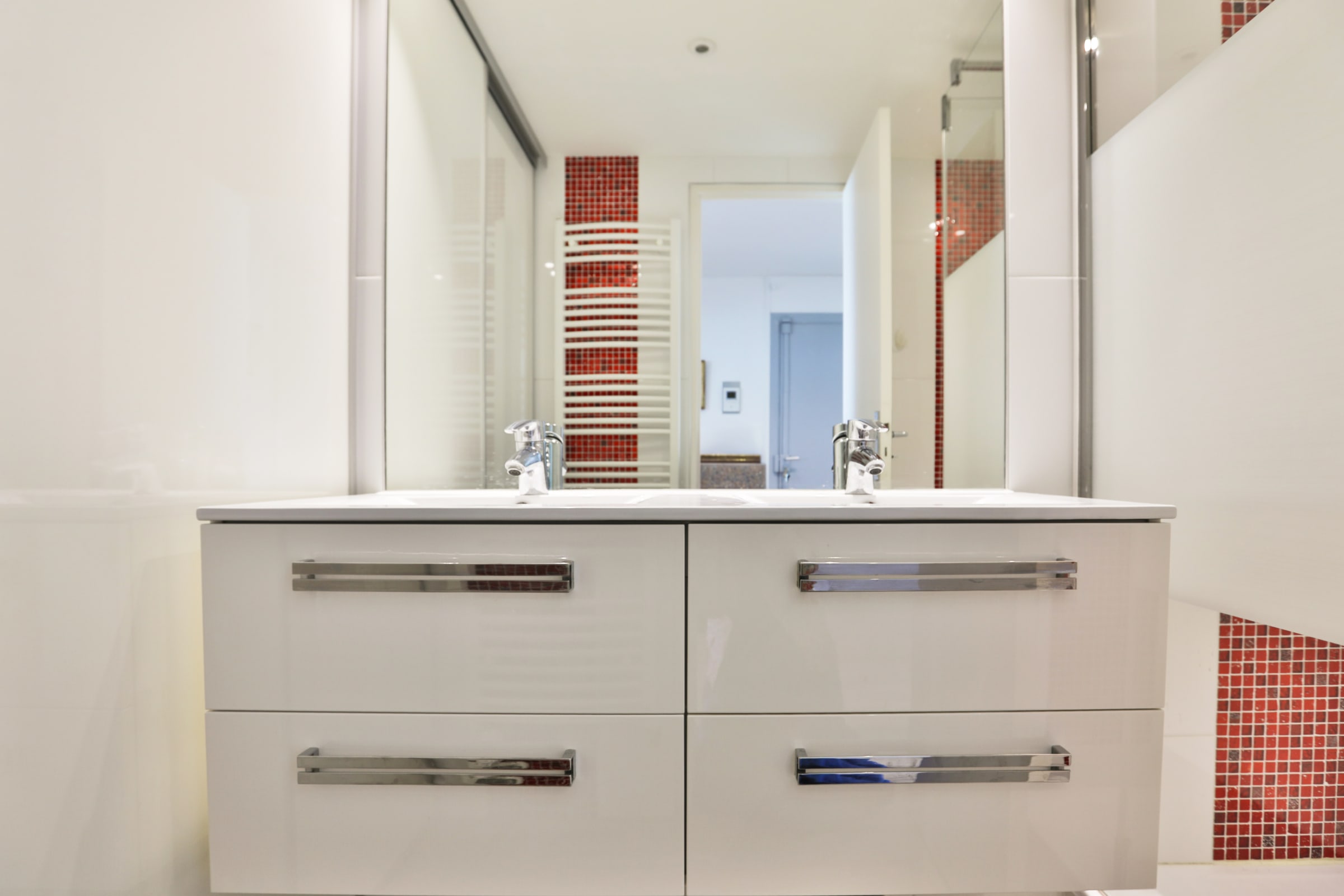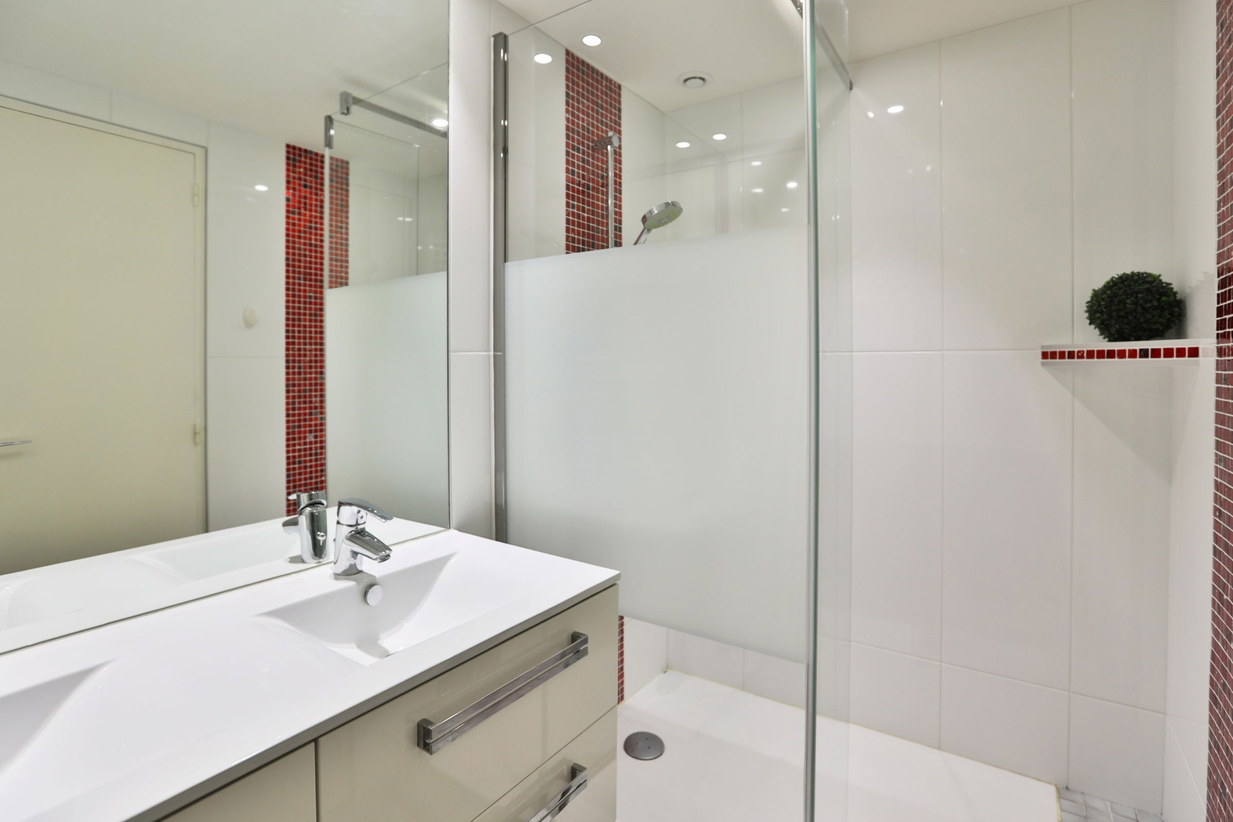 - d'une salle de bain avec douche, double vasque, sèche serviettes et sèche cheveux