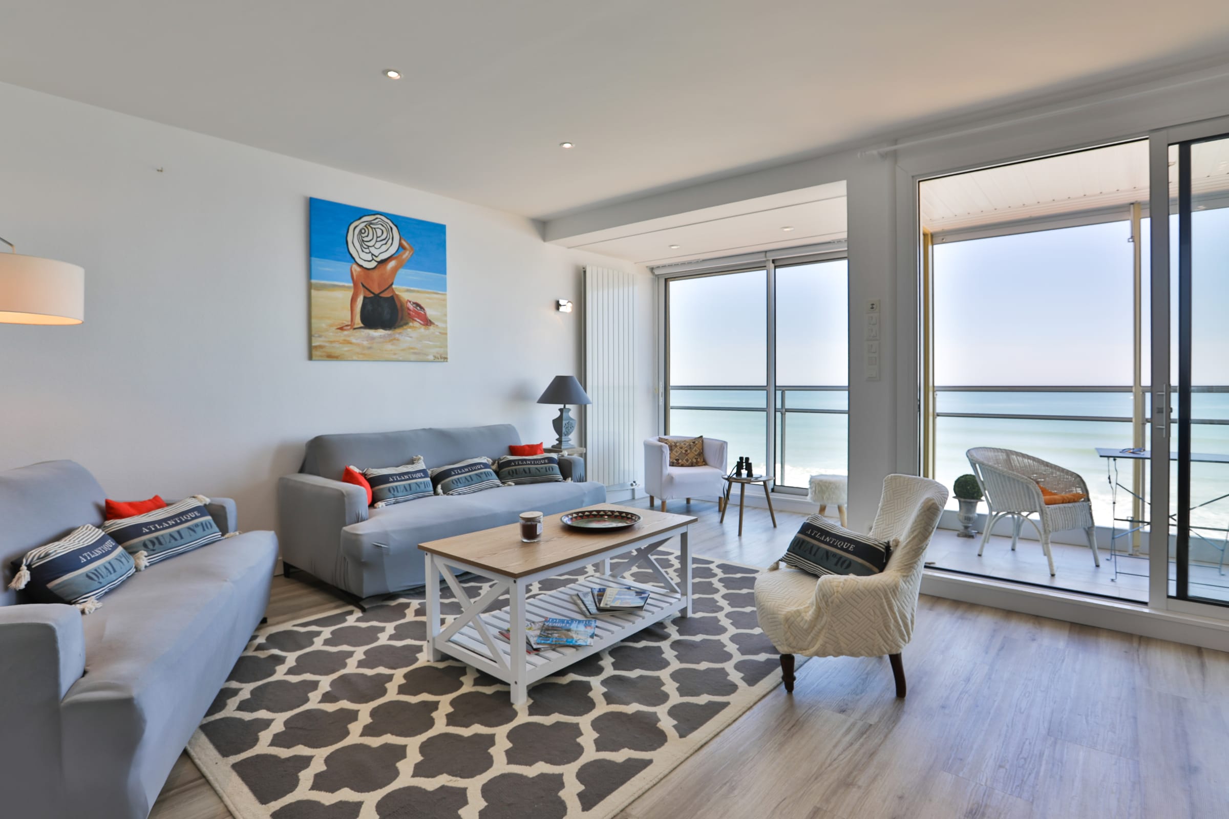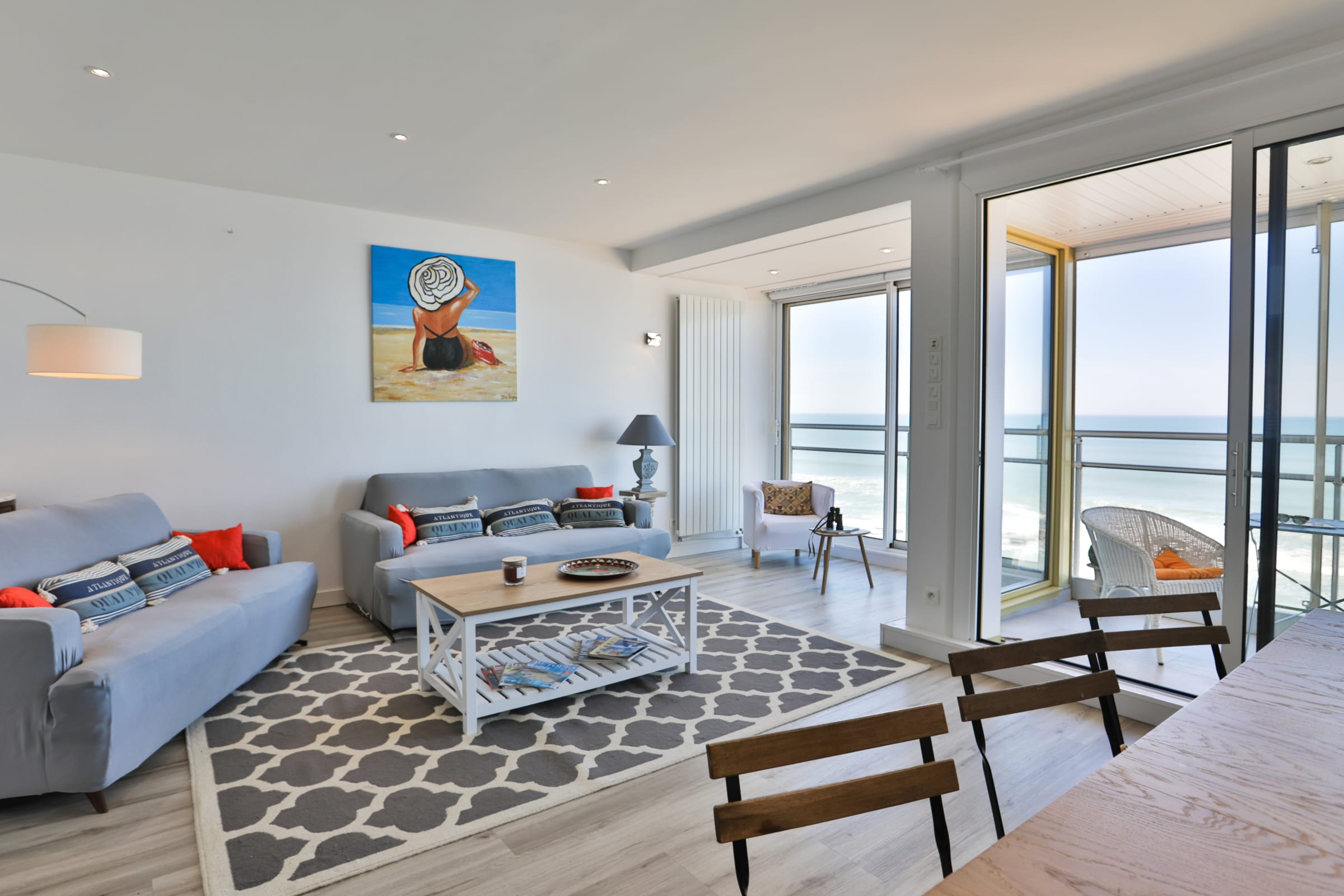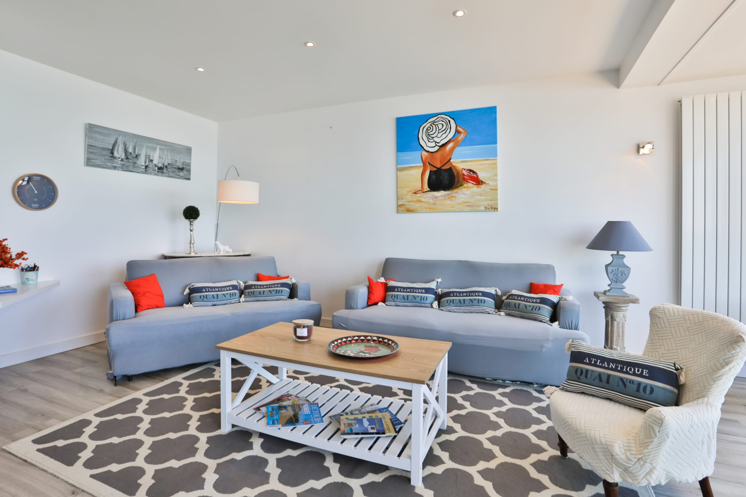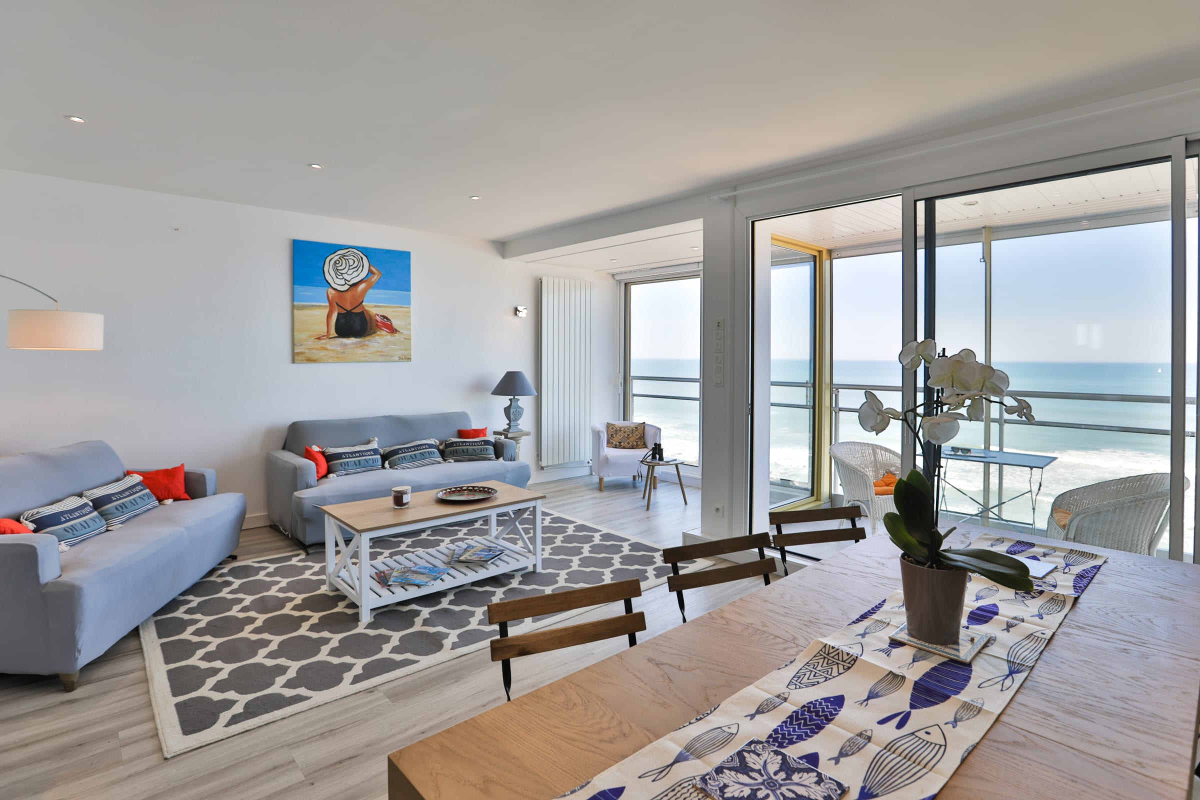 Depuis la pièce de vie, la vue s'étend sur les rochers, l'océan, la jetée et le phare… un cadre plaisant à contempler tout au long de la journée.