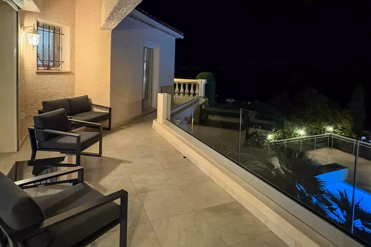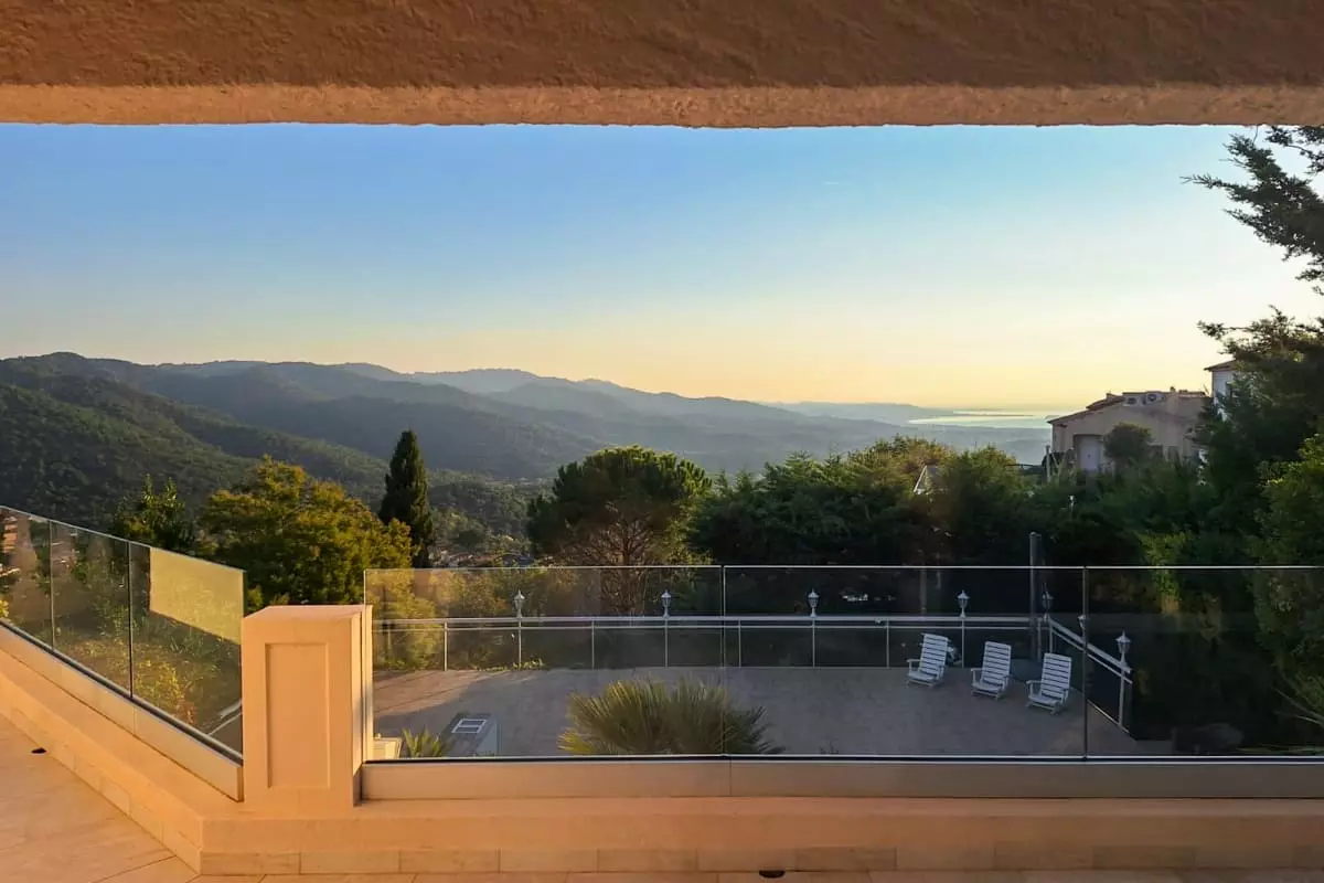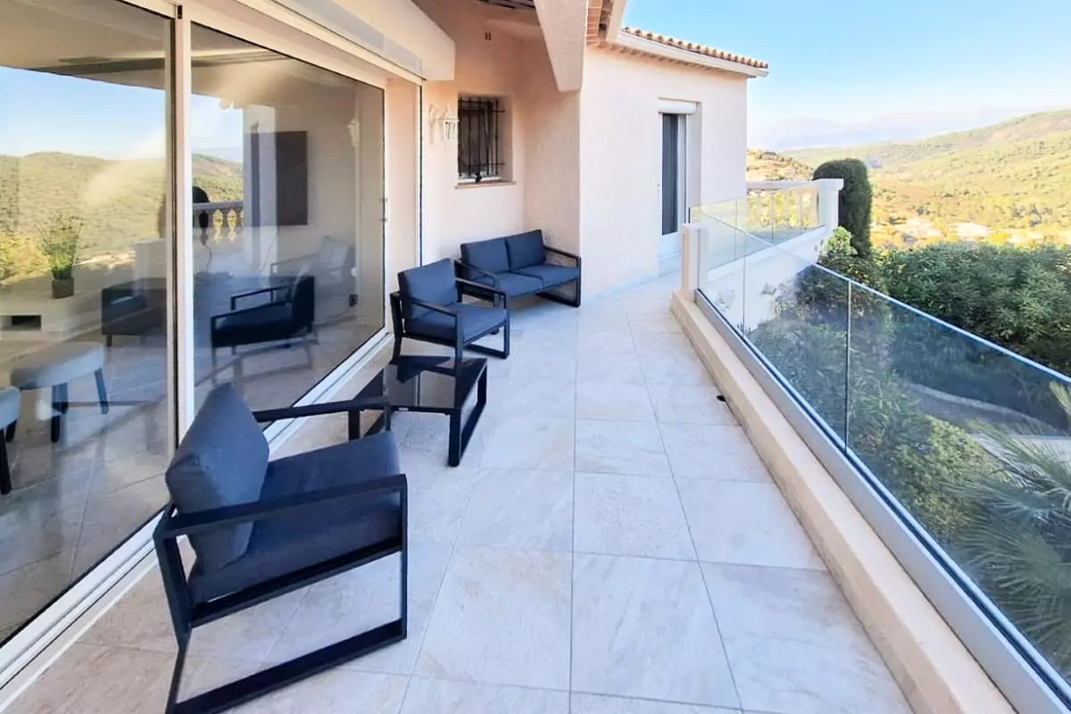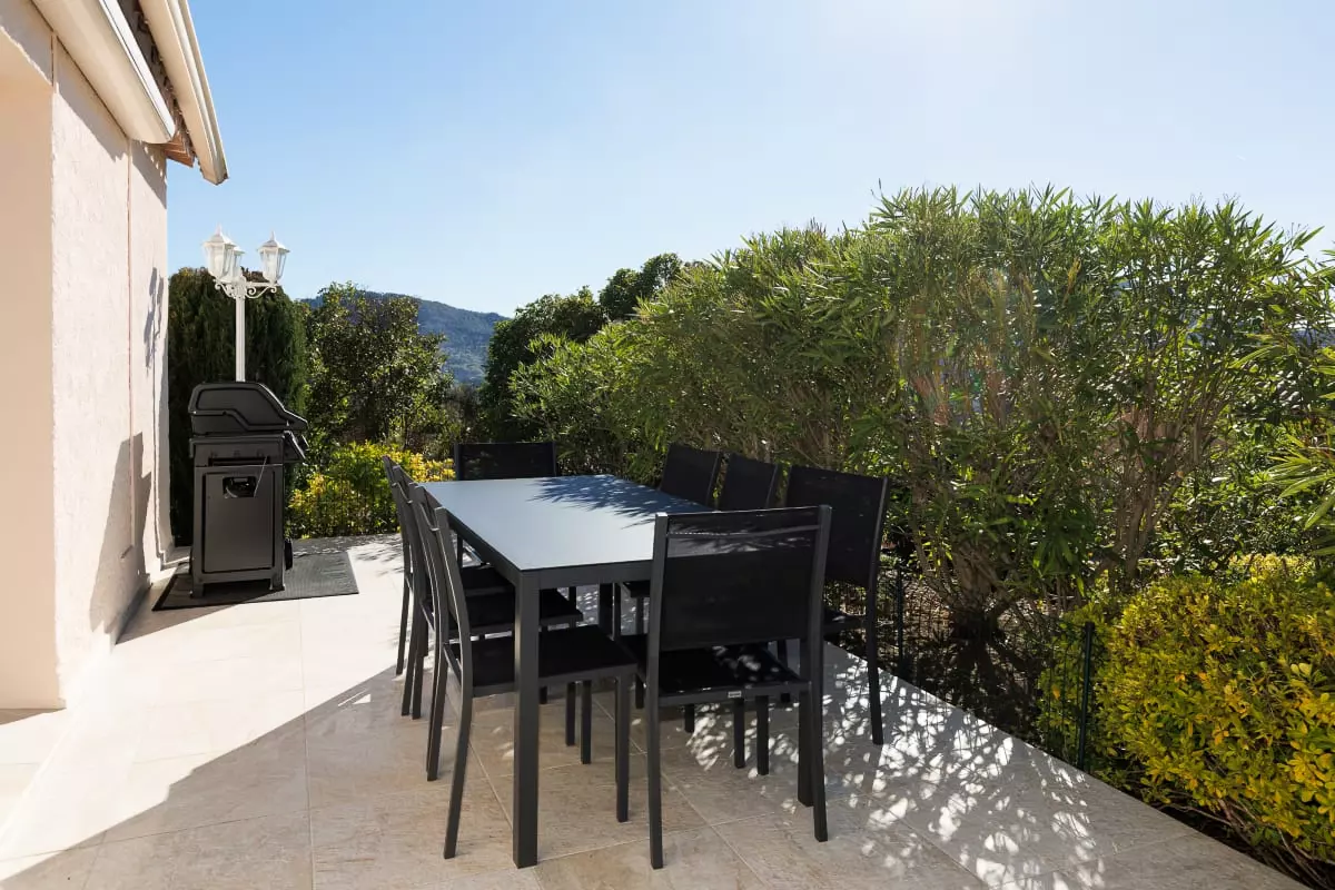 A relaxing terrace with magnificent views of the sea and the Estérel mountains, furnished with garden furniture.
