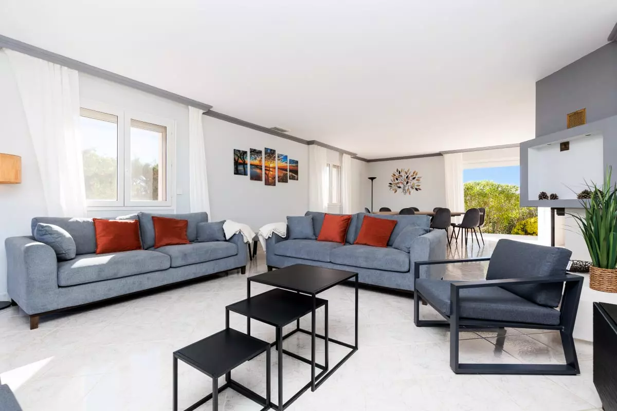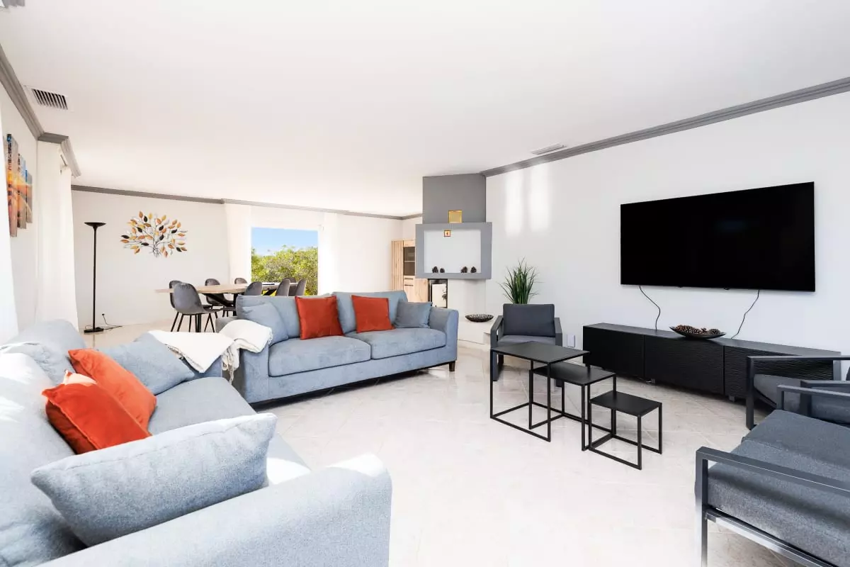 - Large, warm and comfortable 55 m² air-conditioned living room with 2 large sofas, two armchairs, flat screen TV and internet box, as well as a dining area.