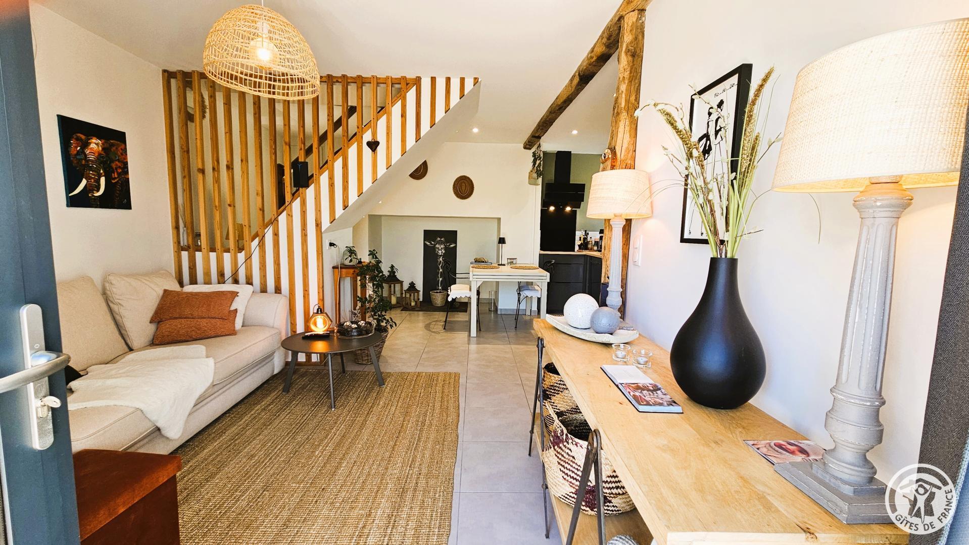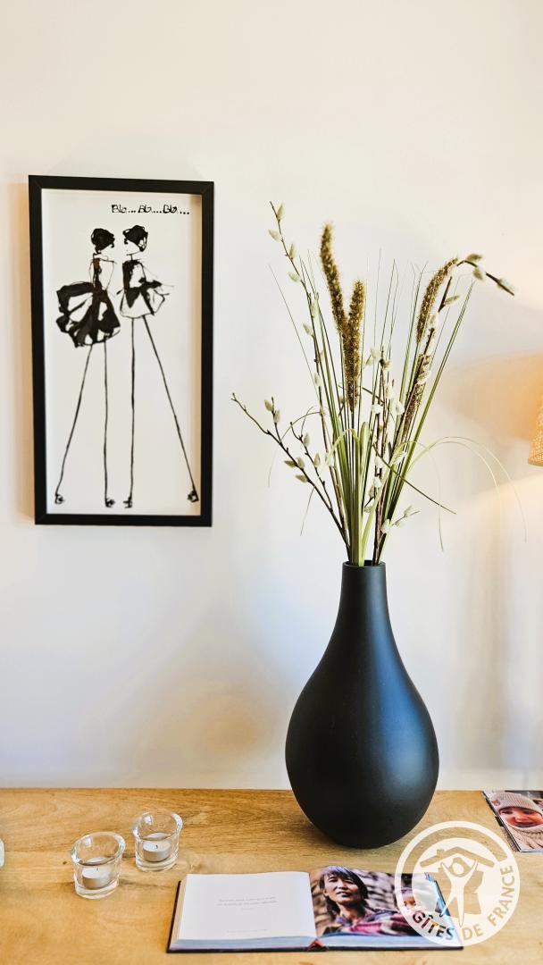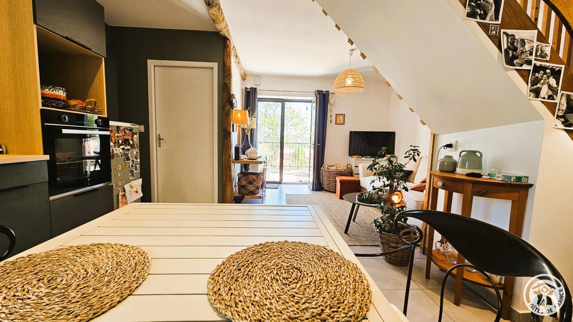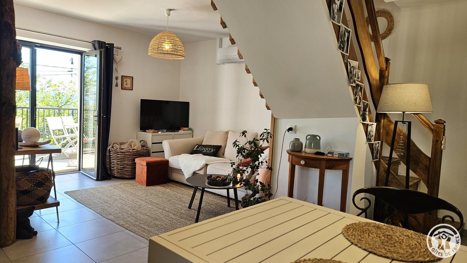 From the moment you step inside, a soothing atmosphere invites you to relax. The bright living room has been designed for the comfort and simplicity of stays for two: a fully equipped open-plan kitchen, a cozy living room, and harmonious decor create a space where you immediately feel at ease.