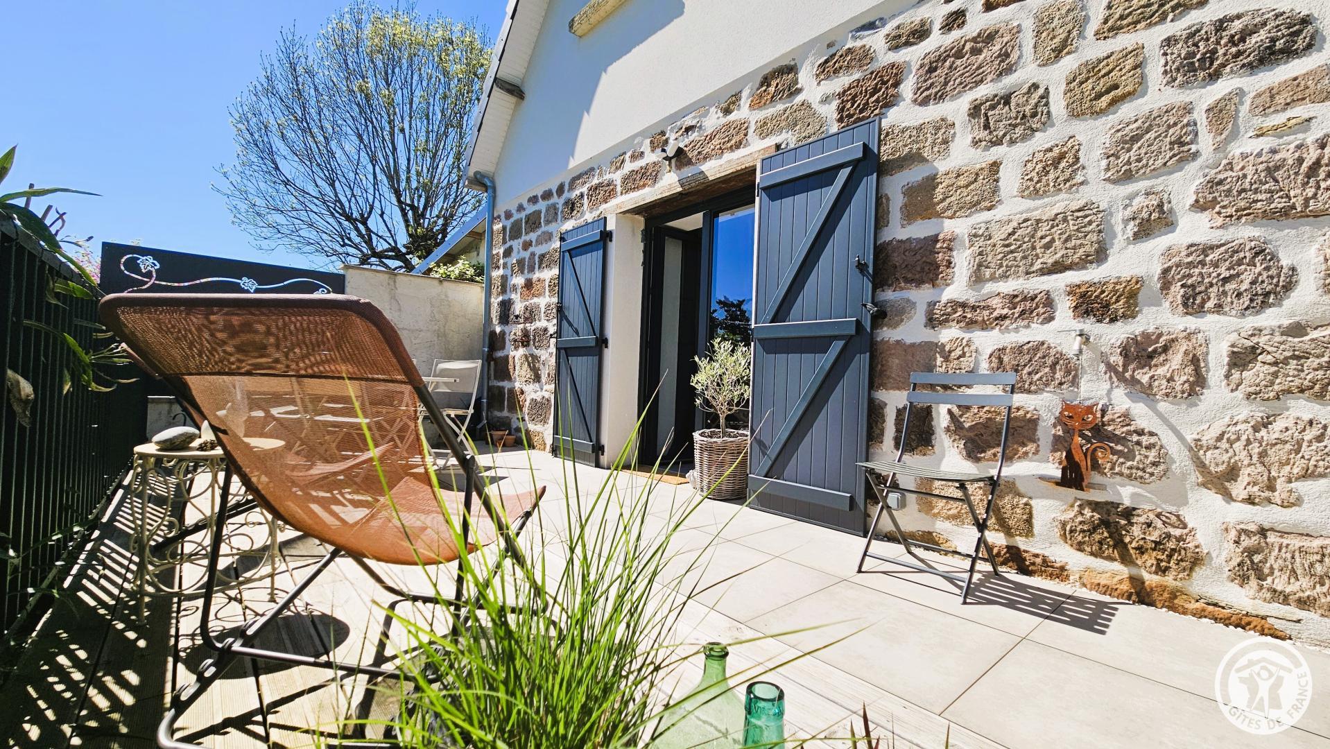 Outside, the private terrace, directly accessible from the entrance of the cottage, pleasantly extends the living space. Access to the house is via this outdoor area, offering a unique and welcome arrival that immediately sets the tone for the stay: a place open to the outdoors, ideal for relaxation and enjoying sunny days.