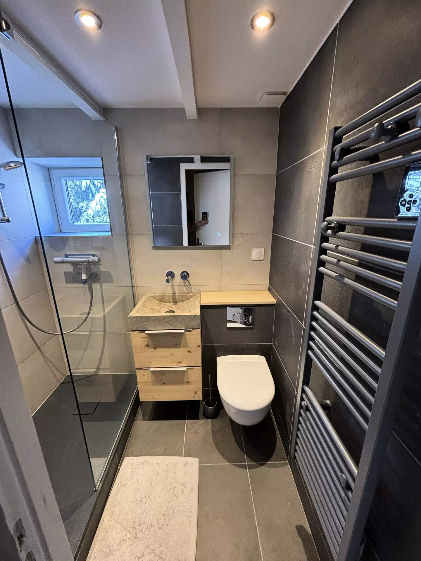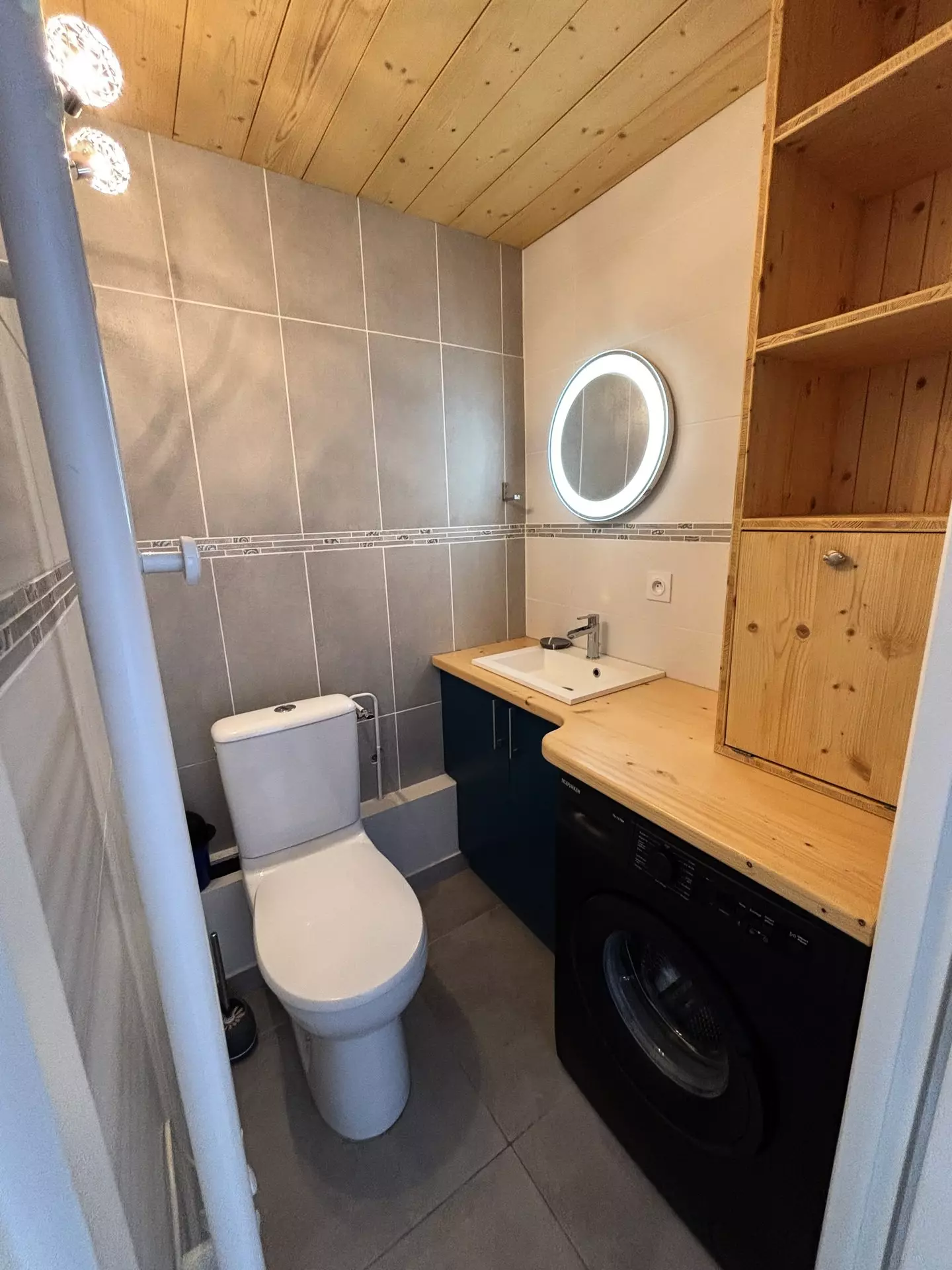 Bathroom (Level 1): sink, shower, hairdryer and integrated toilet.