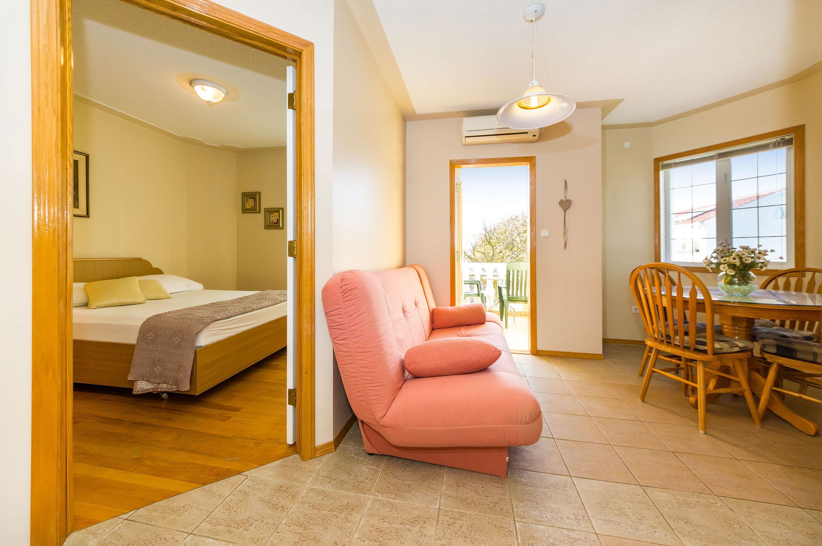 The spacious and pleasantly decorated apartment Mareo 3 is ideal for a relaxing holiday for a maximum of two people. It is 30 m2 in size, air-conditioned and offers one bedroom with a double bed, a living room, an equipped kitchen and a dining area. There is also 1 bathroom with a shower. The balcony offers a beautiful view of the sea, perfect for morning coffee or evening enjoyment of the sunset.