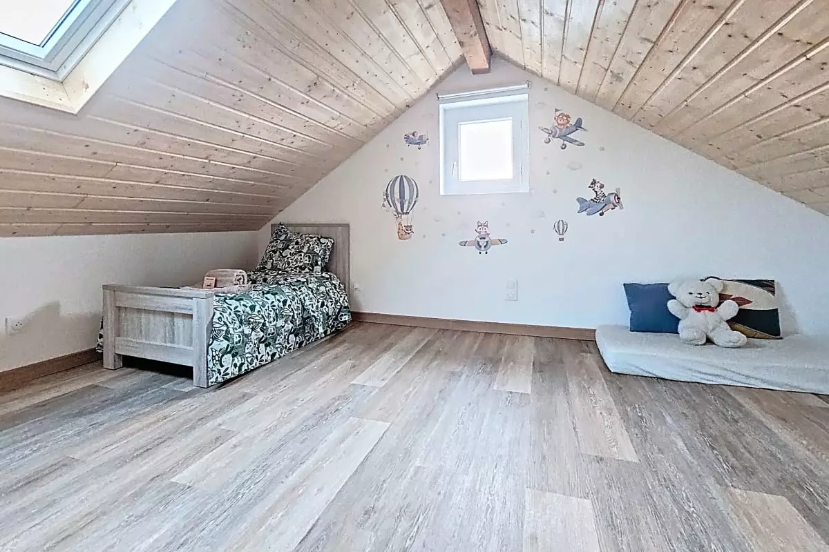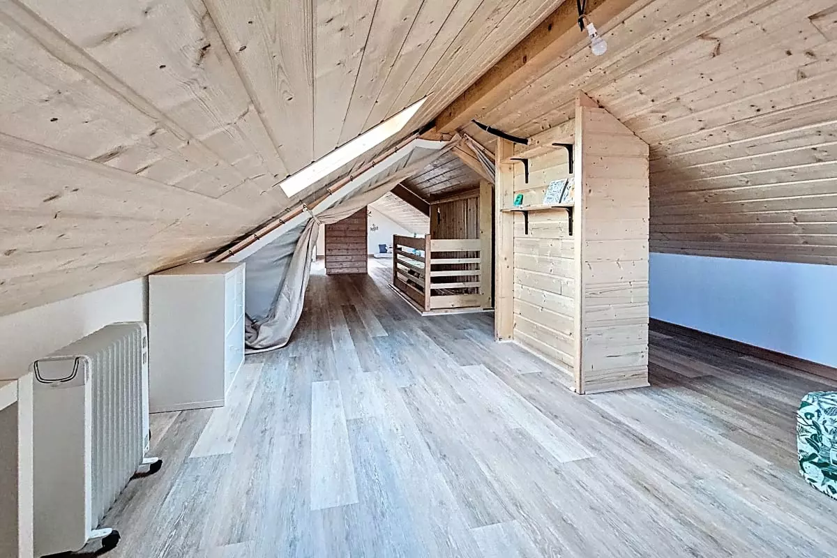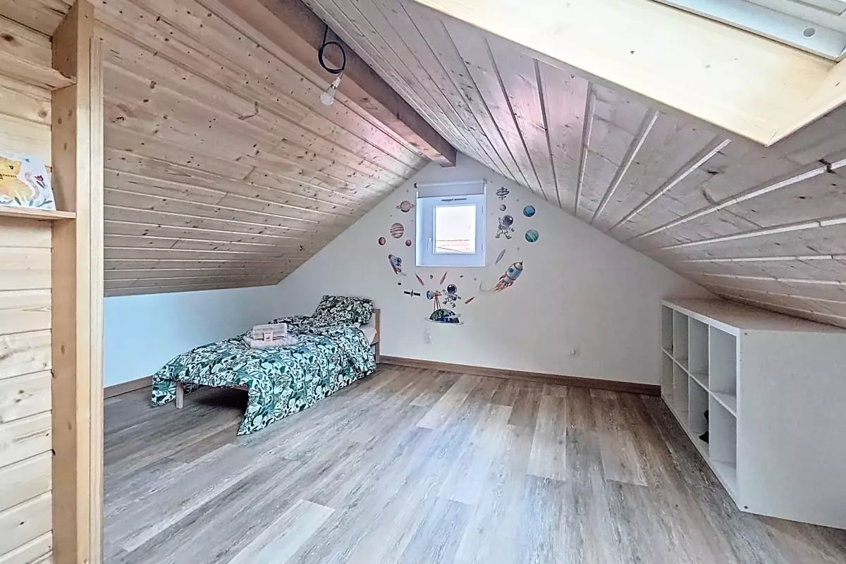 - a fourth large attic bedroom with a 70x160 child's bed and a 70x140 child's bed. The room can be divided into two spaces with a blackout curtain.