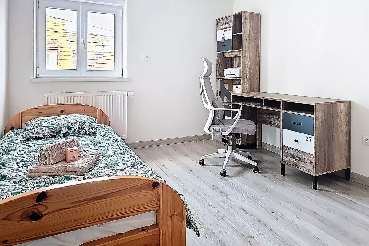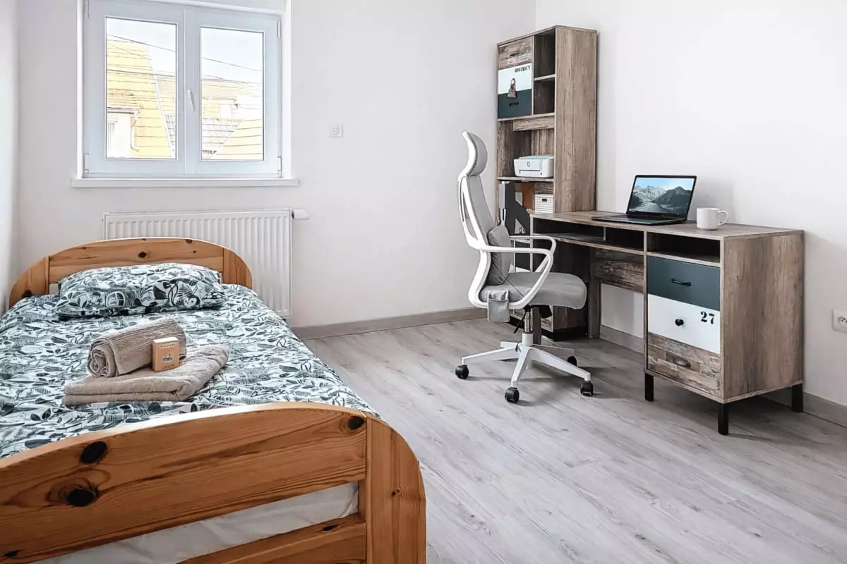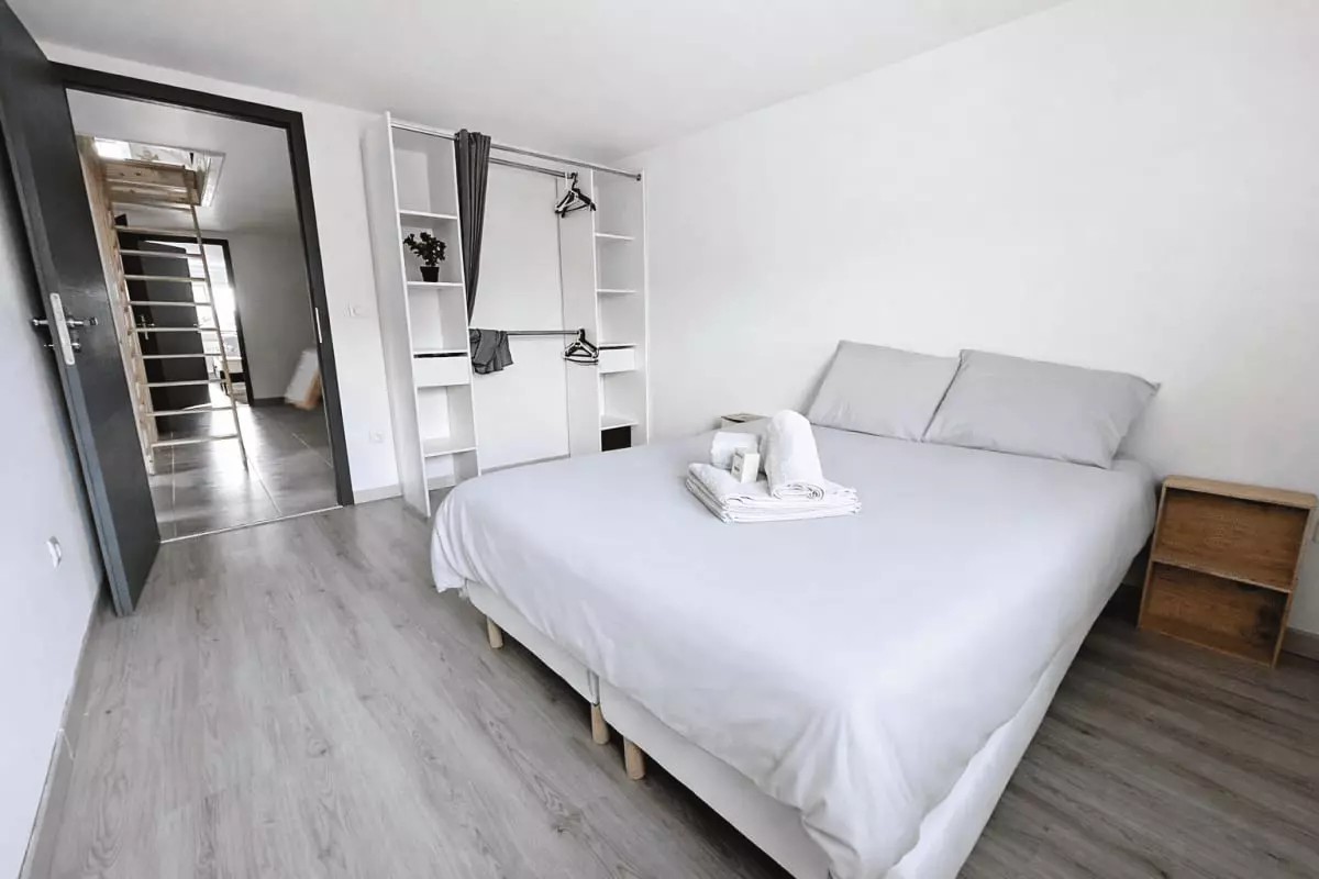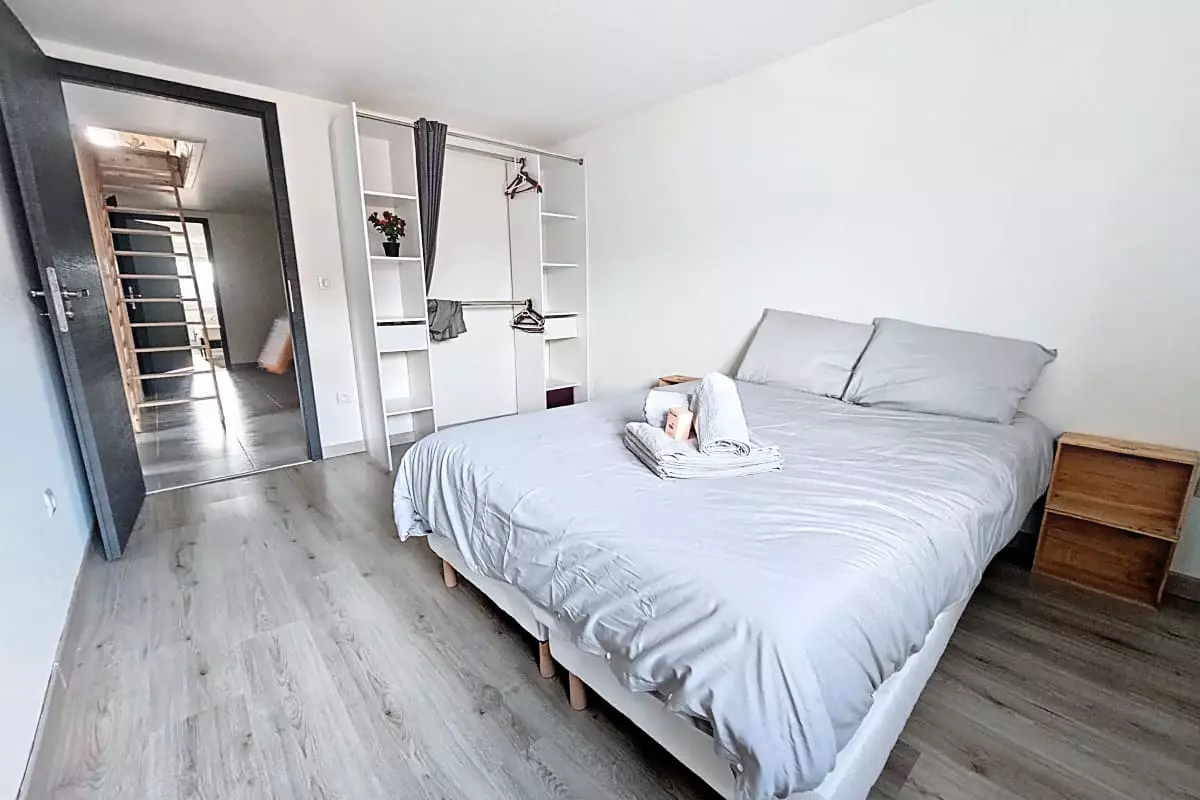 - a fourth large attic bedroom with a 70x160 child's bed and a 70x140 child's bed. The room can be divided into two spaces with a blackout curtain.