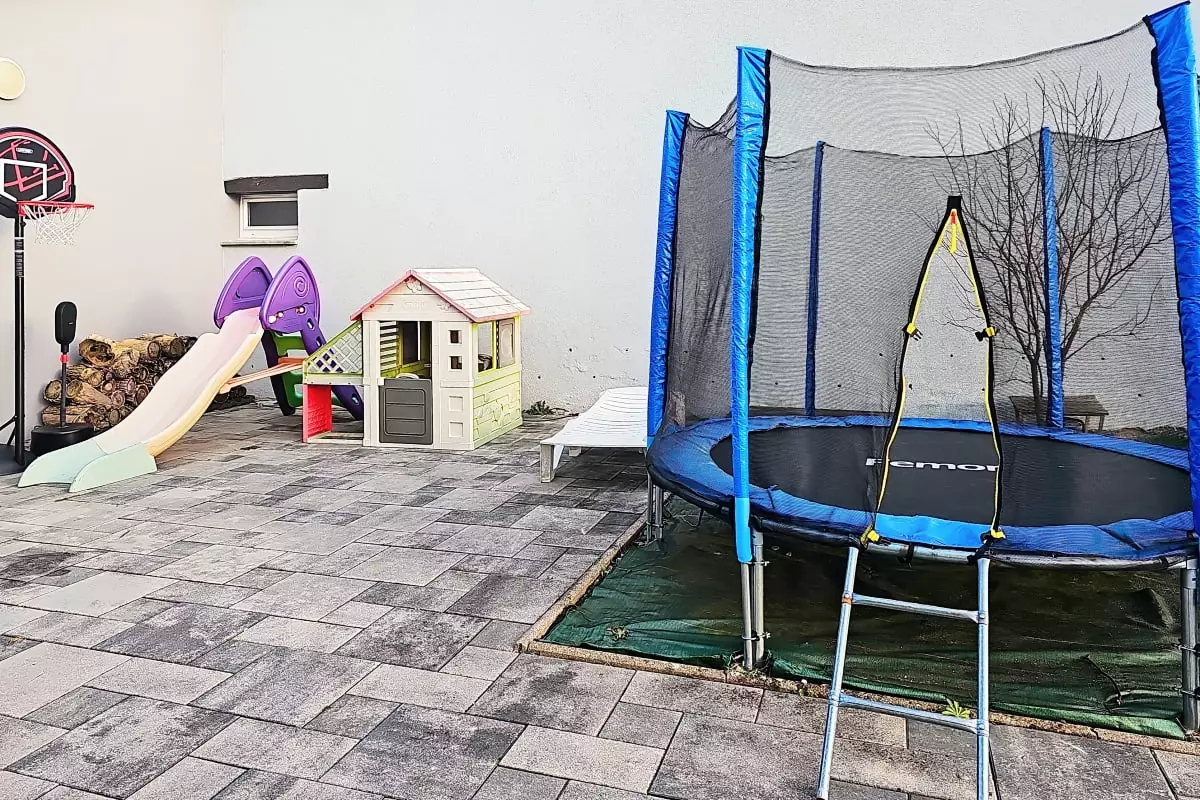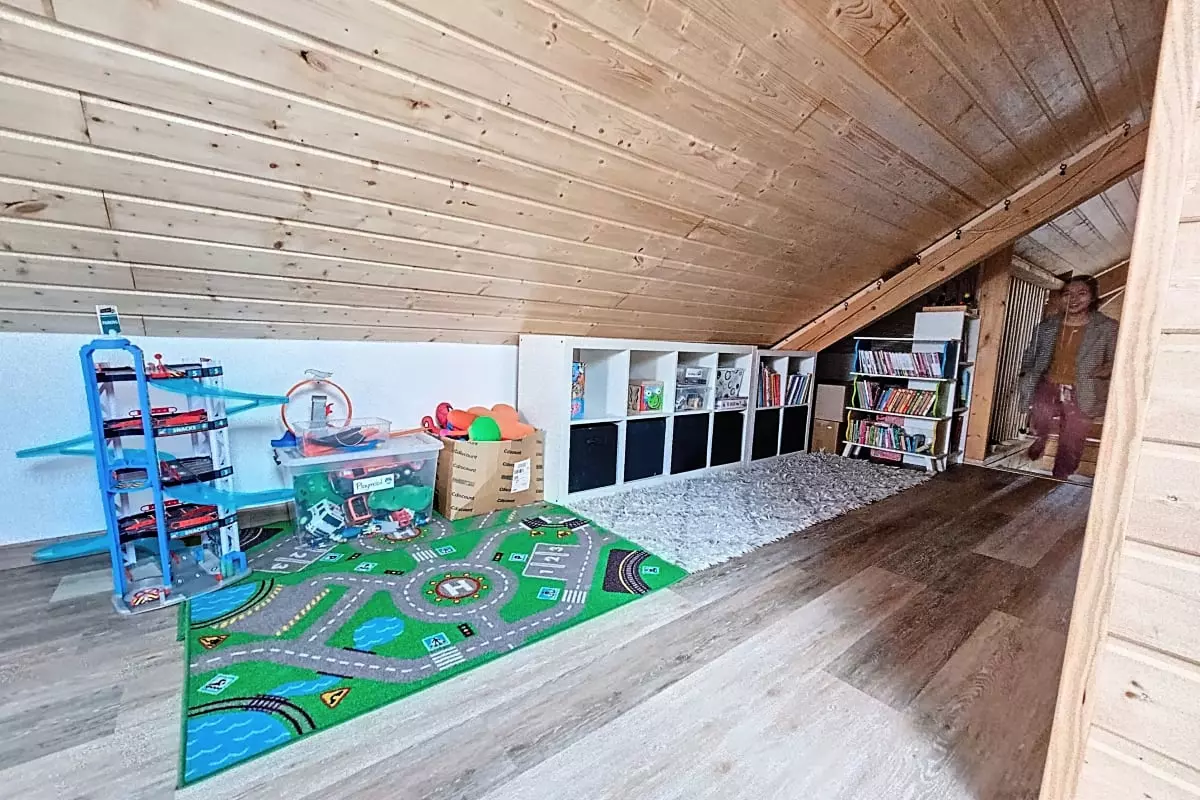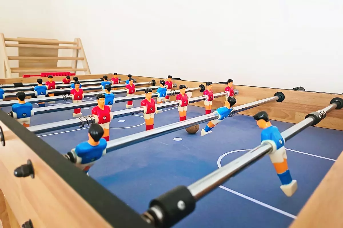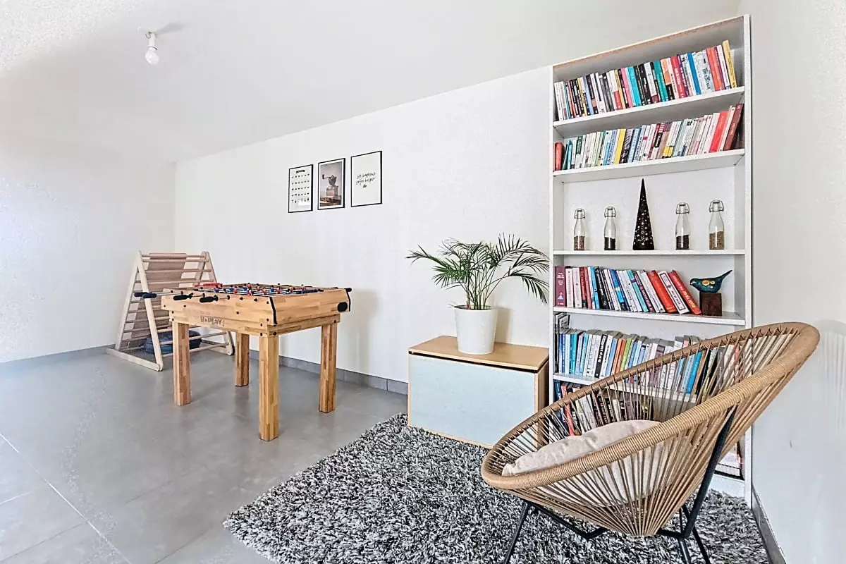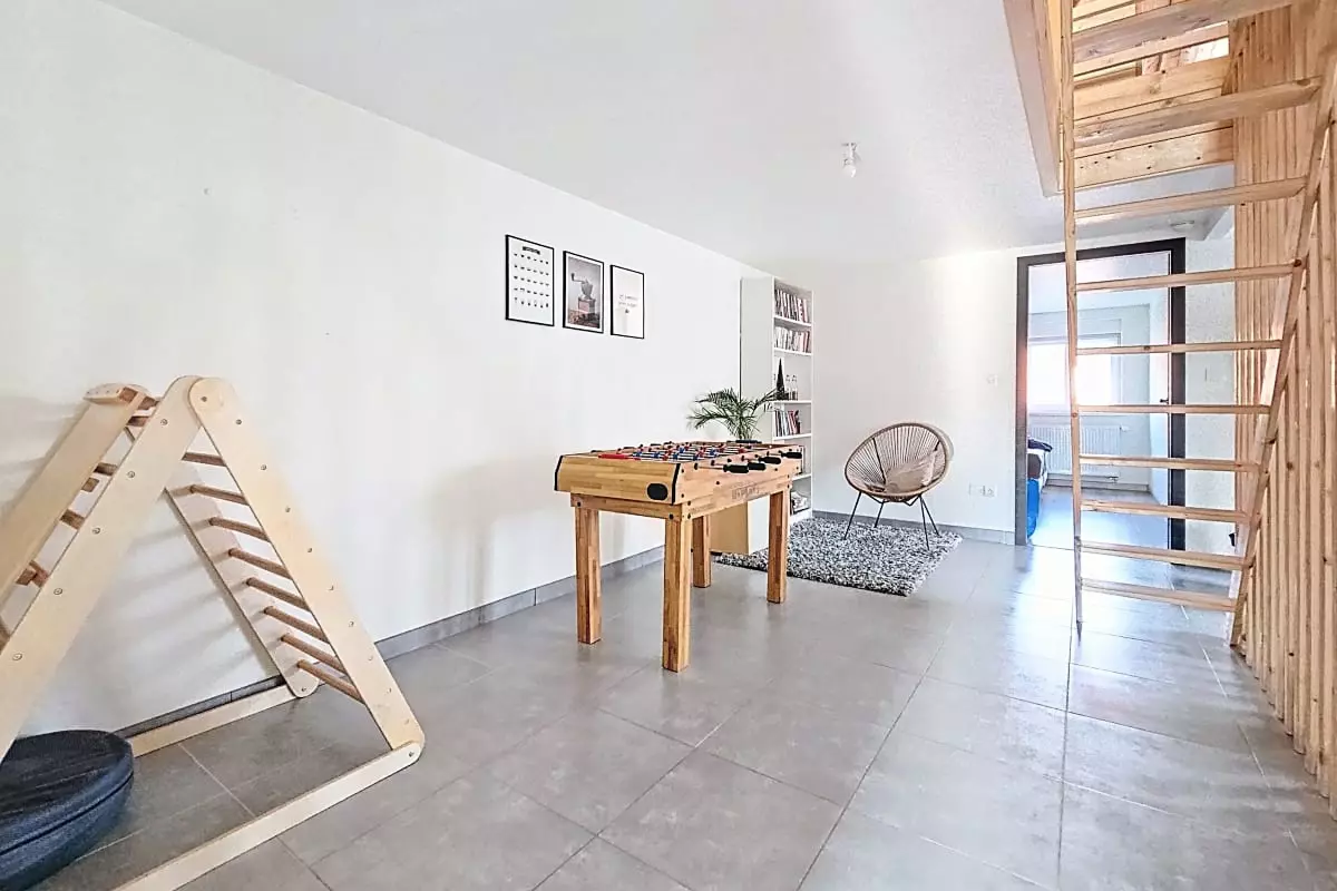 The house comprises 3 floors, each with its own atmosphere: a minimalist living room, a spacious relaxation area with a foosball table on the 1st floor, and a children's paradise on the 2nd floor.