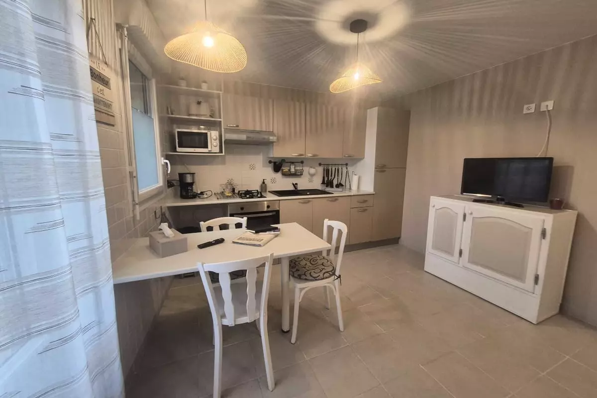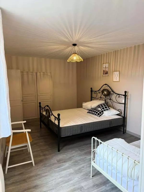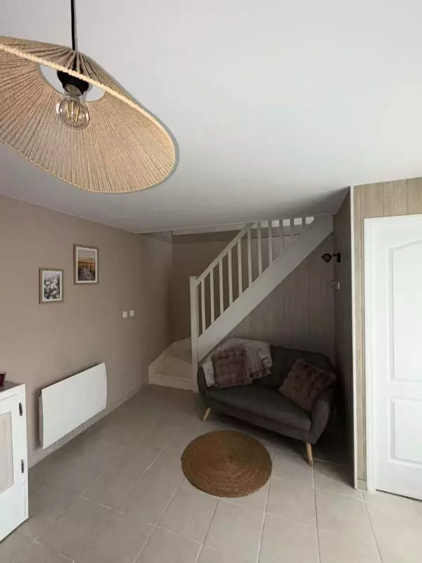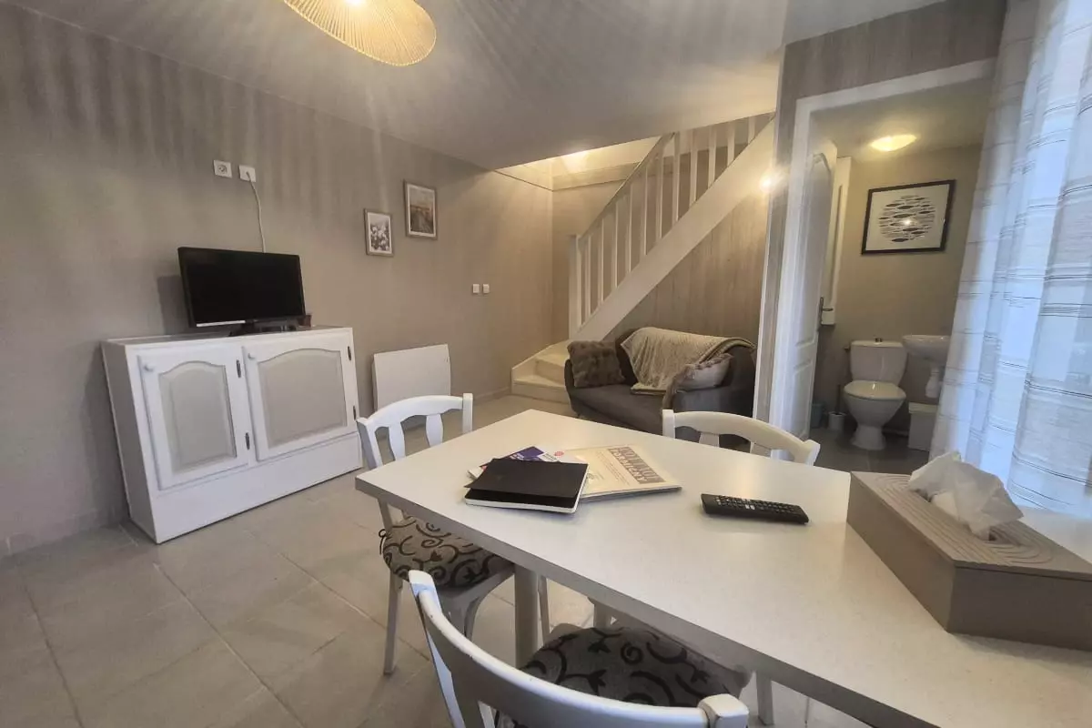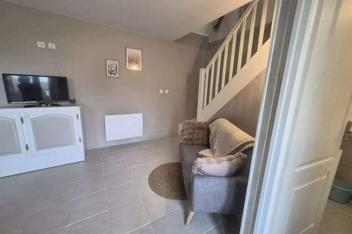 One of the house's strengths is its practicality. You'll appreciate the cozy interior. On the ground floor, you'll find a fully equipped open-plan kitchen (oven, microwave, dishwasher), a living/dining room with a sofa and flat-screen TV, as well as a laundry room with a toilet, washing machine, ironing board, and iron. A double bedroom with an en-suite shower room is also located on the ground floor. Upstairs, you'll find a large bedroom furnished with a 160x190cm double bed and an 80x190cm single bed, and a bathroom with a shower, sink, and toilet. You'll enjoy the enclosed courtyard, accessible to all three apartments, which features a barbecue, dining table, and chairs, thanks to its southwest exposure.
