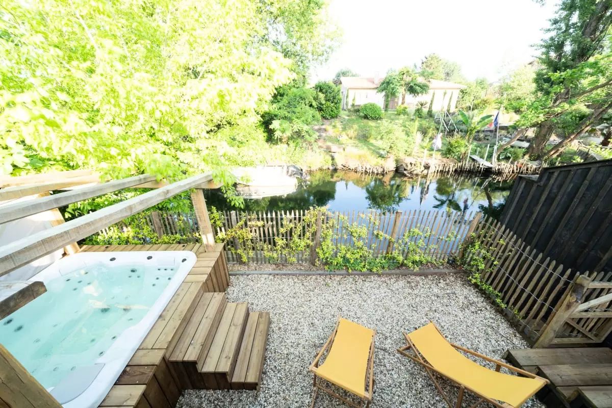 The exterior is the true gem of this property, with its terrace featuring a private spa and a garden equipped with a barbecue for your summer evenings. An exceptional advantage: you enjoy direct access to the canal from the rear terrace, ideal for launching your paddleboard or boat and reaching Lake Cazaux.