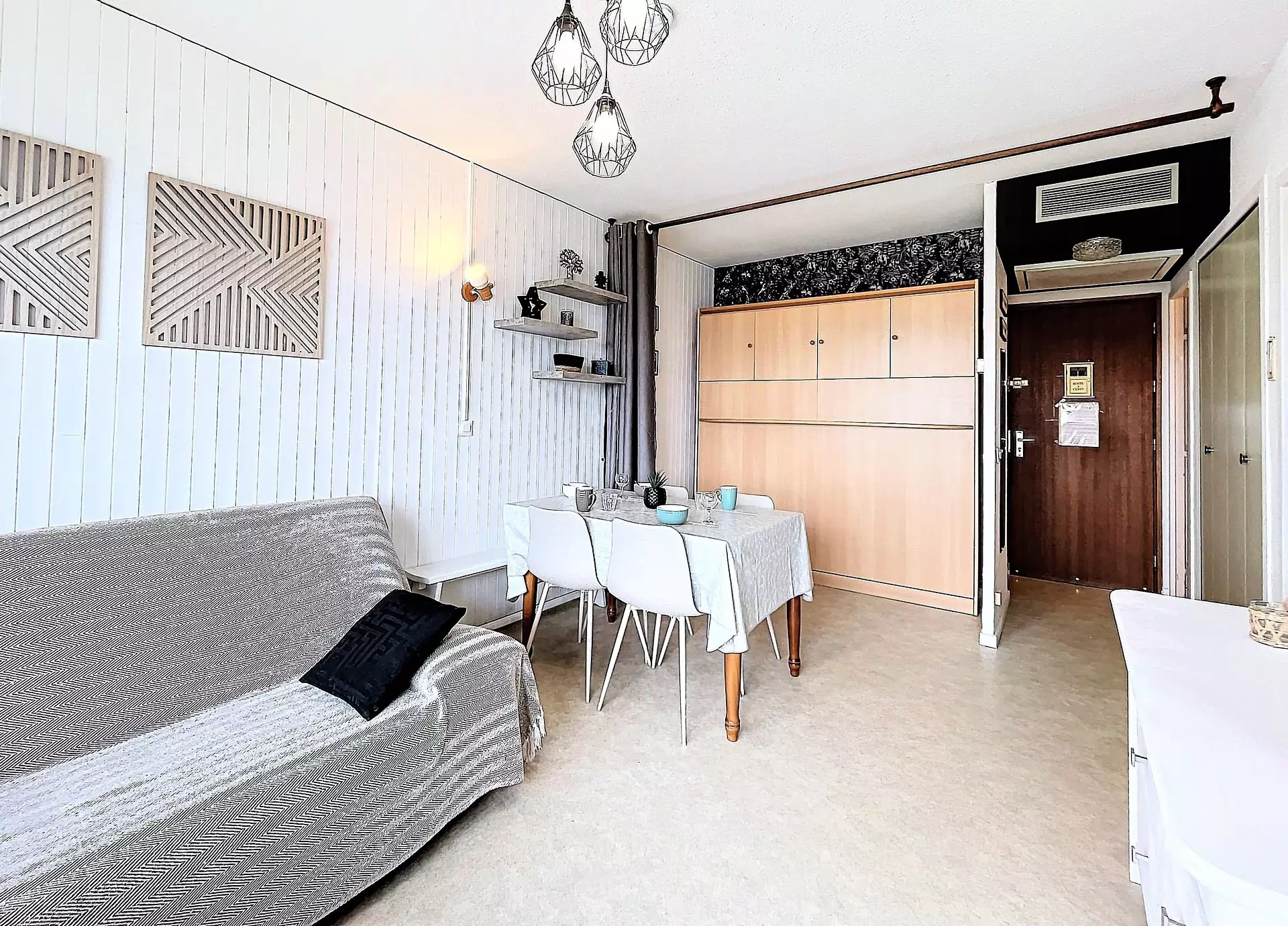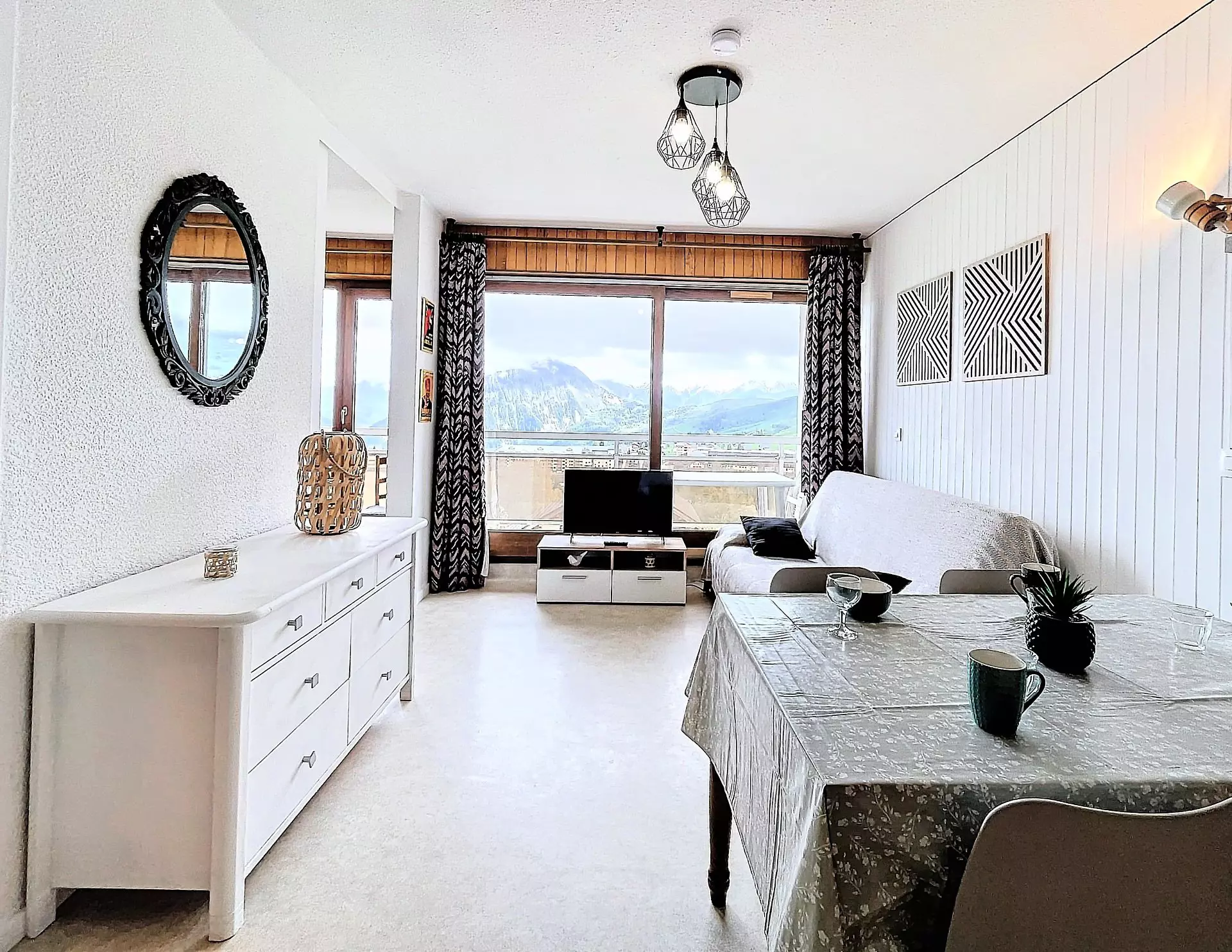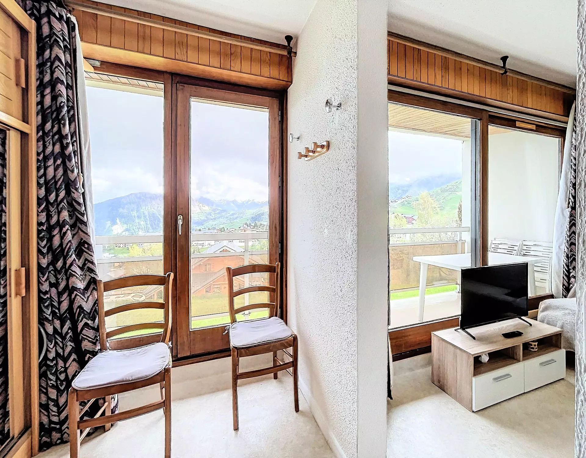 A pleasant and well-decorated living room with warm furnishings, including a 130x190cm sofa bed for one person, a flat-screen TV, and a comfortable 140x190cm fold-down bed for two people. The room opens onto a large balcony with a table and chairs, offering stunning views of the La Toussuire resort.