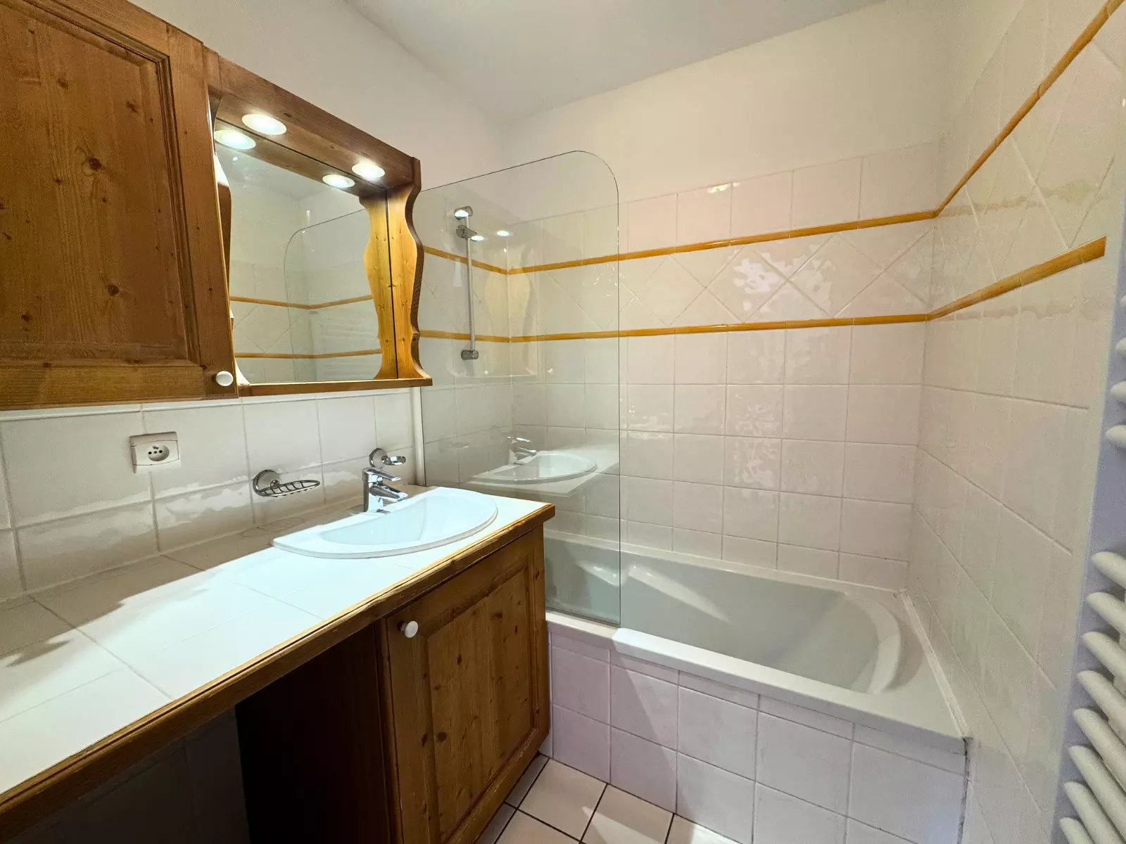 Bathroom: sink, bathtub, towel warmer.