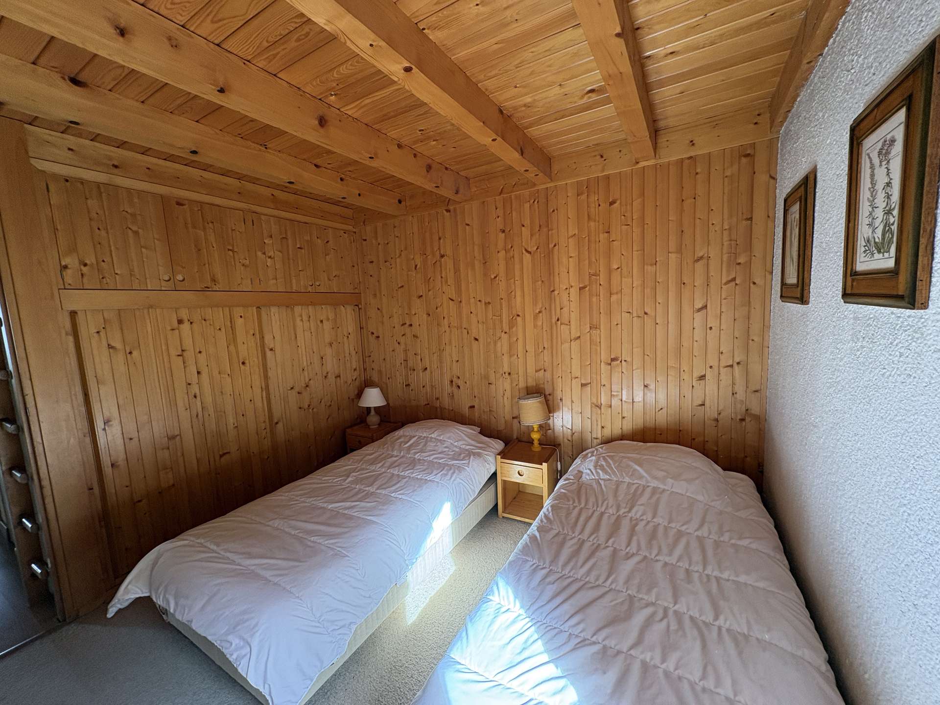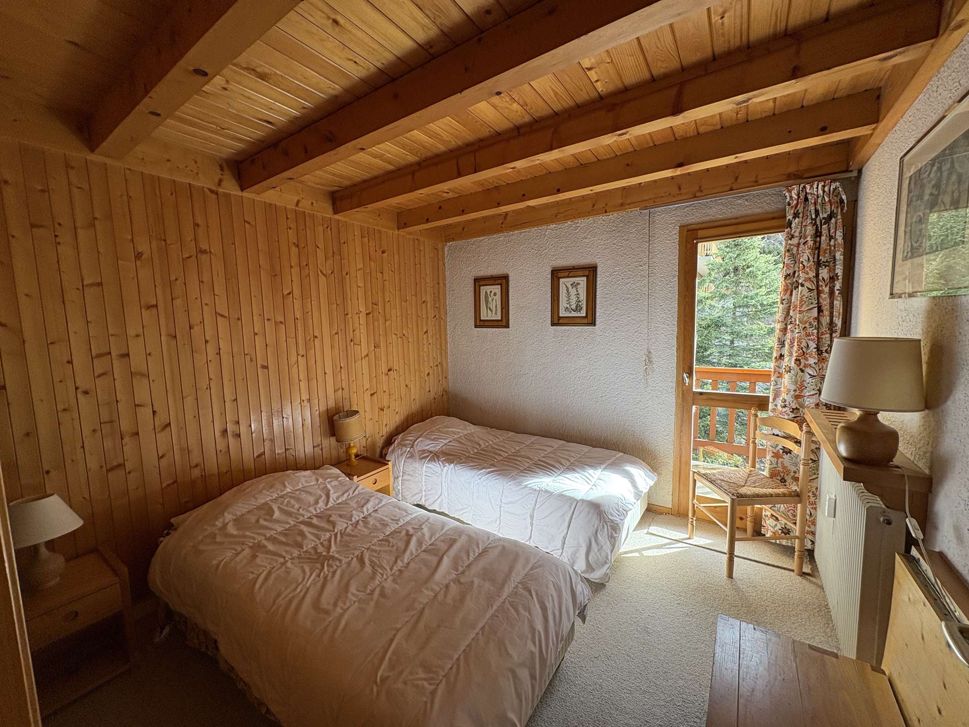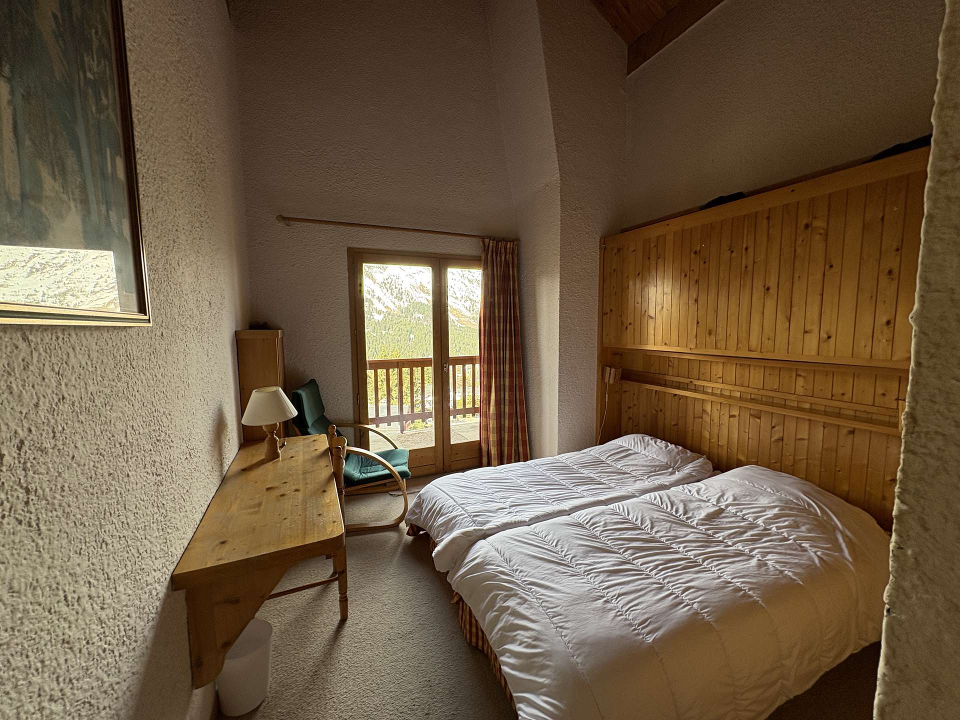 This three-room apartment in the mountains located on the upper ground floor includes a living room with TV lounge (west balcony) with an alcove with 1 single bed, an equipped kitchen, a bedroom with 1 double bed (140) with bathroom and toilet , a second bedroom with 1 double bed (140) with dressing room, shower room and toilet, 1 additional toilet with sink, 2 ski lockers (n° B2 and B3, entrance level).