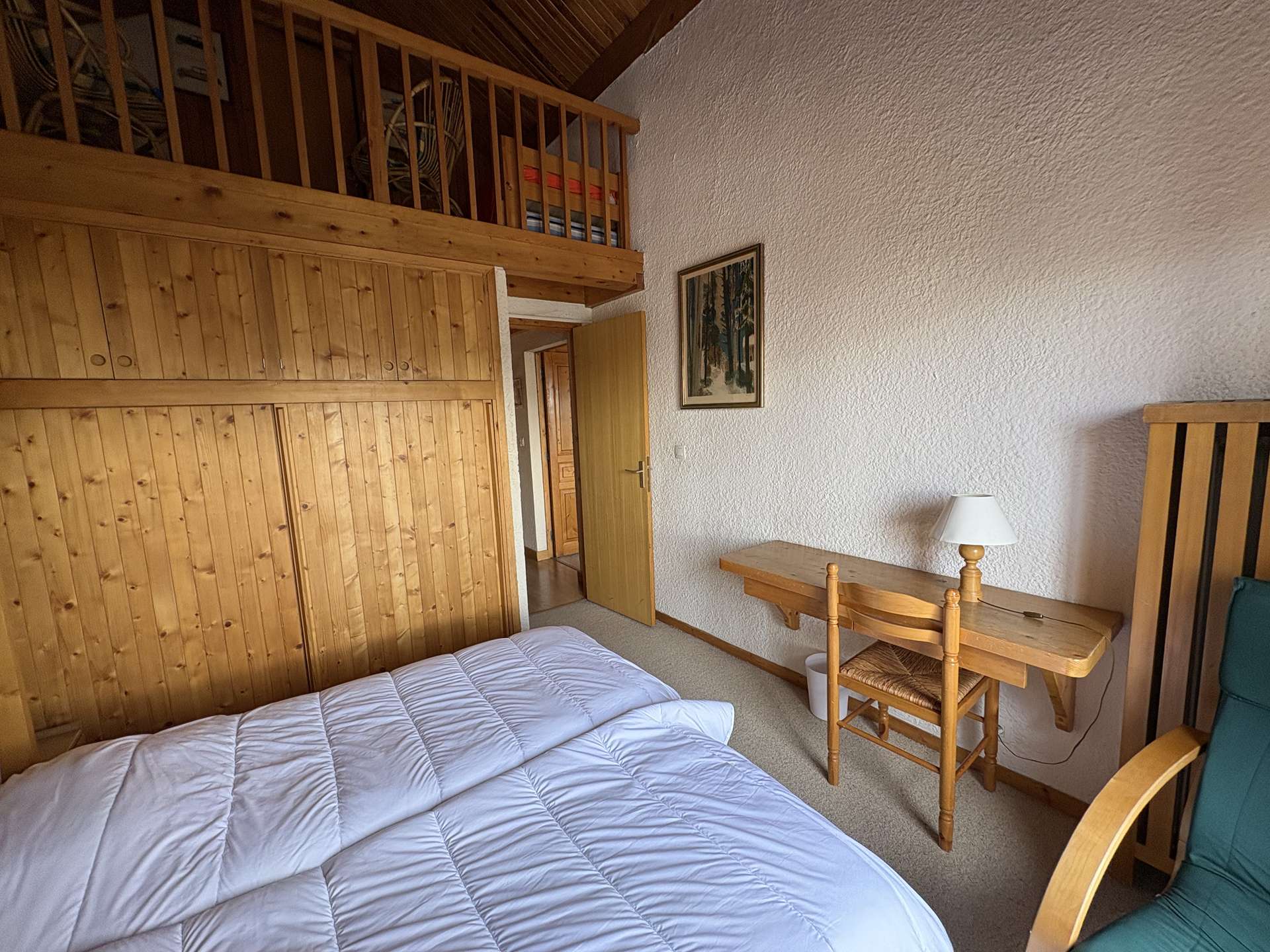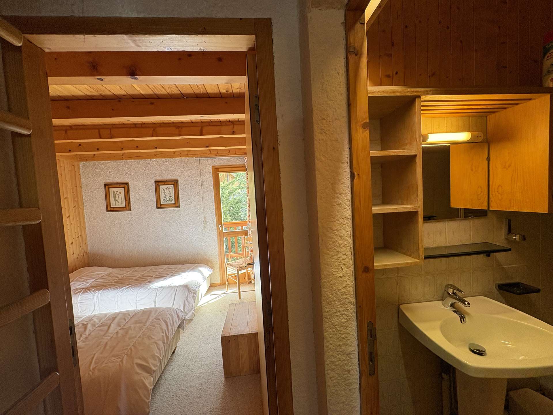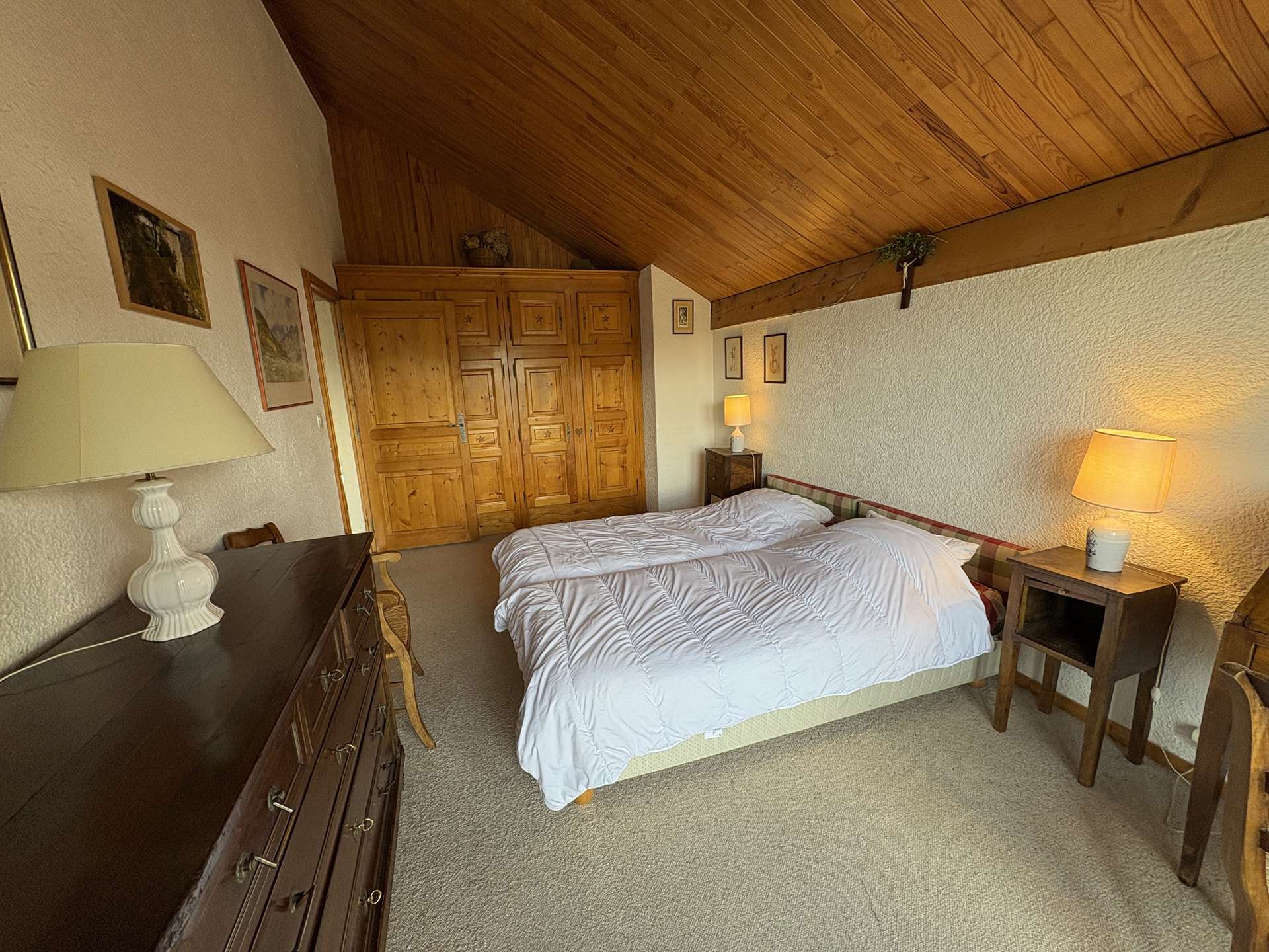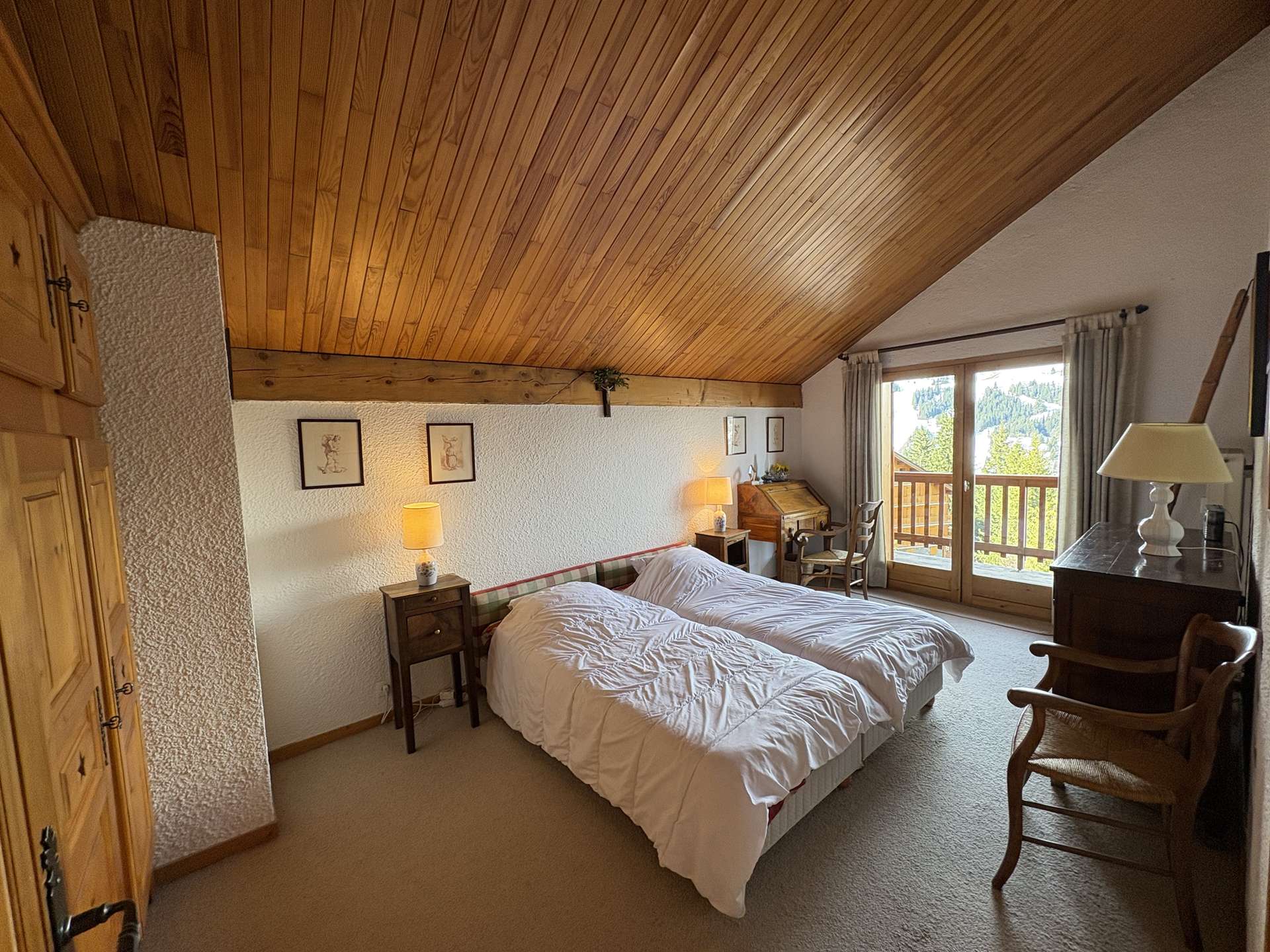 This three-room apartment in the mountains located on the upper ground floor includes a living room with TV lounge (west balcony) with an alcove with 1 single bed, an equipped kitchen, a bedroom with 1 double bed (140) with bathroom and toilet , a second bedroom with 1 double bed (140) with dressing room, shower room and toilet, 1 additional toilet with sink, 2 ski lockers (n° B2 and B3, entrance level).