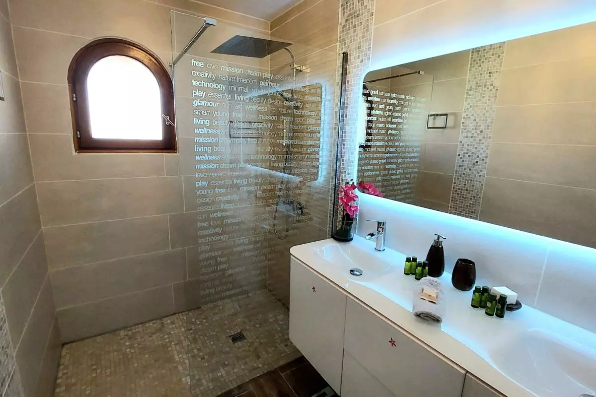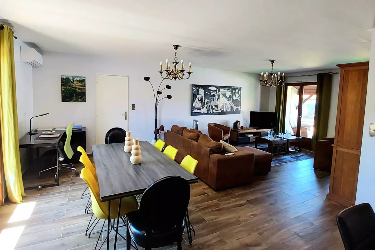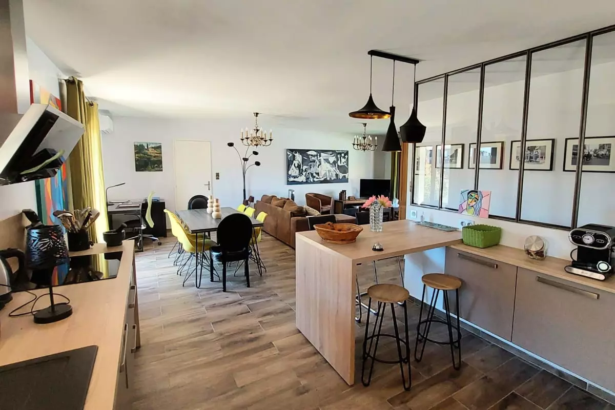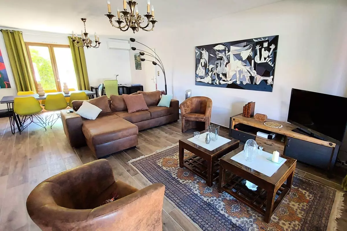It consists of a large living area, a modern fully equipped open kitchen, 3 bedrooms with 2 double beds and 1 sofa bed, a shower room, a bathroom and a laundry room.