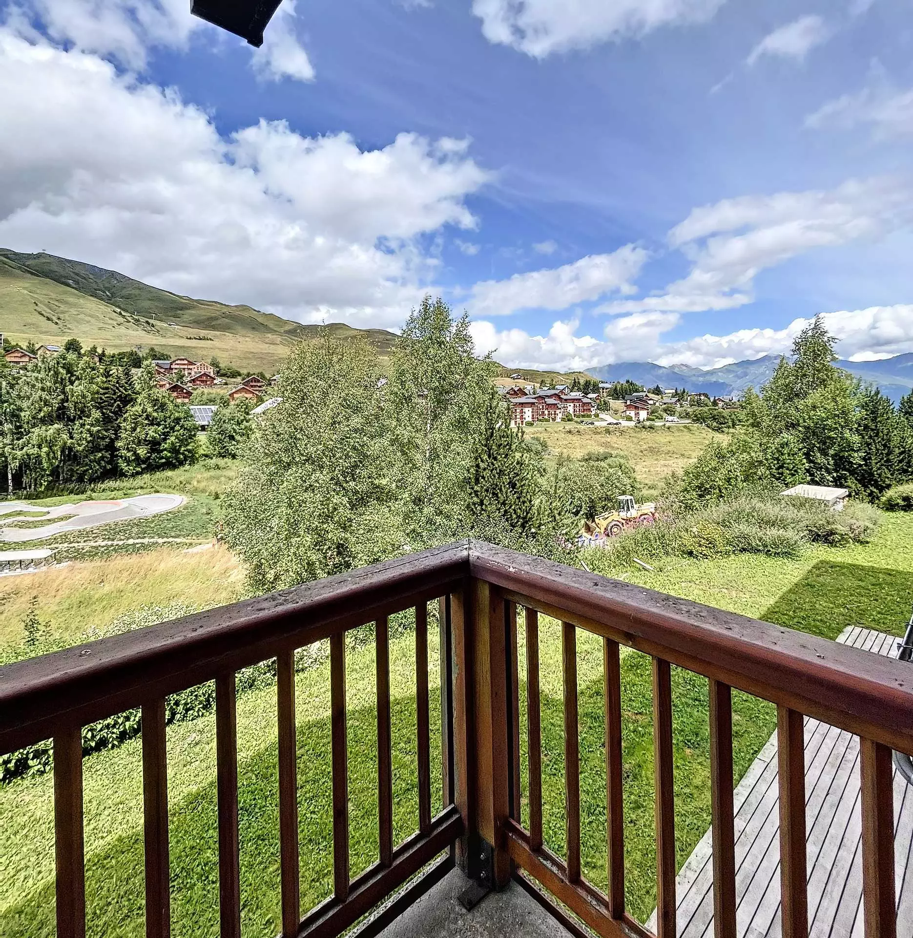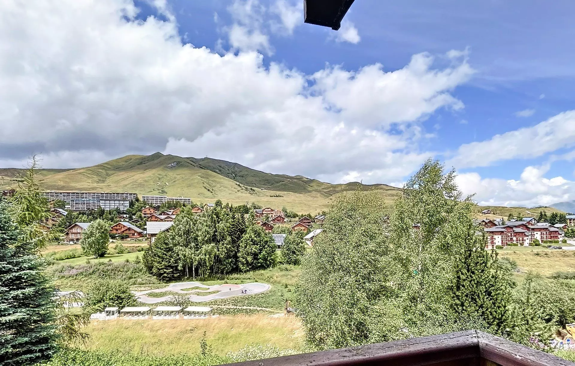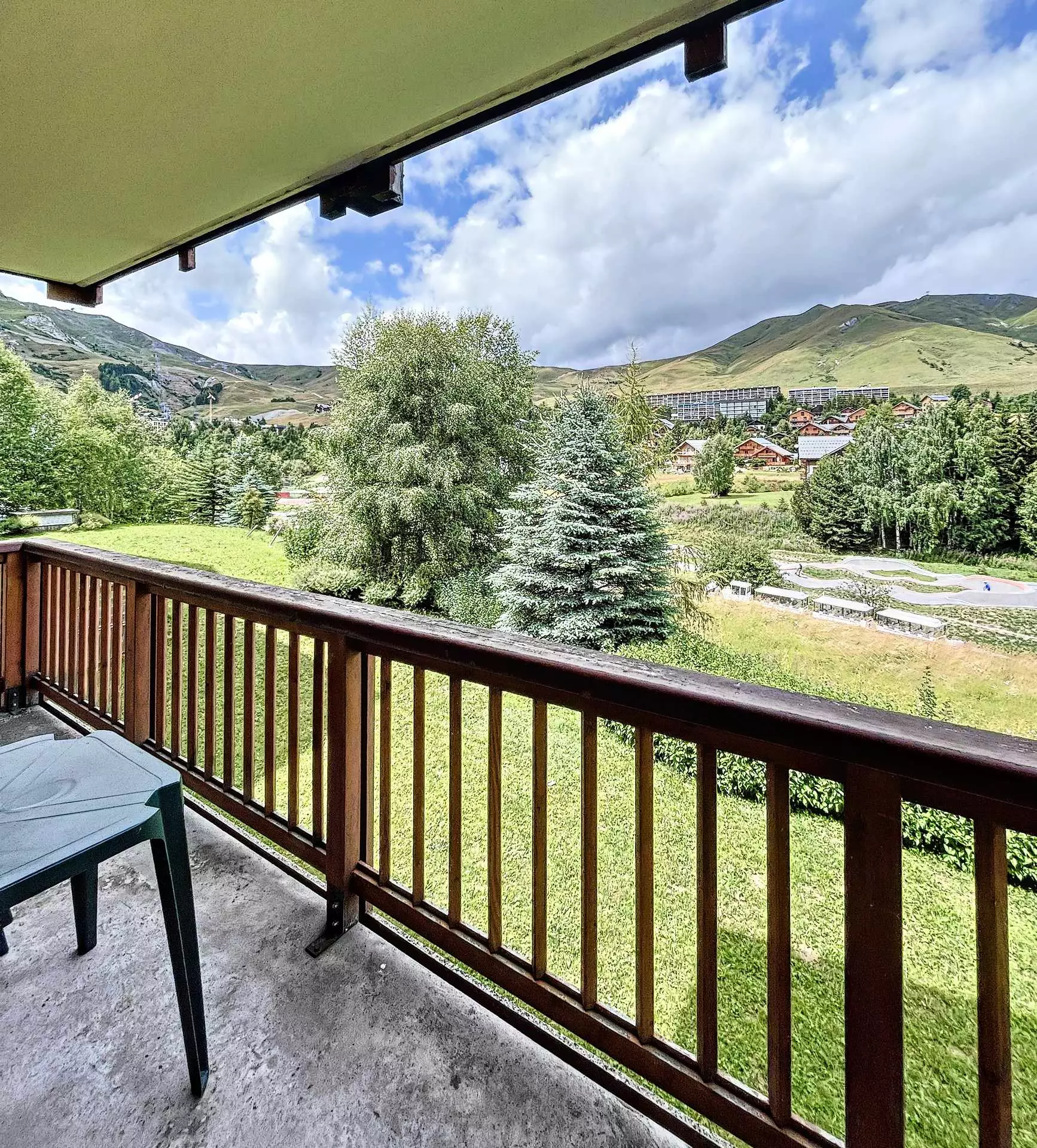 Apartment currently being renovated (furniture + new flooring in spring 2026), with balcony, views of the slopes and the resort, and private covered parking, 150m from the resort centre and 500m from the slopes. Free shuttle bus in front of the residence.
